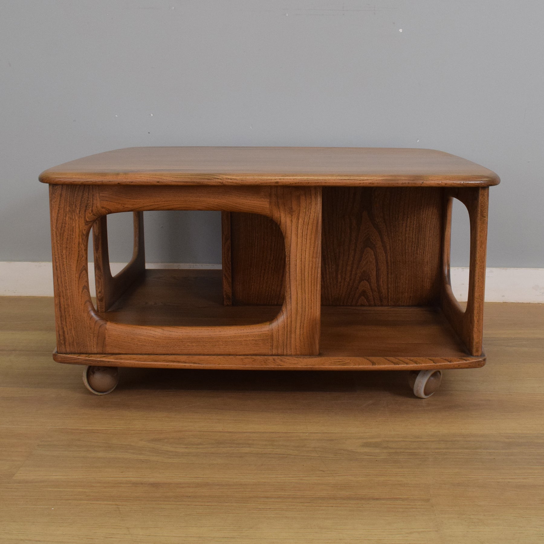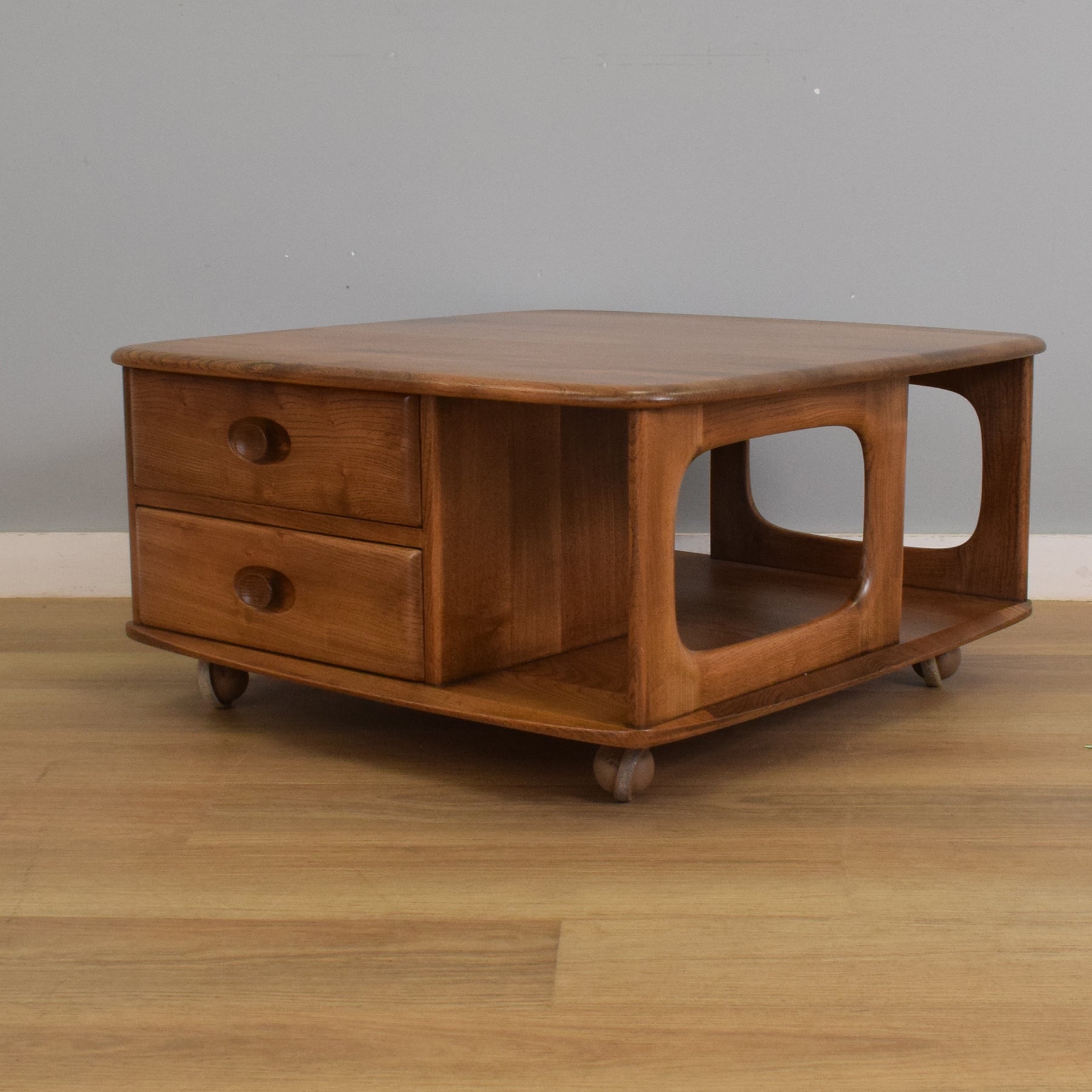 The Ercol 'Pandora' coffee table is a well-known mid-century design, celebrated for its sculptural lines and versatility. Crafted from solid elm, it features two smoothly curved drawers with inset handles and an open shelf for magazines or remote controls. The table sits on discreet ball castors, making it easy to reposition as needed. Its distinctive cut-out sides add a sense of lightness and movement, reflecting Ercol's iconic approach to design.