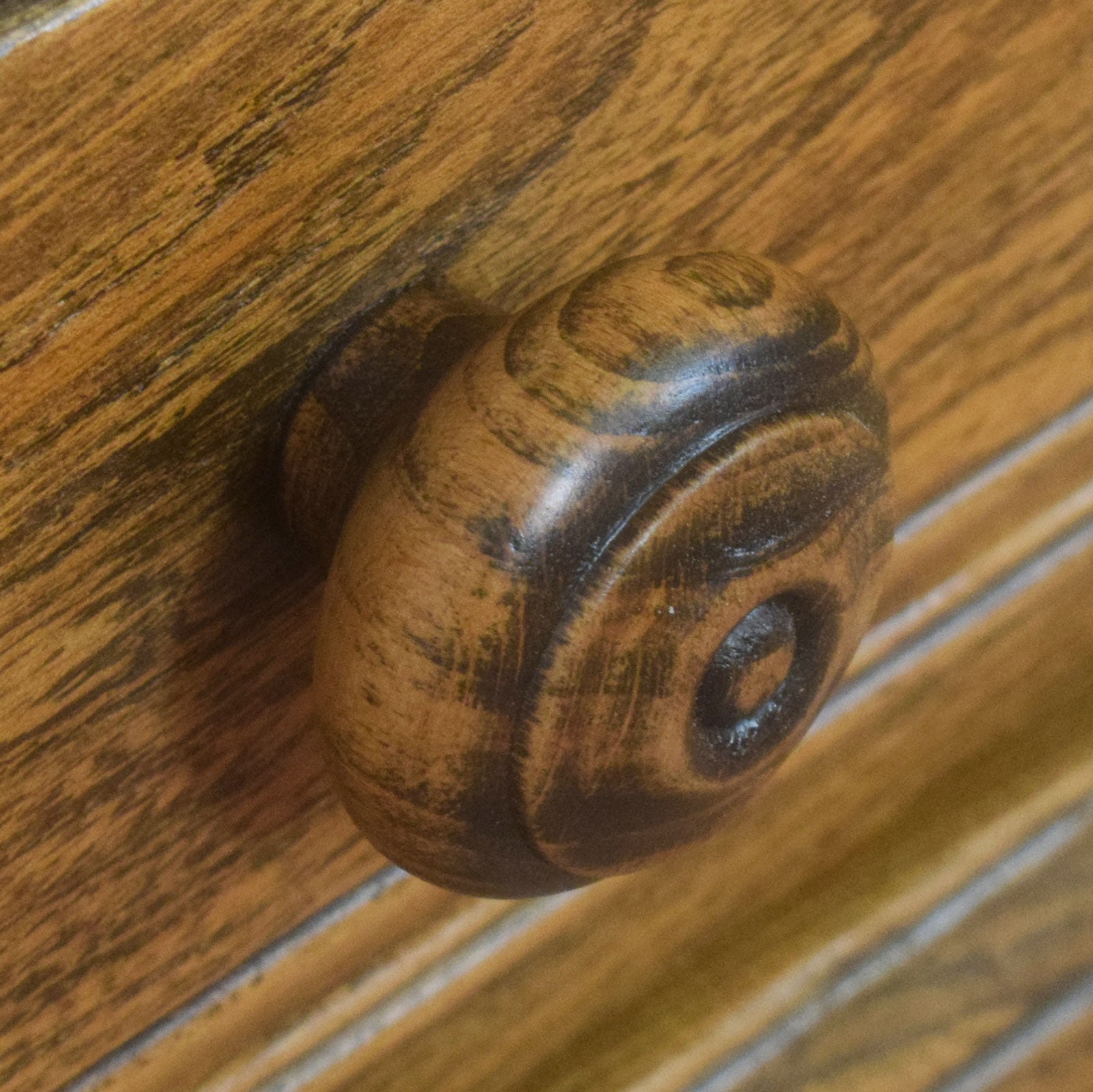 This solid and stylish desk features a gently rounded top with beautifully grained elm, set over twin pedestals, each offering ample storage with three drawers on the left and two on the right, including a deeper bottom drawer for files or larger items. Decorative routed details on the corners and turned front legs enhance its traditional character, while the rear is finished to allow the desk to be placed centrally in a room if required.