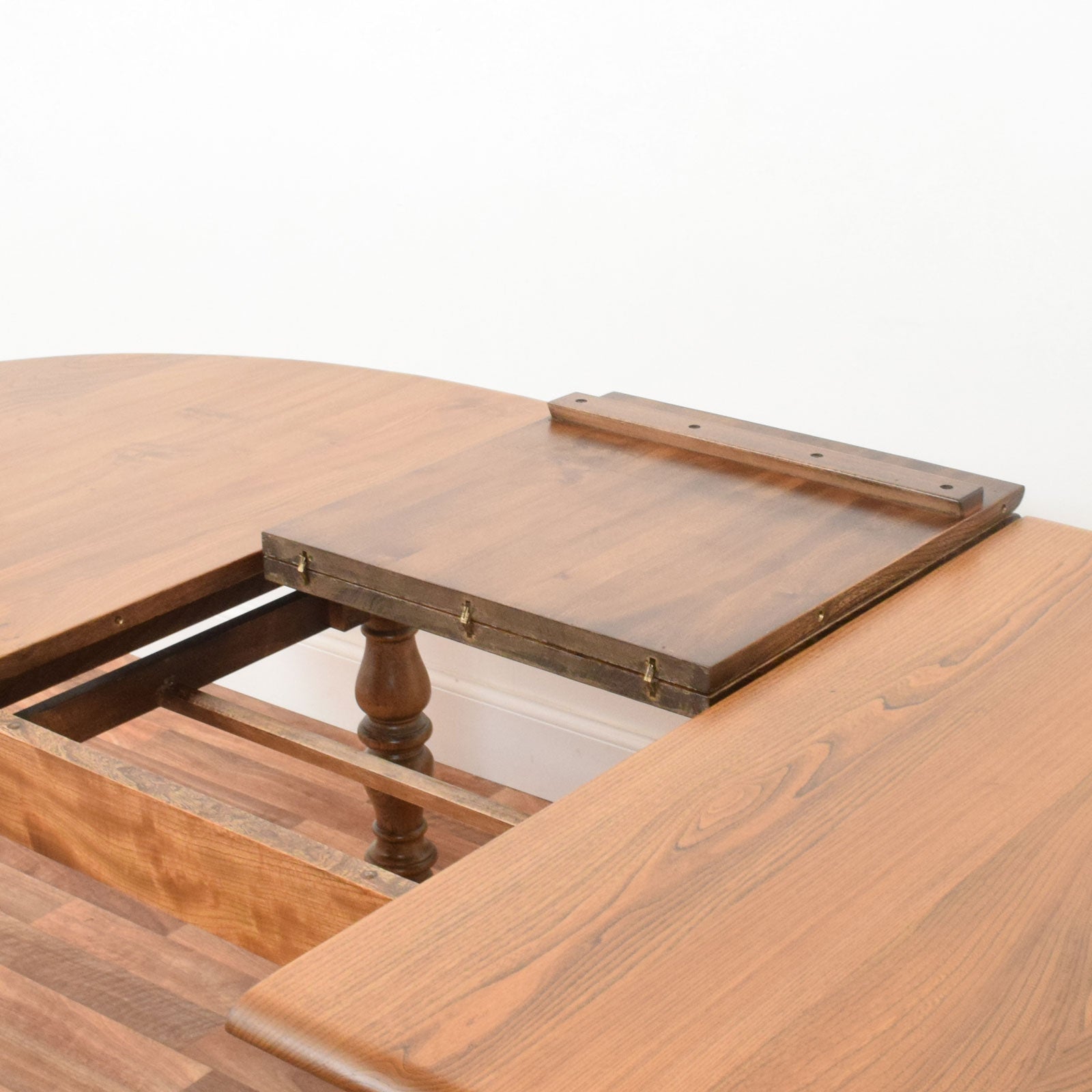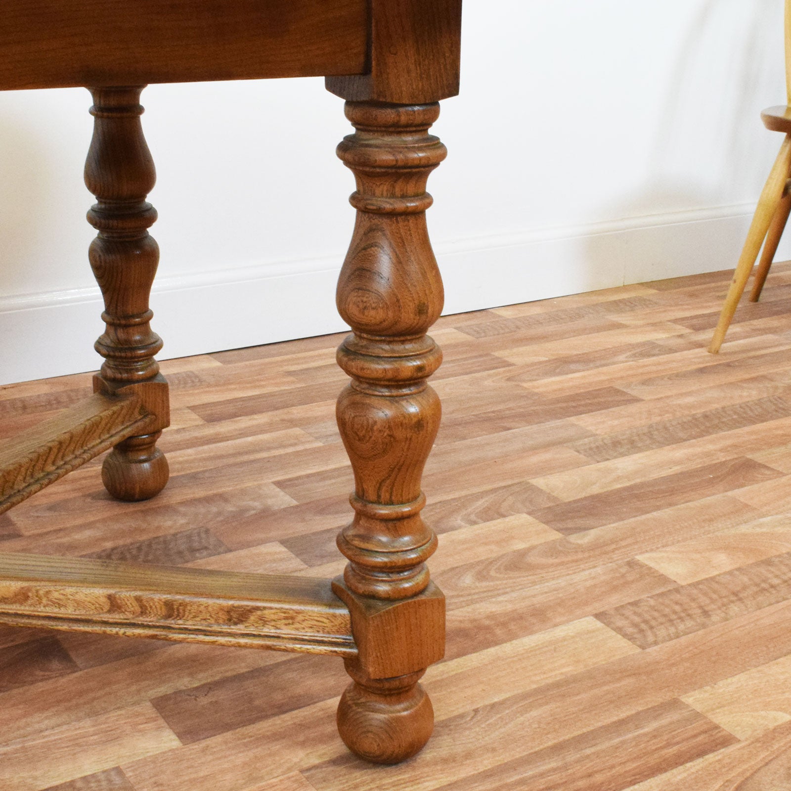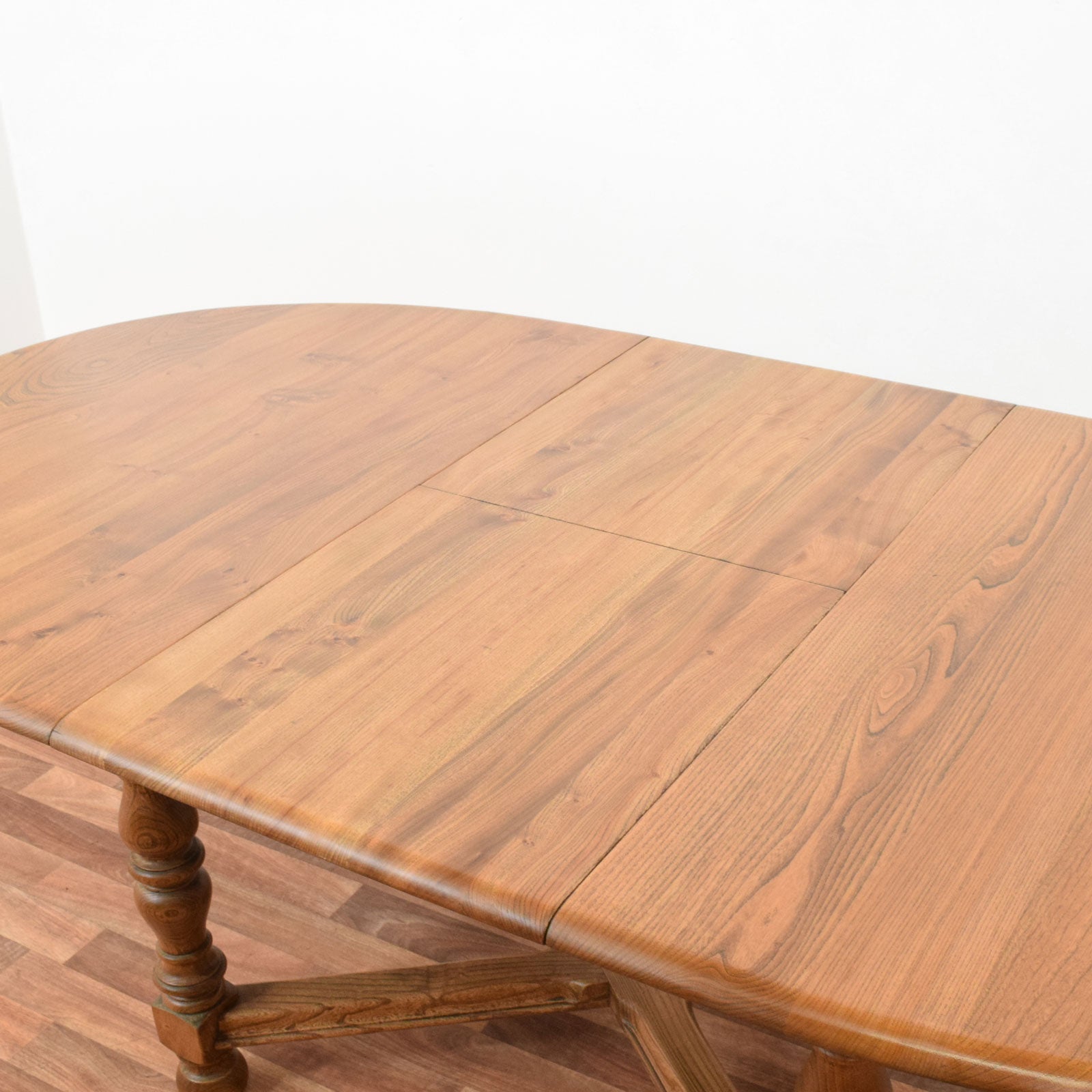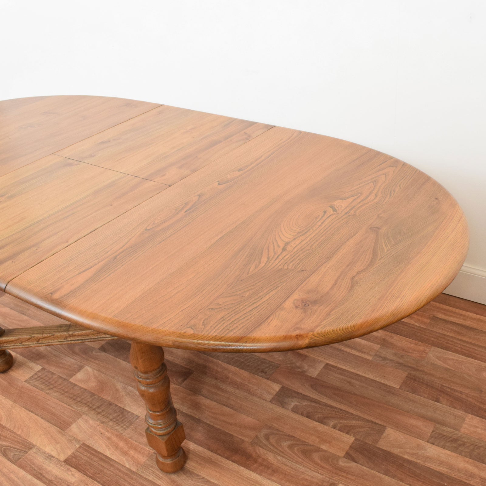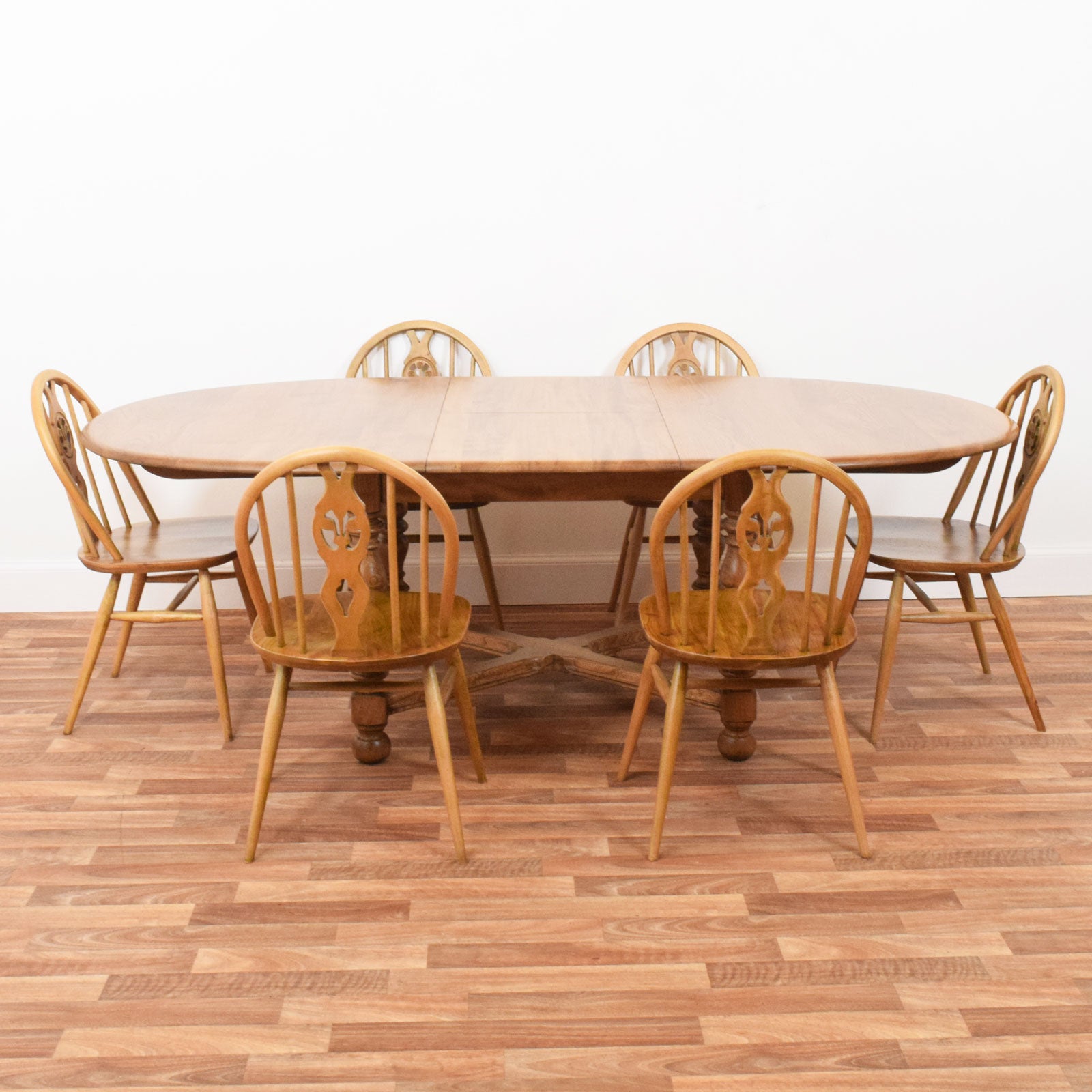 This vintage Ercol dining set includes a classic draw-leaf table and six matching chairs, all crafted in solid elm and beech. The table features a beautifully rounded oval top with two leaves that slide smoothly out to reveal a fold-out central leaf for additional dining space. Supported by four finely turned legs joined by a distinctive cross-stretcher, the base is as attractive as it is stable. The six chairs—each with Ercol’s signature arched backrest and sculpted elm seat—include an elegant central splat with a carved fleur-de-lys motif, combining comfort with craftsmanship.
