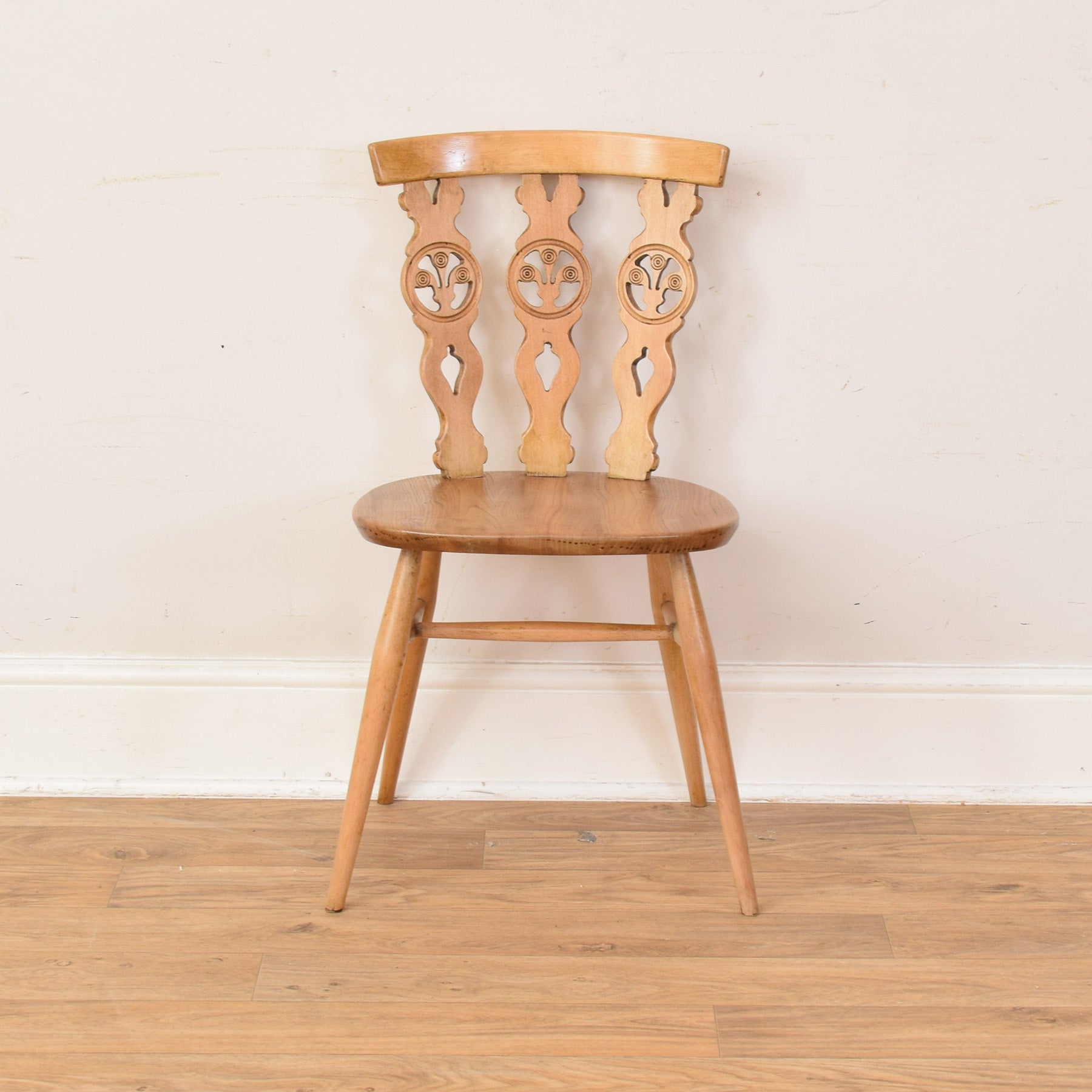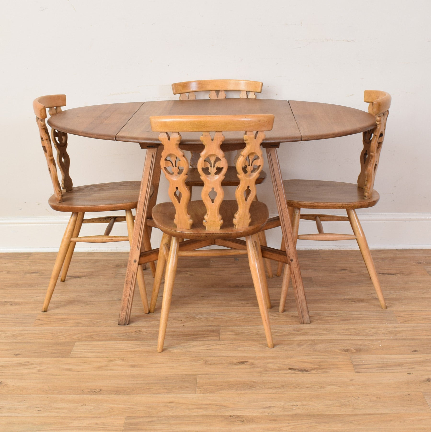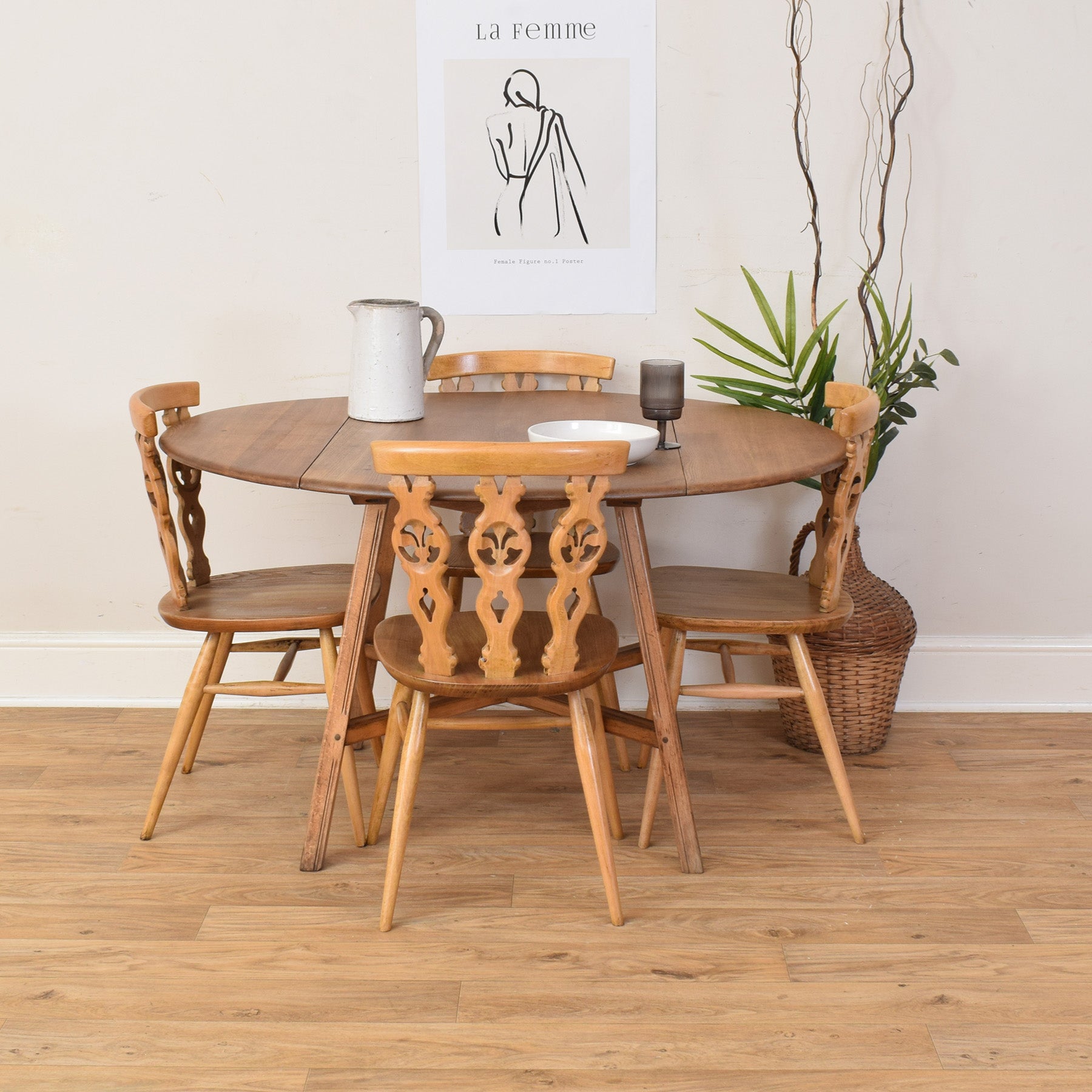 This Ercol drop leaf table and four Fleur de Lys chairs form a practical dining set that suits a kitchen or dining area, offering flexible seating while maintaining a warm, welcoming feel. The drop leaf design allows the table to be easily adjusted, making it suitable for everyday use as well as more sociable occasions.