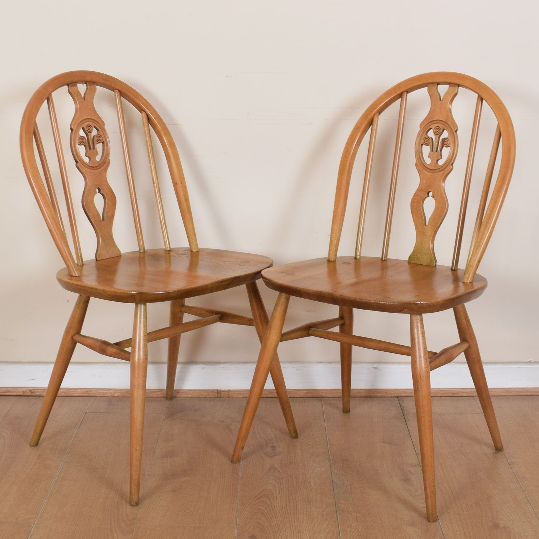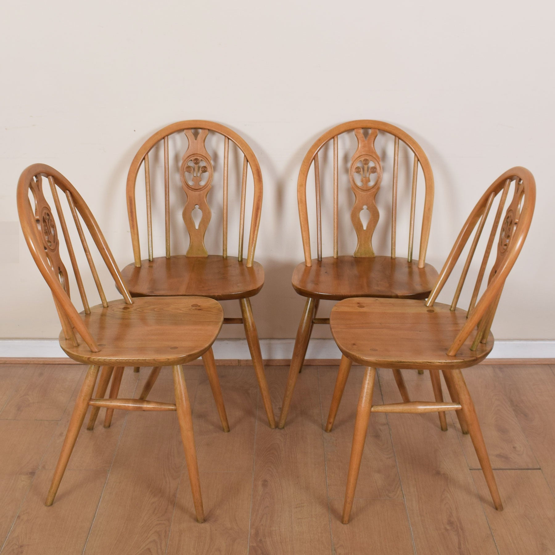 The collection includes an Ercol drop-leaf table accompanied by four Windsor Fleur De Lys chairs, all distinguished by their elegant turned shapes and graceful lines. Ercol is recognised for its ability to merge traditional craftsmanship with contemporary design and for its expert use of solid woods. The drop-leaf table provides practical flexibility, comfortably seating four when fully extended and folding down neatly when space is at a premium. The chairs are designed with the Fleur De Lys splat, a unique feature that enhances the aesthetic without overwhelming the overall design.