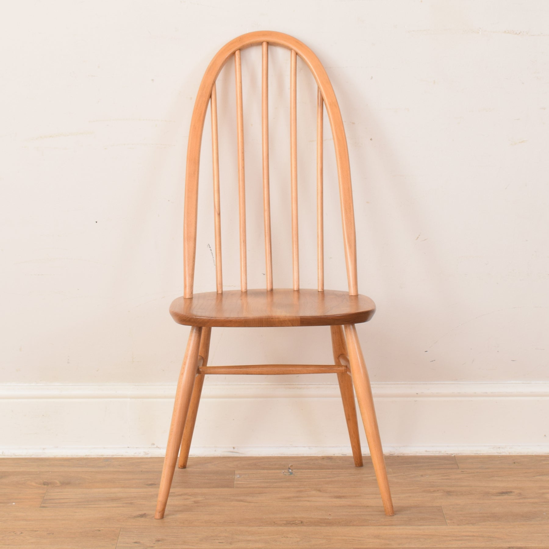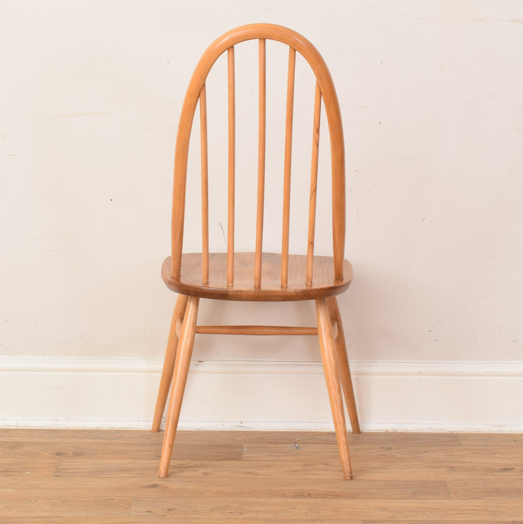 This Ercol dining set includes an oval drop-leaf table and four classic stick-back chairs. The drop-leaf design allows the table to be extended when extra seating is needed or folded neatly to save space, making it especially practical for smaller rooms. The chairs feature supportive high backs and shaped elm seats with beech frames, combining comfort with the durability Ercol is known for.