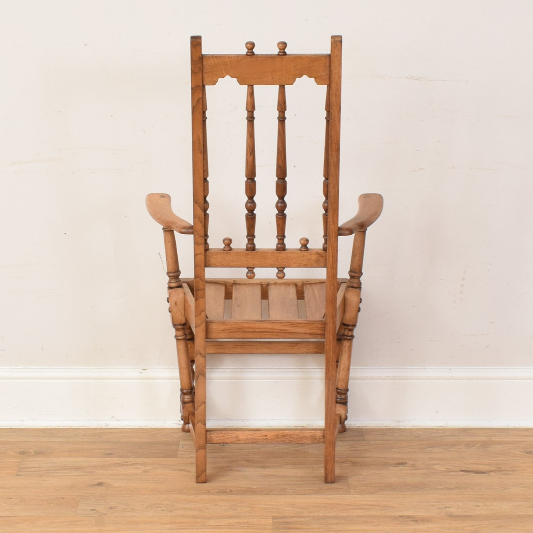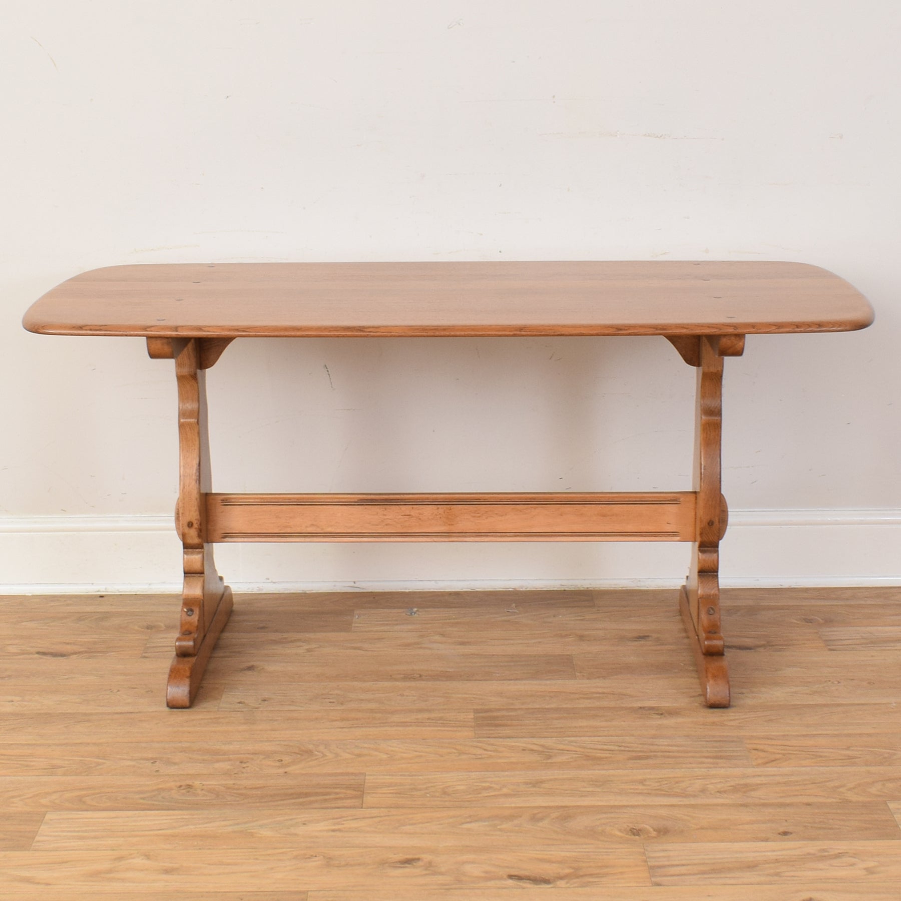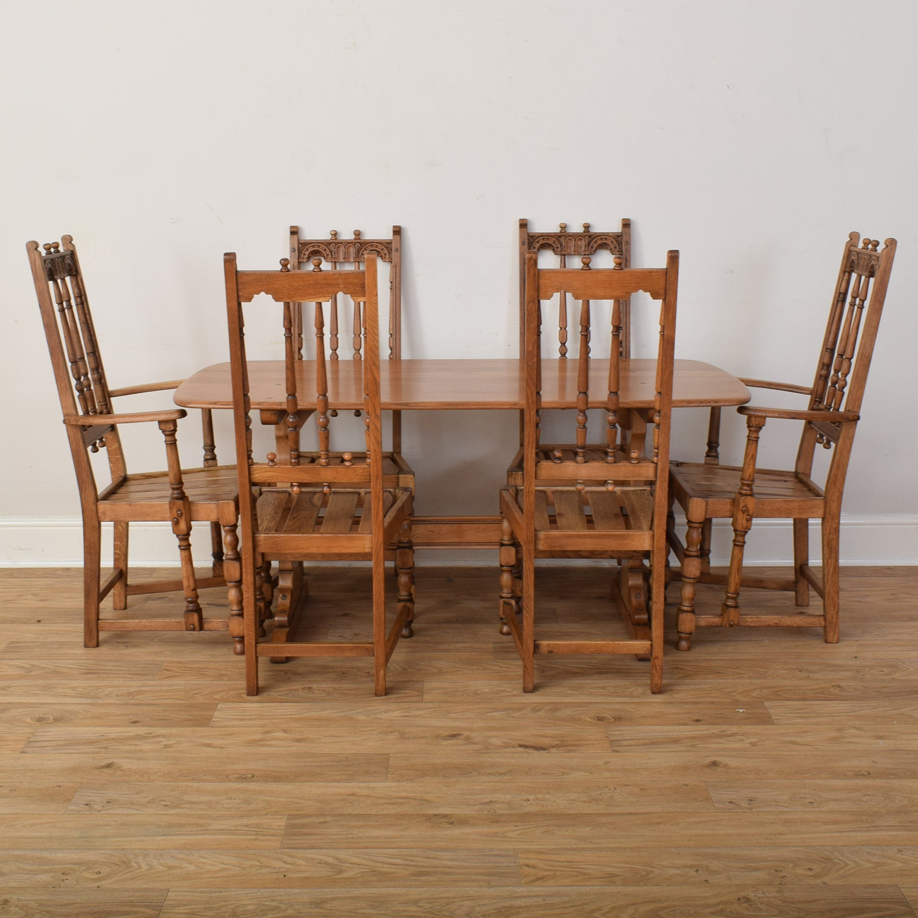 This Ercol dining table and six ‘Old Colonial’ chairs, producing a striking combination of craftsmanship and traditional styling. The table’s soft-edged rectangular top provides generous seating space, while the chairs display classic turned legs, carved back panels, and spindle details that give the set its distinctive character. Two carvers add presence and comfort at the ends of the table, creating a balanced and inviting arrangement suitable for both formal and relaxed settings.