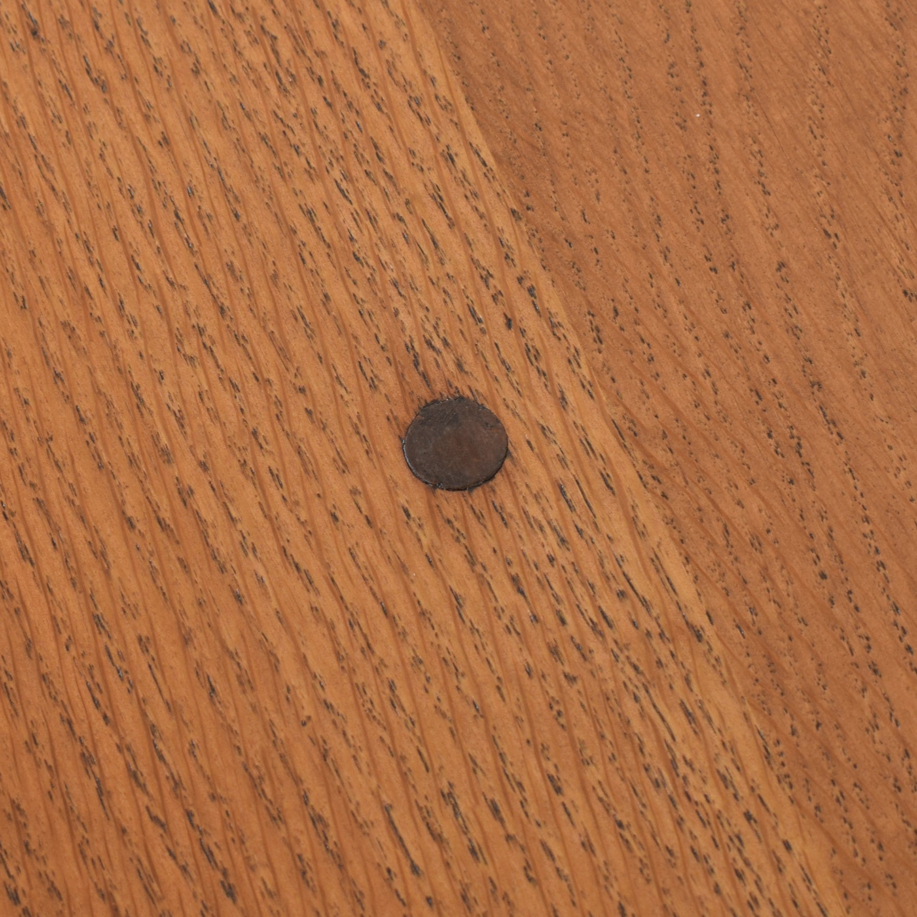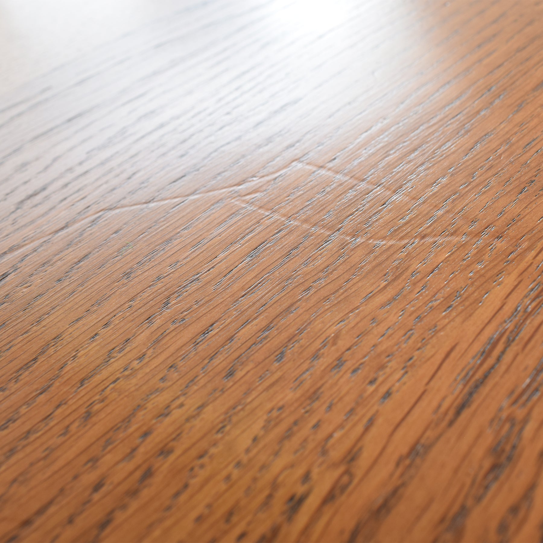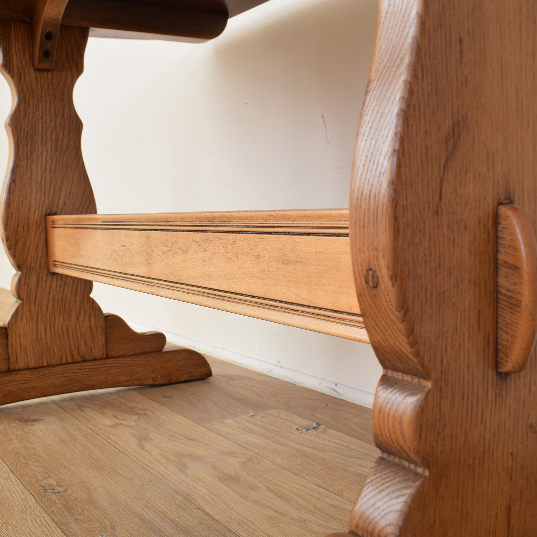 The original darker finish has been completely stripped, and multiple coats of hard-wearing matte lacquer have been applied. This treatment gives the set a durable, long-lasting finish while bringing out the rich natural movement in the timber. This set is made entirely from solid oak. There is a small scratch in the tabletop, this is visible in the accompanying photographs.