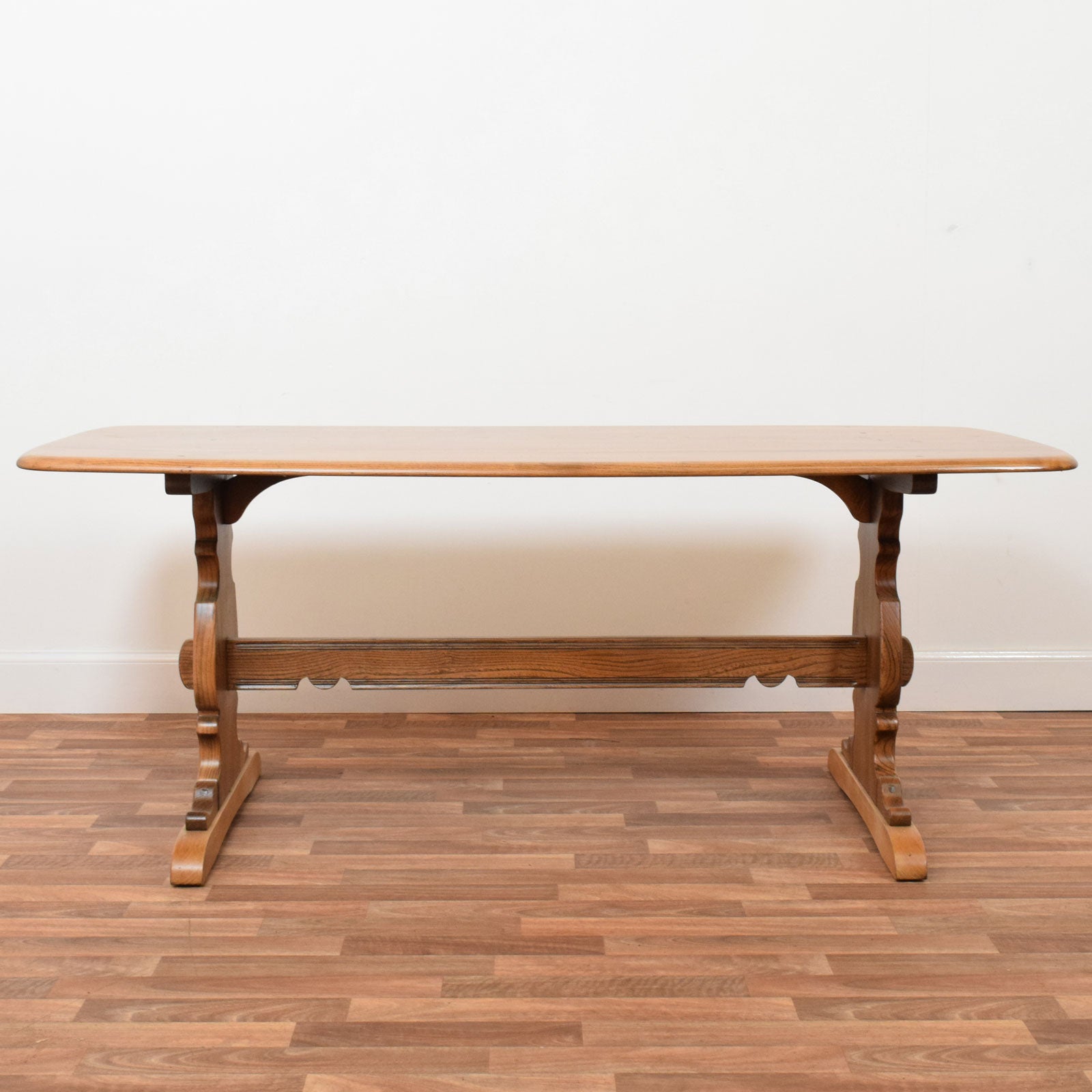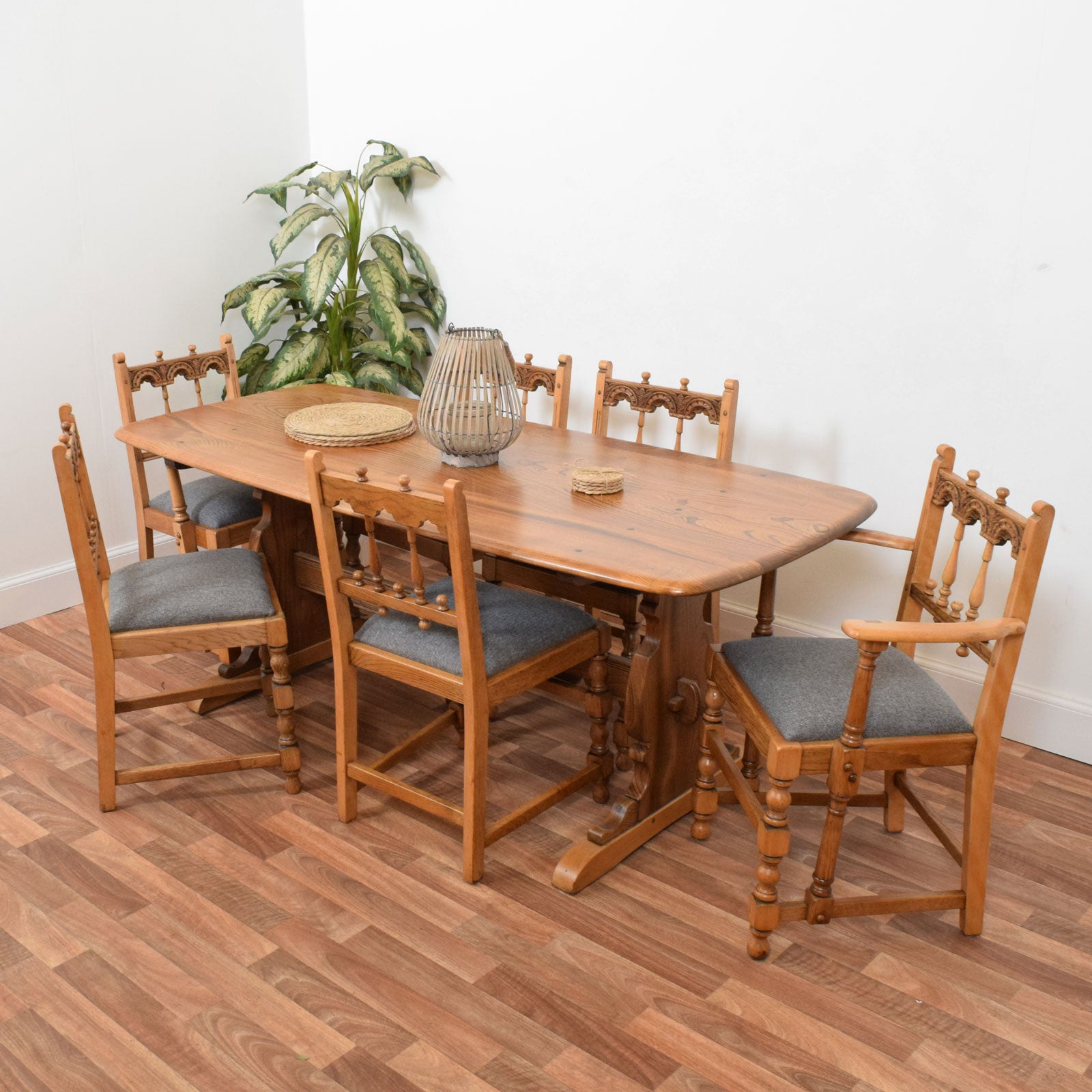 The table features a generously sized rectangular top with softly rounded edges and a beautifully flowing elm grain that runs the full length of the surface. It stands on distinctive trestle-style supports with shaped vertical panels and a central stretcher, giving the piece strength and a balanced, traditional feel. The contrasting tones between the lighter elm top and the darker base add depth and visual interest. The six matching chairs include two carvers and four standard chairs, each with classic Ercol detailing. The chair backs showcase carved arch motifs and turned spindle supports, while the seats have been newly upholstered in a neutral grey fabric that complements the warm timber tones and suits a variety of interior styles.
