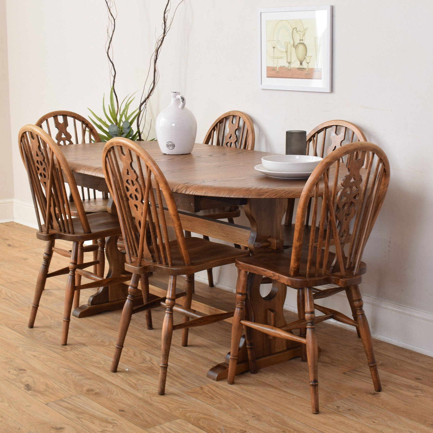 This dining set would suit a family dining room or entertaining space, offering generous seating while maintaining a warm and traditional feel. The extendable table provides flexibility for everyday use and larger gatherings, making it a practical choice for a well-used home.