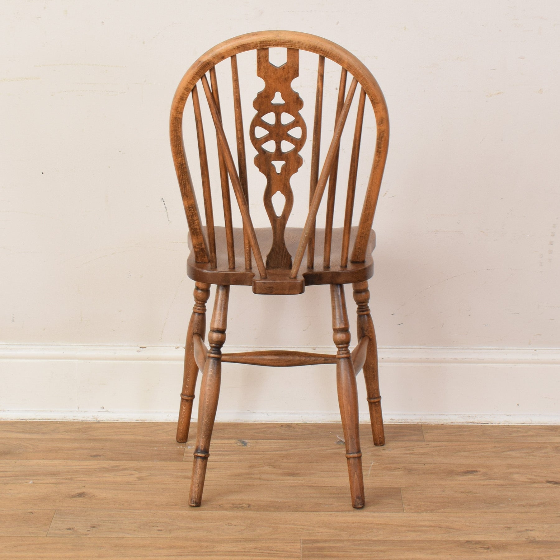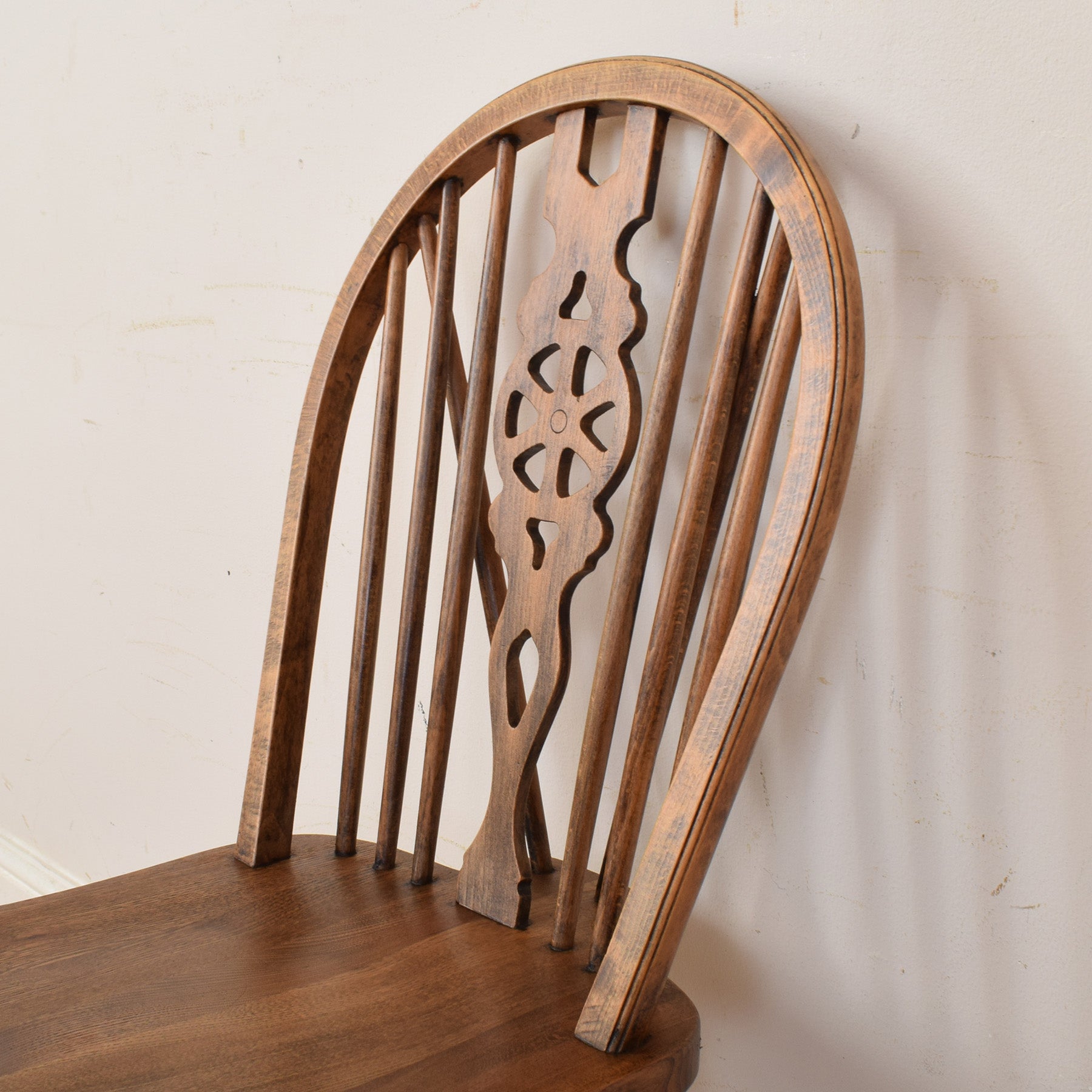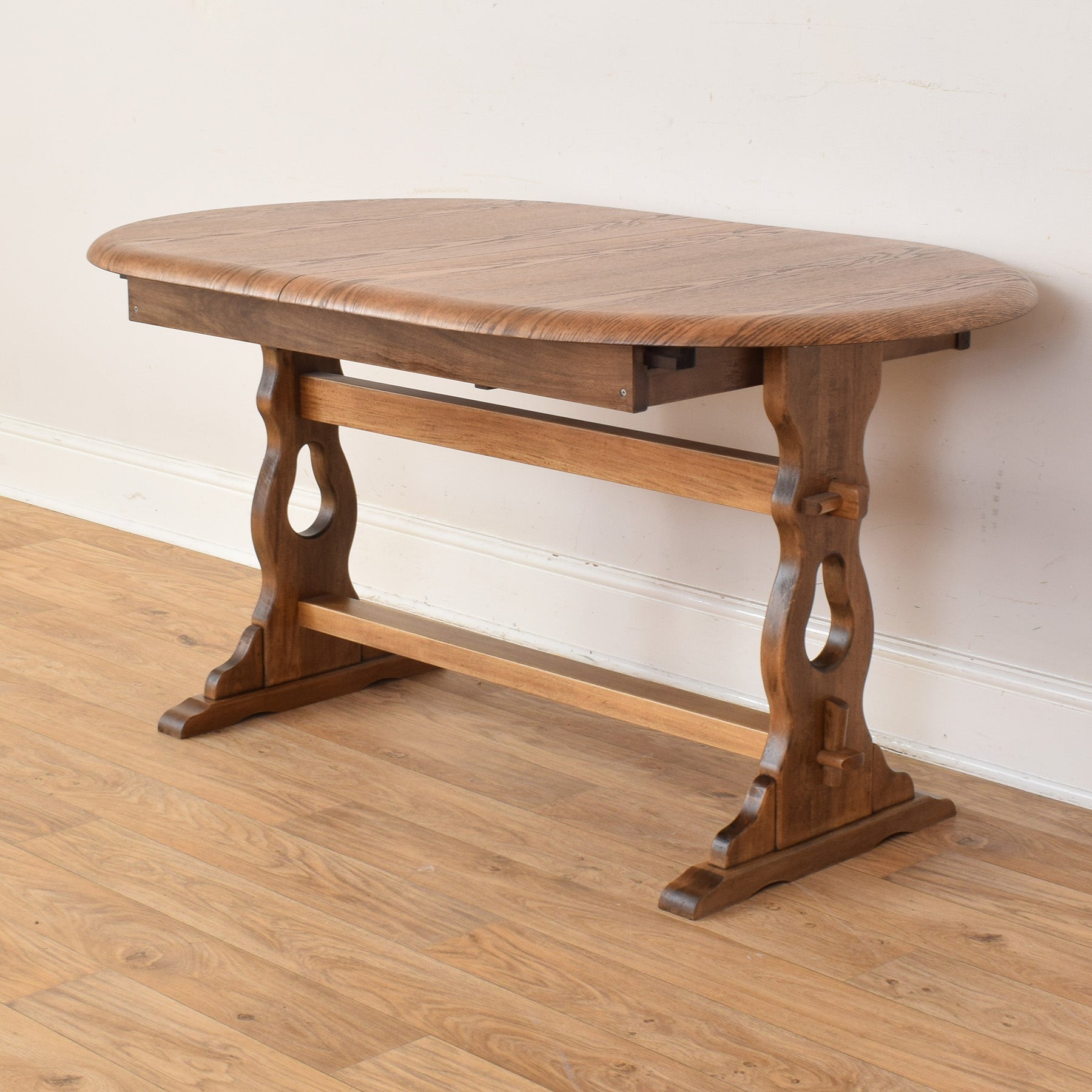 The set consists of an oak extendable dining table paired with six matching chairs. The table features a solid, well-proportioned base with a sturdy central support, while the shaped top and extension mechanism allow it to adapt easily to different occasions. The chairs are solid and supportive, with decorative backs that add character while remaining comfortable and practical.