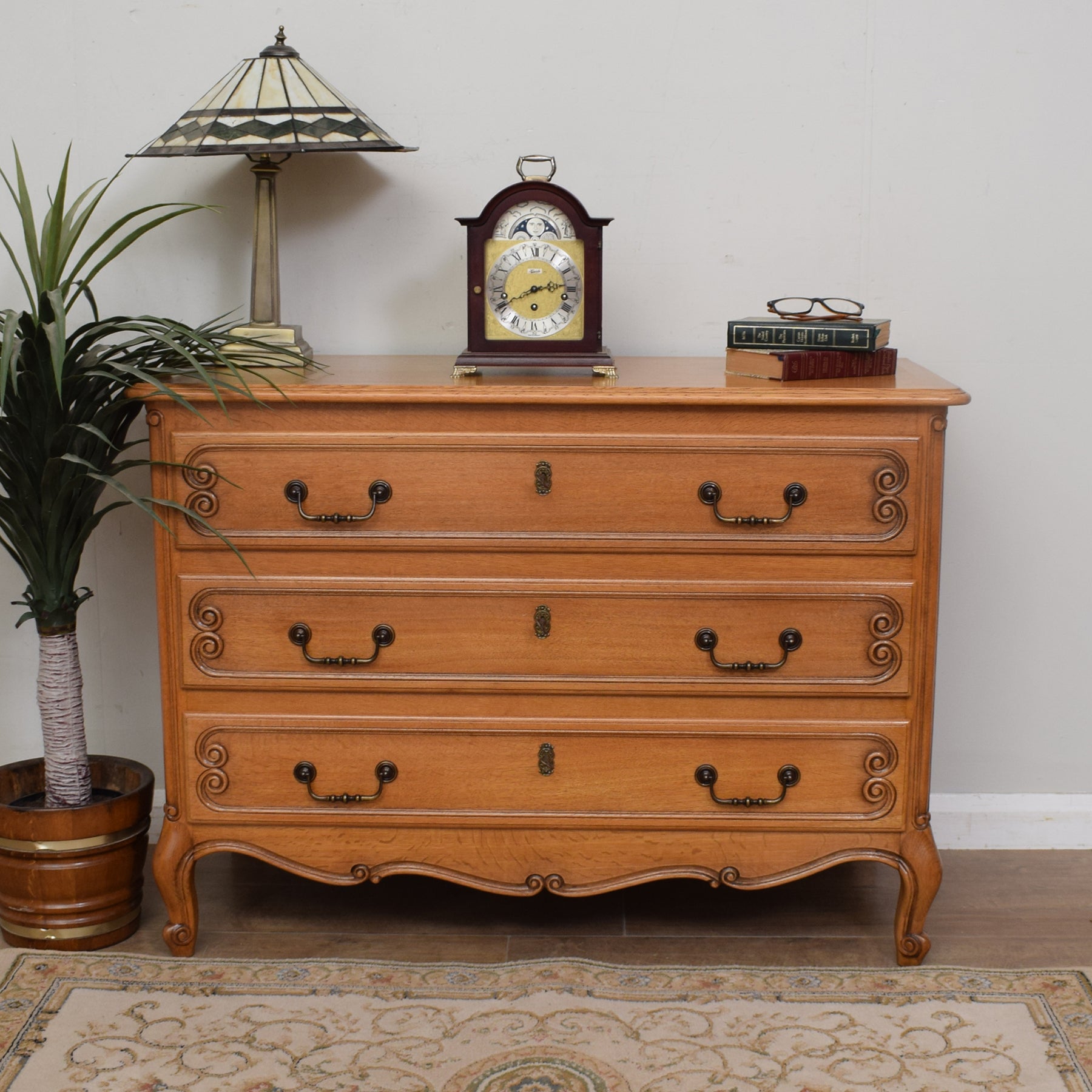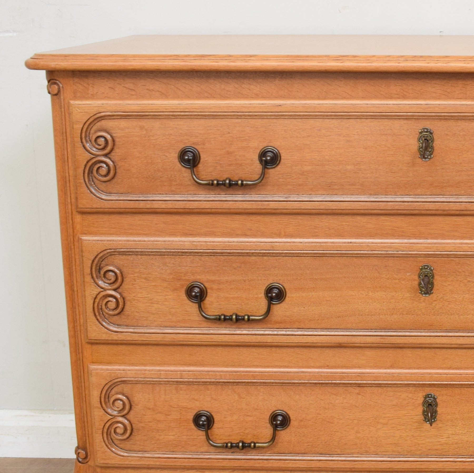 The beautifully grained cabinet features a spacious top surface that is ideal for a lamp, clock, treasured ornaments or a vase of fresh flowers. Below are three full-width drawers offering a good amount of storage for clothes, linen or other items. Each drawer has its own key and can be locked.