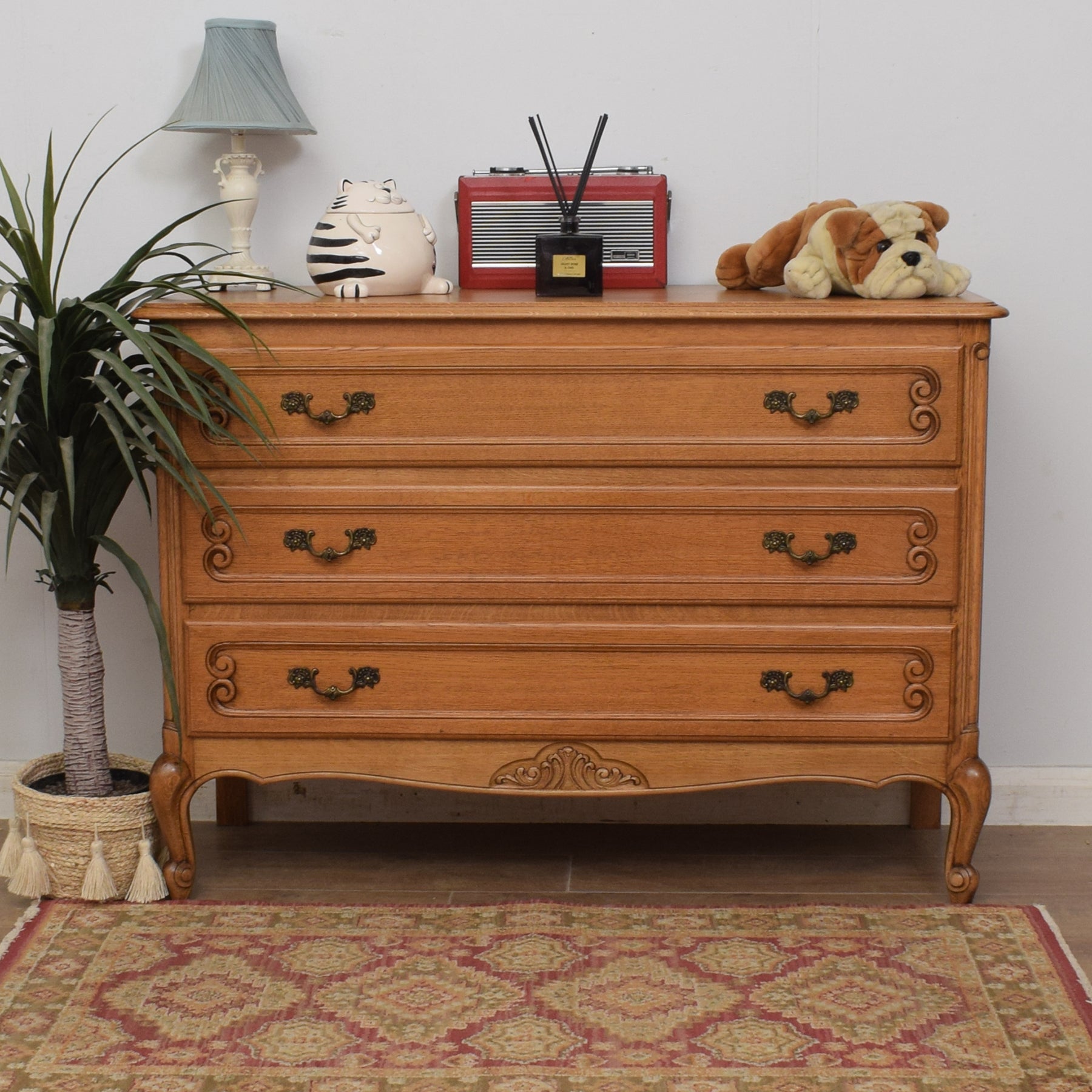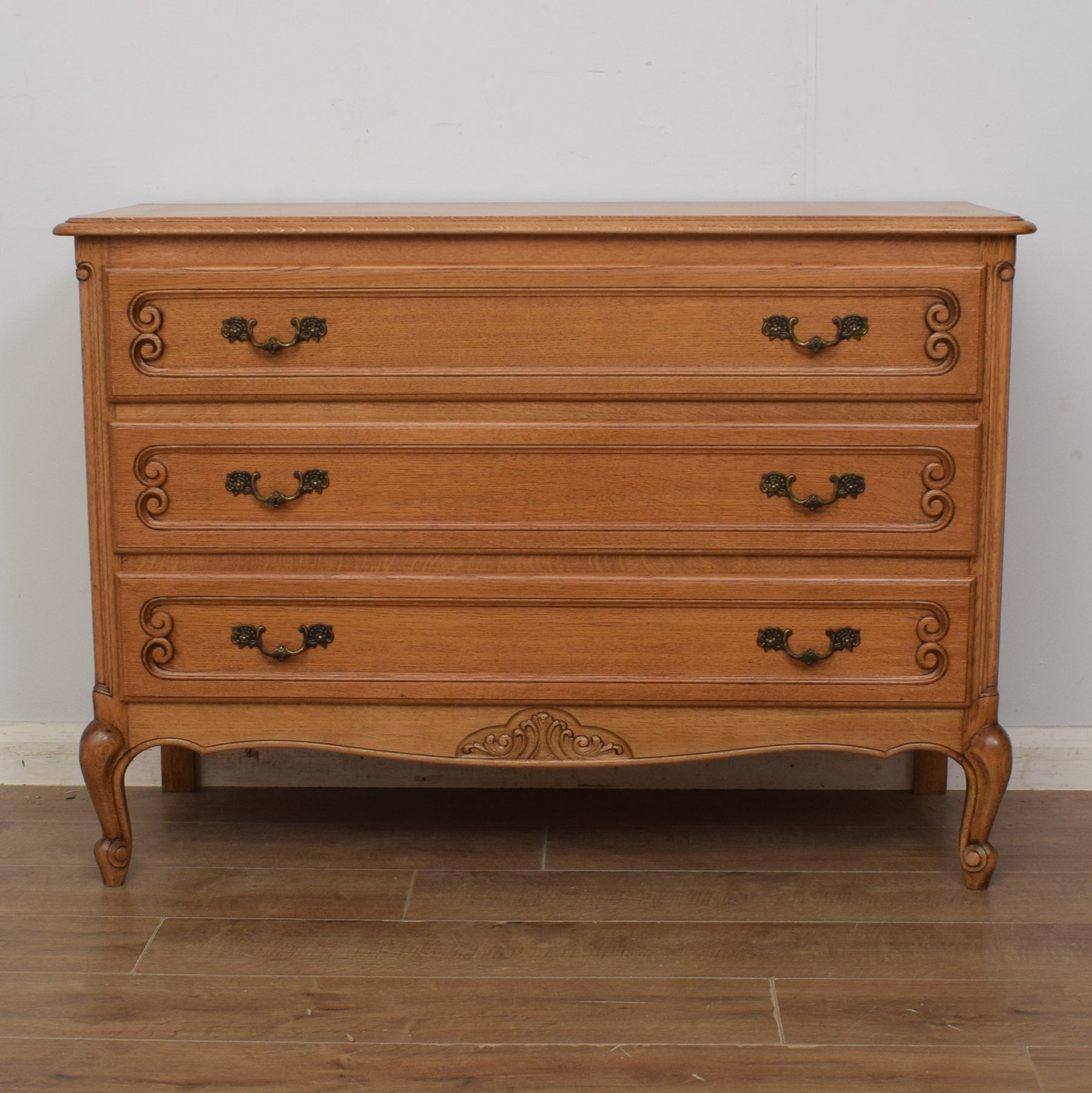 This delightful, French-style, three-drawer chest will make a great addition to any home and is both practical and full of character. The curved, Louis XV-style legs are particularly appealing.