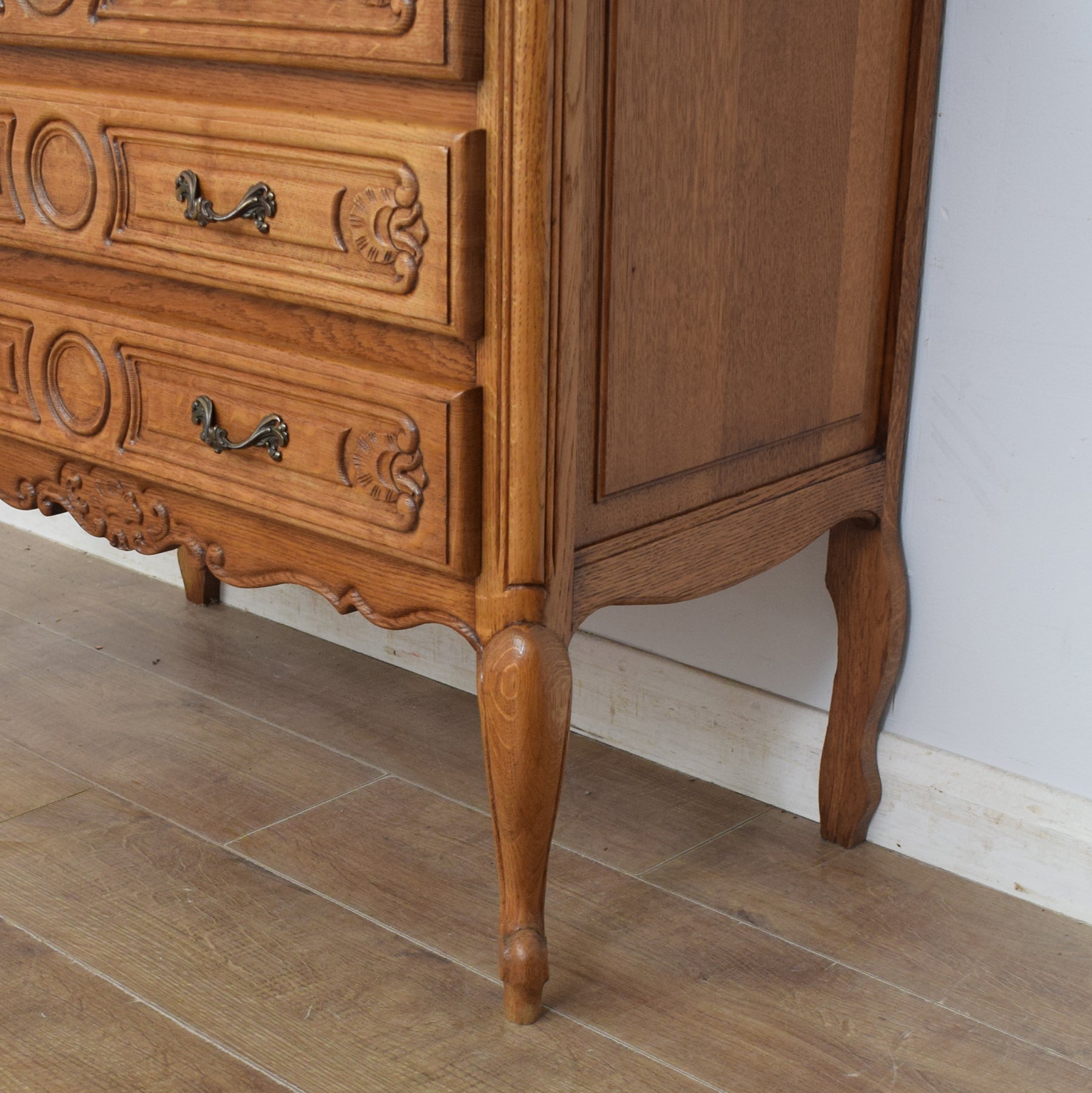 The three drawers are adorned with ornate handles and an attractive, carved pattern, lending this chest of drawers a beautiful appeal while also providing ample storage for clothes and bedding. The oak top is the ideal place for some favourite ornaments or photos of loved ones. The curved, Louis XV style, legs add to the character of the piece.
