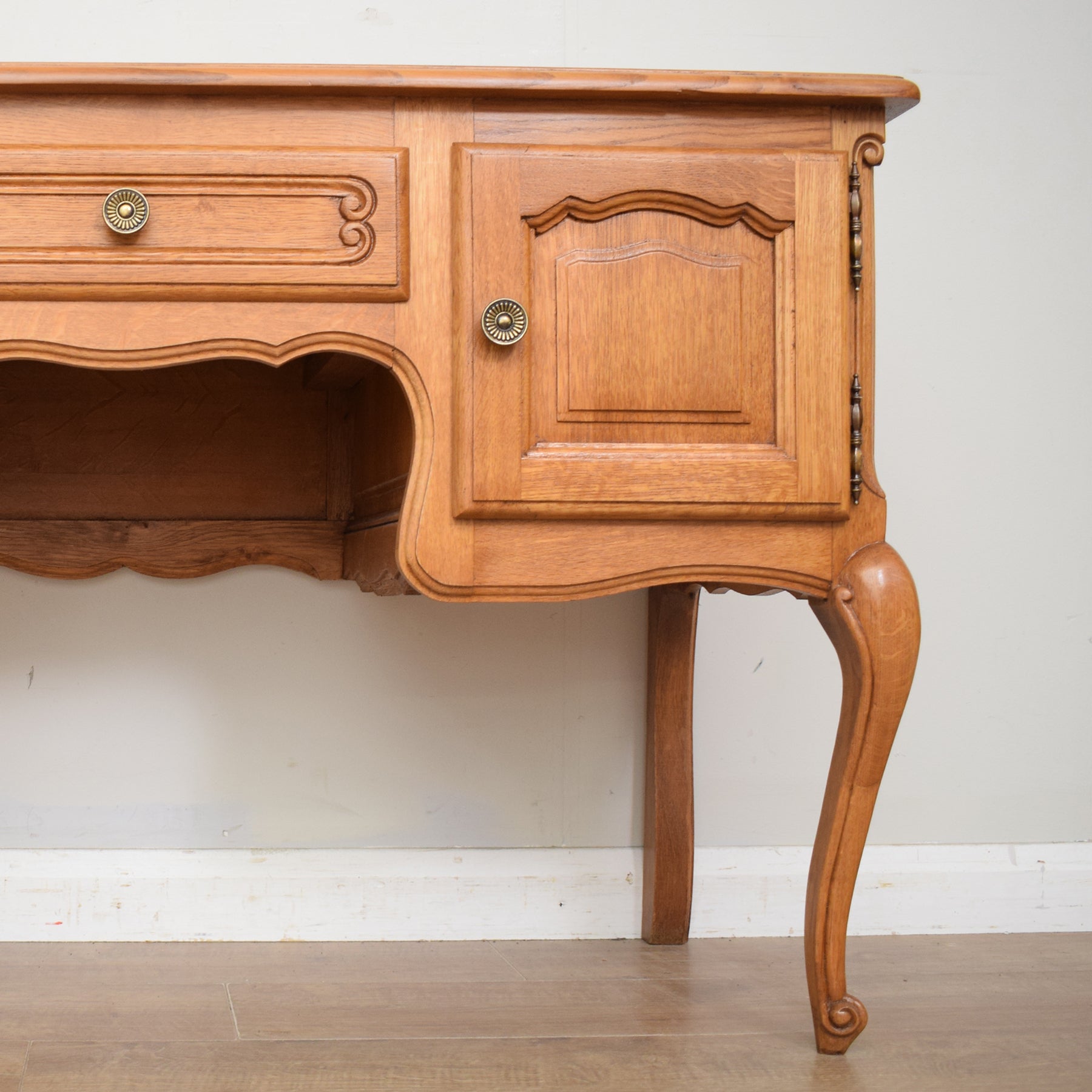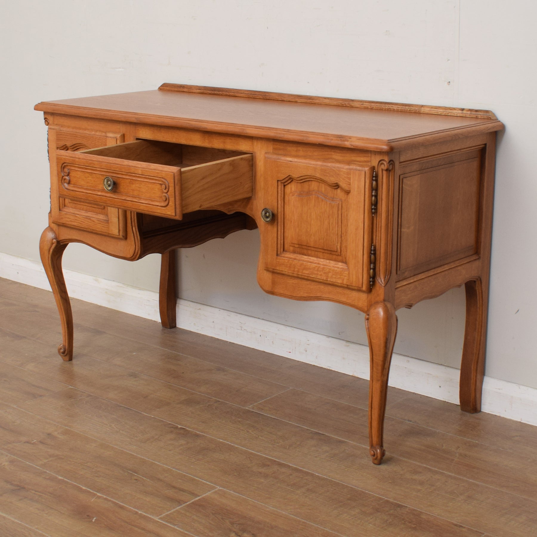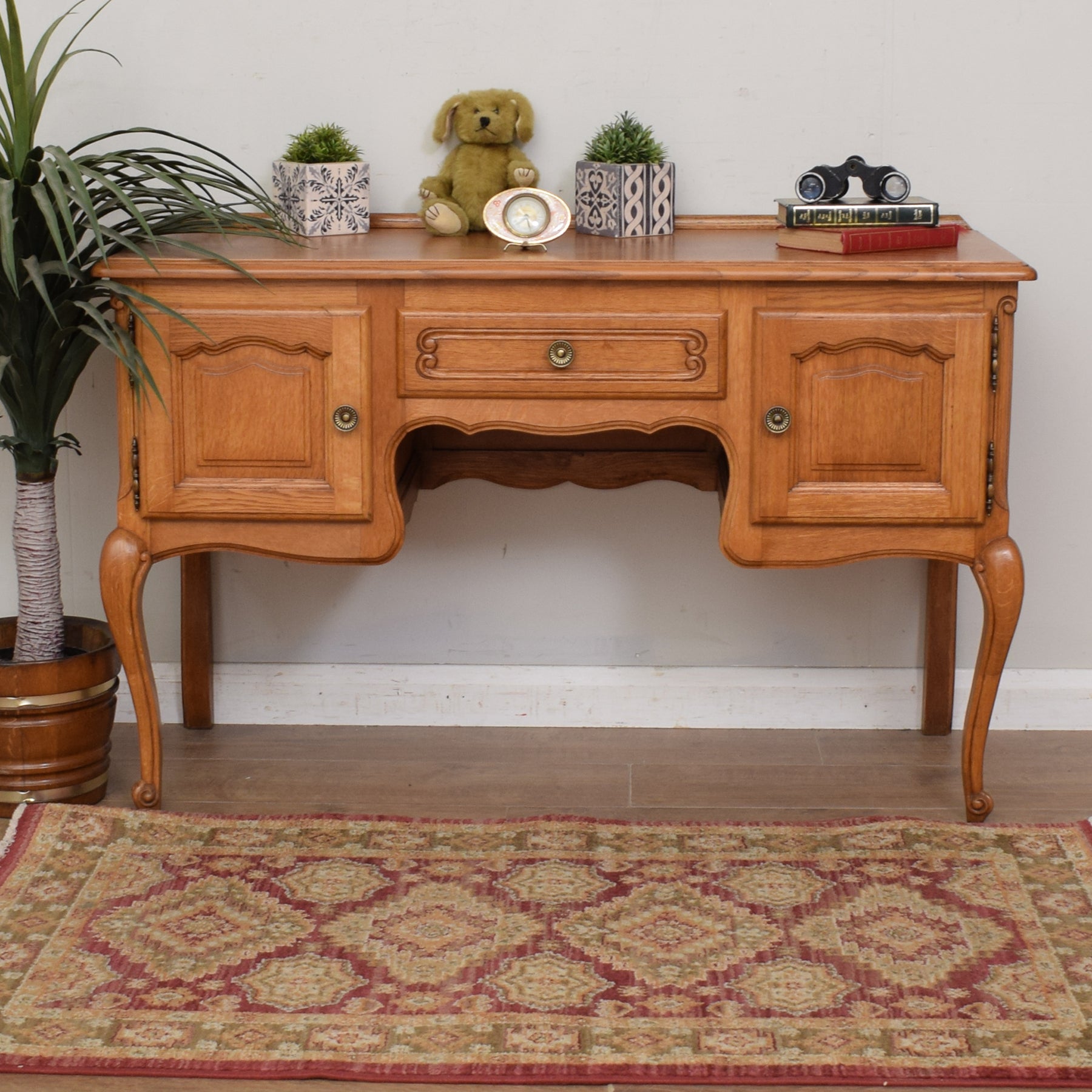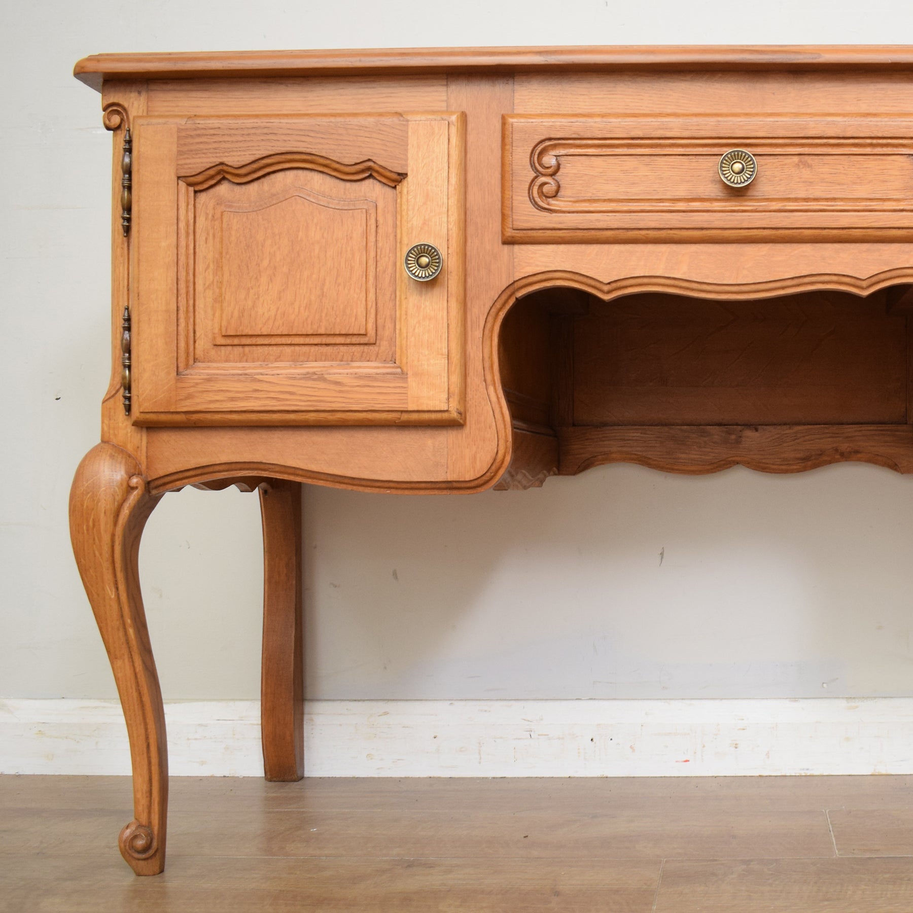 There are two cupboards on either side with one central drawer above the knee hole, providing plenty of storage space for toiletries, clothing, and other personal accessories. The oak top is the perfect place for family photos or ornaments and the curvaceous legs are typical of re-produced Louis XV-style furniture. The height of the kneehole is 54cm.