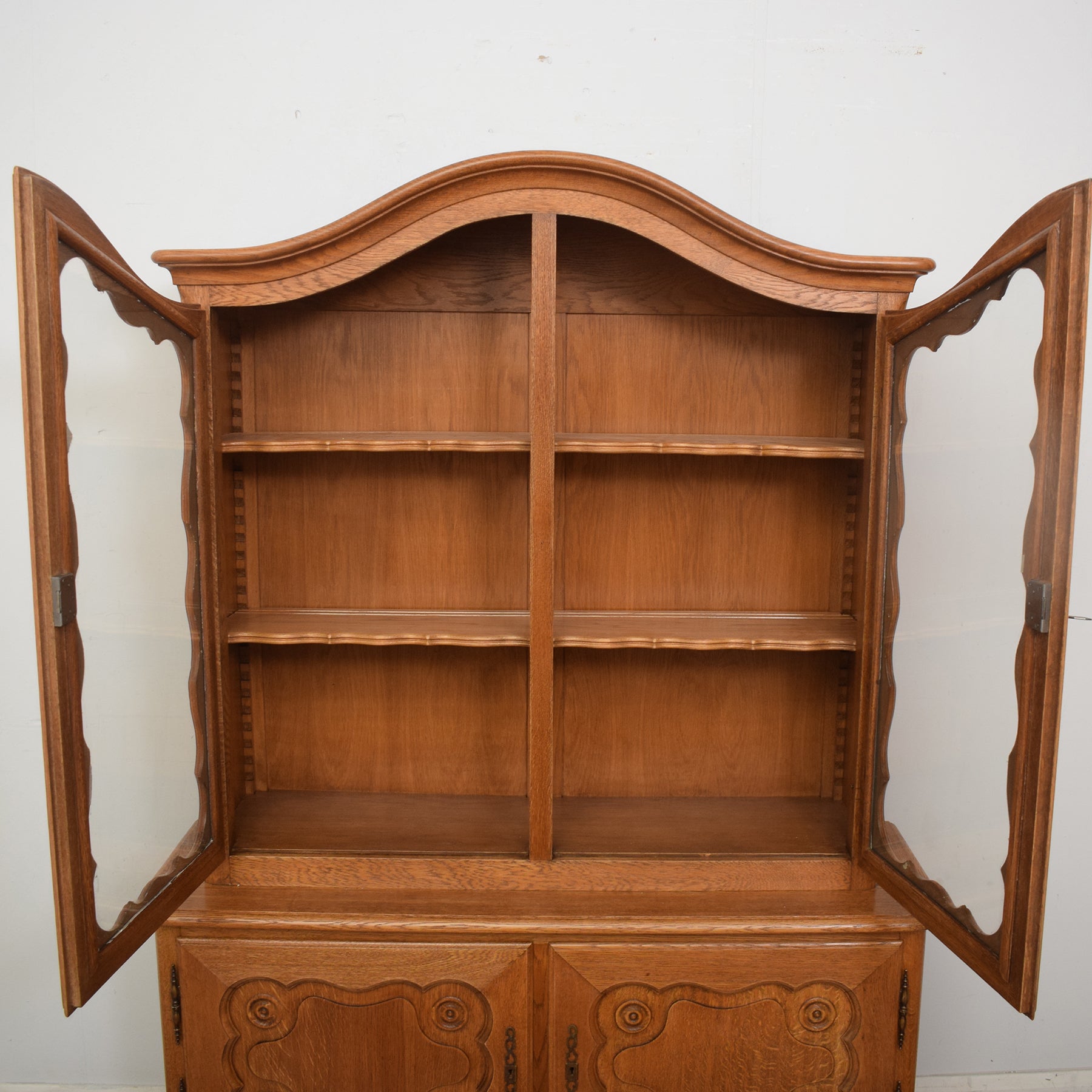 With its curved legs, intricately carved doors and original hinges and escutcheons, this really is a visually appealing display cabinet that will add some character to any room it is situated in.