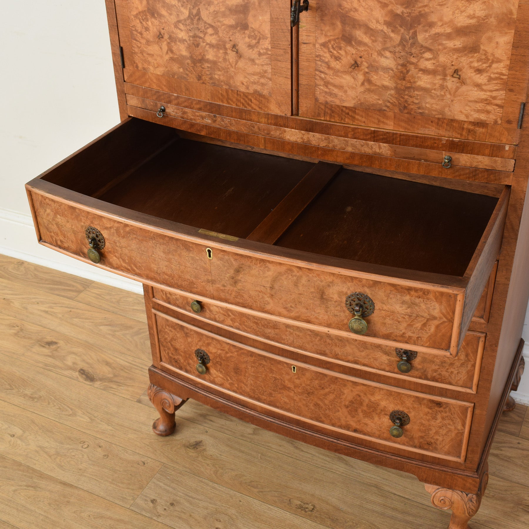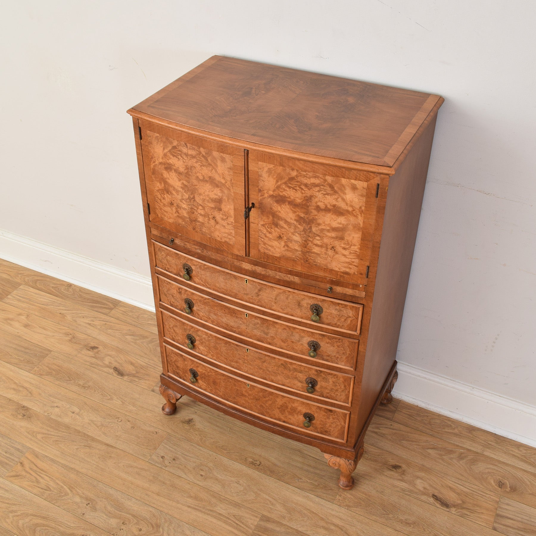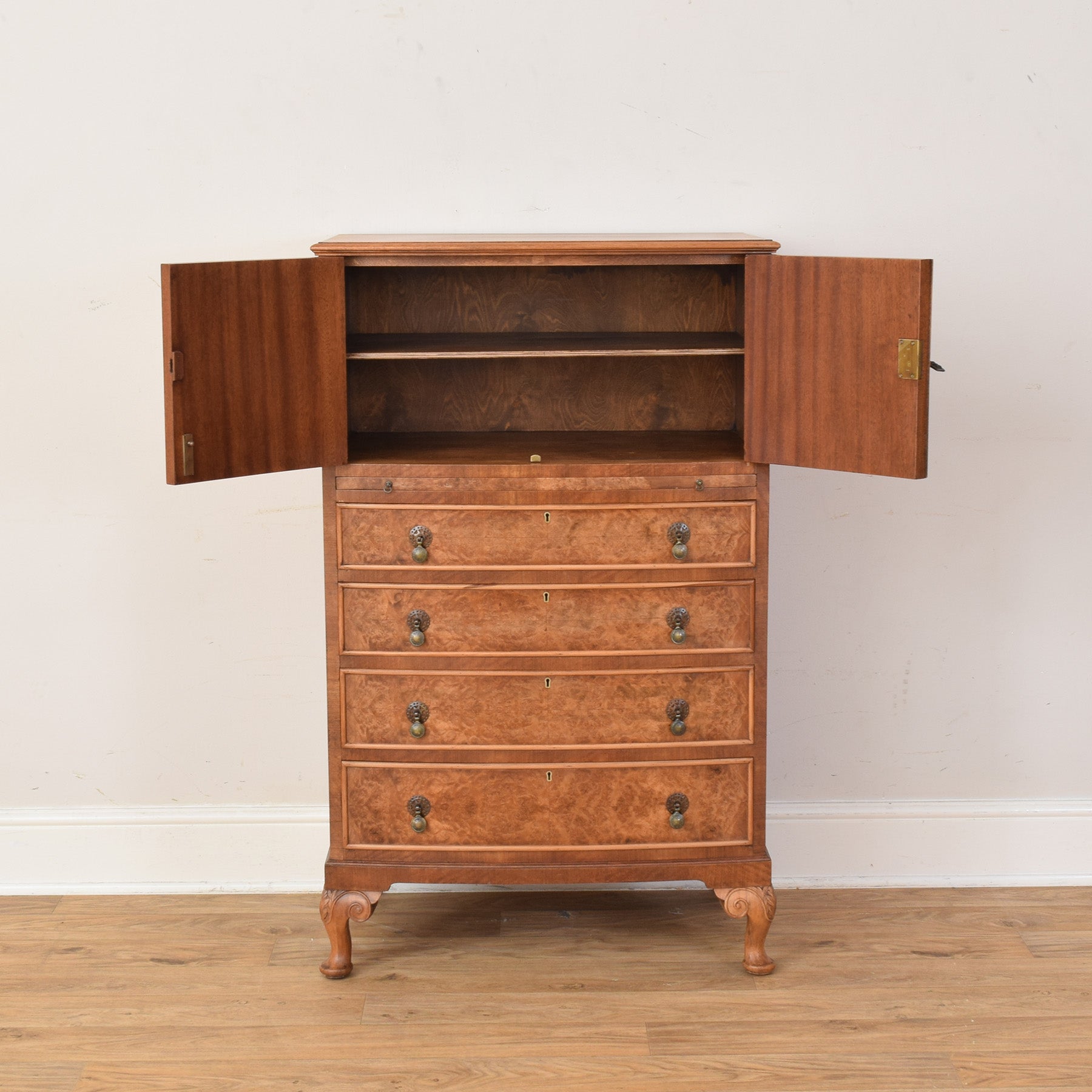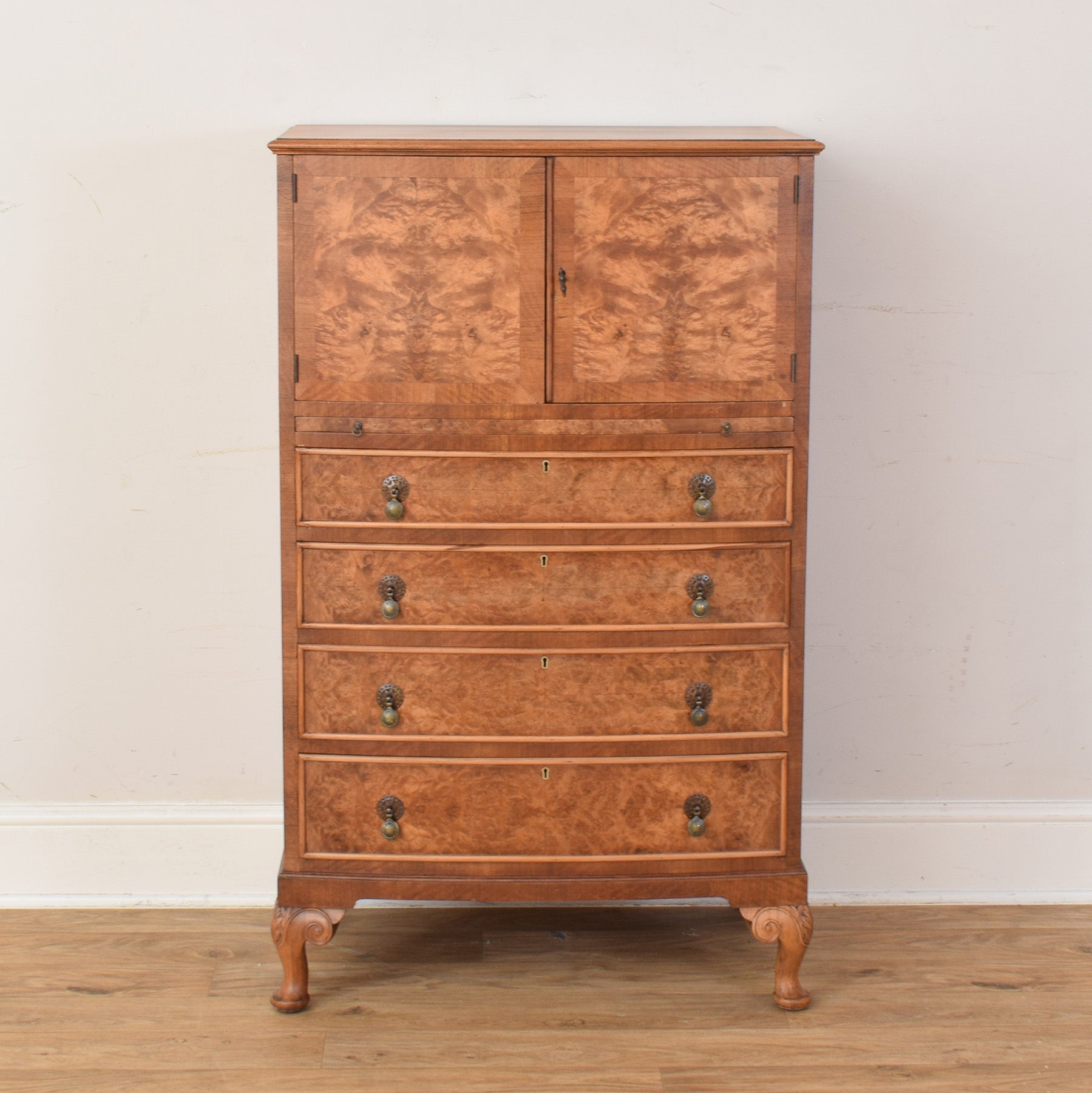 The tallboy features a cupboard section to the top with panelled doors, set above a pull out writing shelf and series of graduated drawers that offer convenient storage for a variety of everyday items. The walnut veneer displays an attractive, flowing grain pattern across the drawer fronts and doors, complemented by traditional handles and shaped feet that give the piece a balanced and timeless appearance.