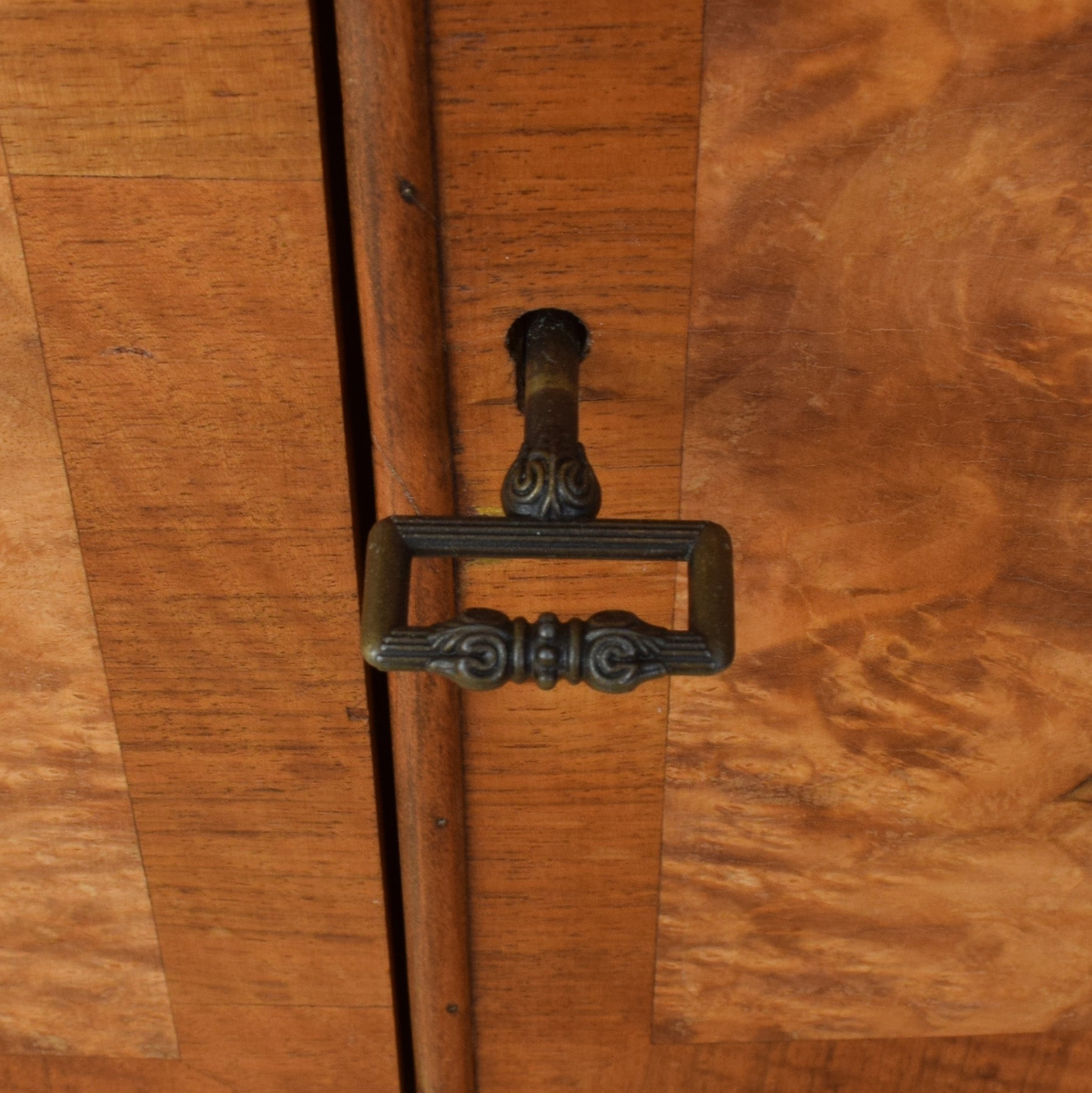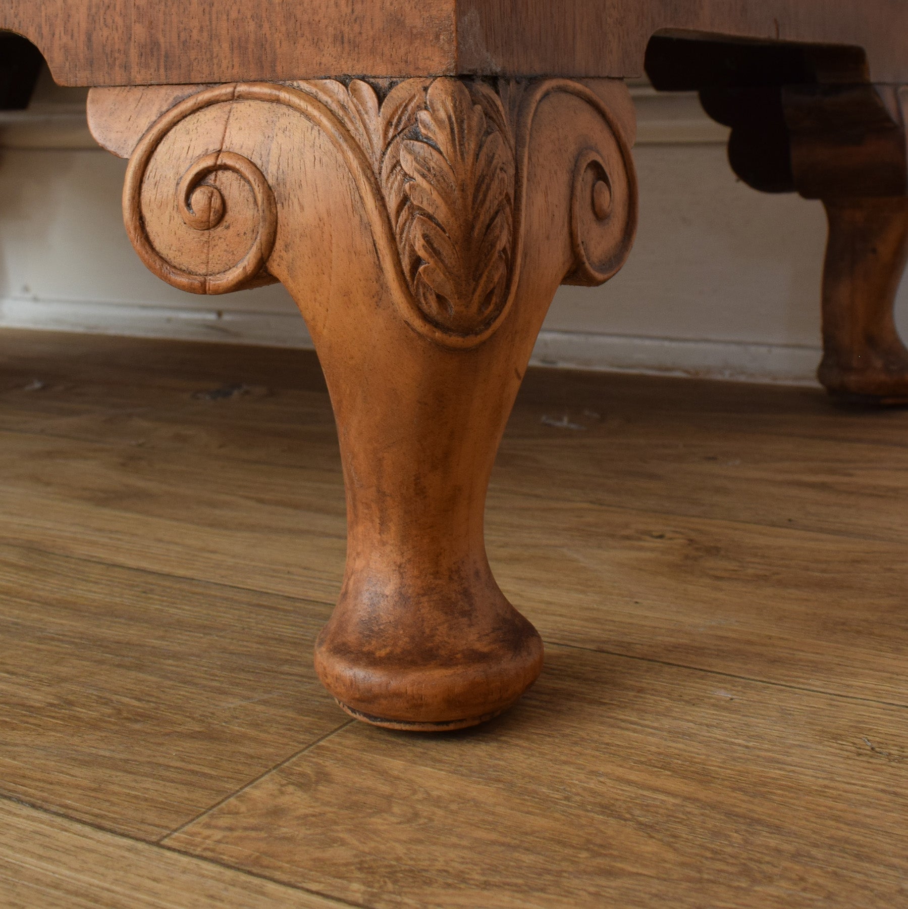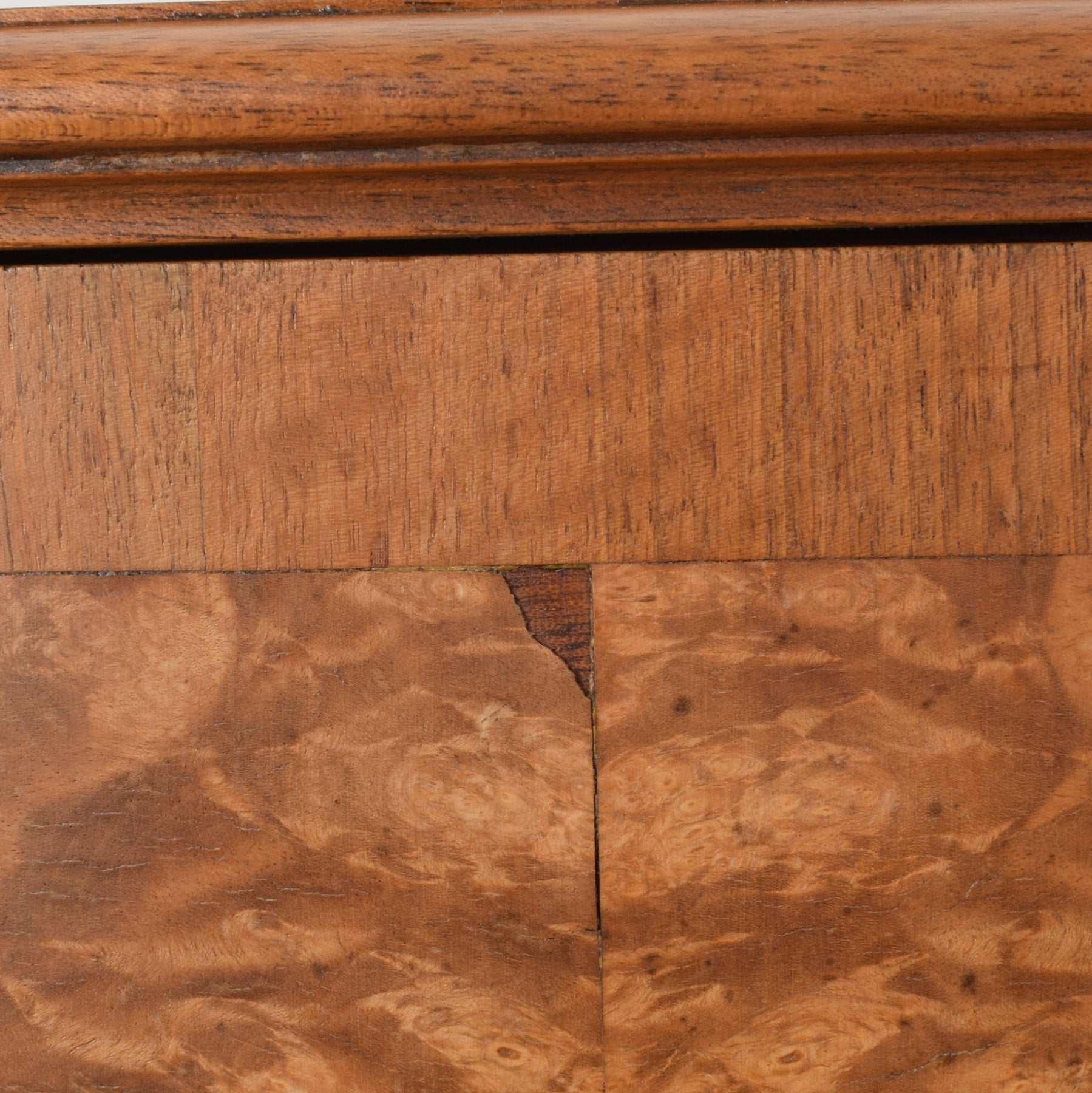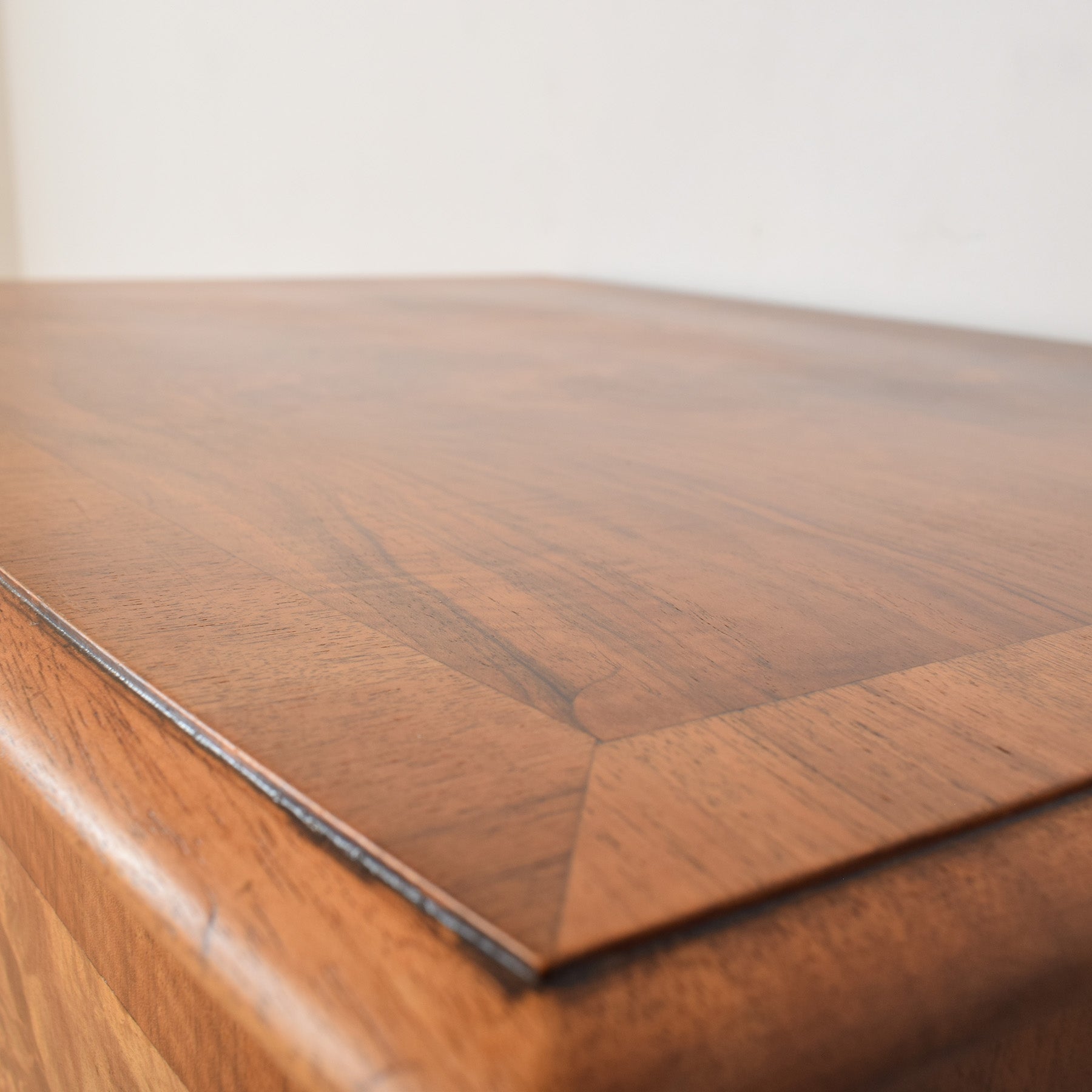The previous finish has been stripped, and multiple coats of hard-wearing matte lacquer have been applied, creating a durable, long-lasting surface while enhancing the natural walnut grain. There are small missing areas of veneer, visible in the photographs, which are consistent with the age of the piece and do not detract from its overall use. This item has been made using a walnut veneer technique. The rear panel is made from plywood, and the drawer bases are also plywood.