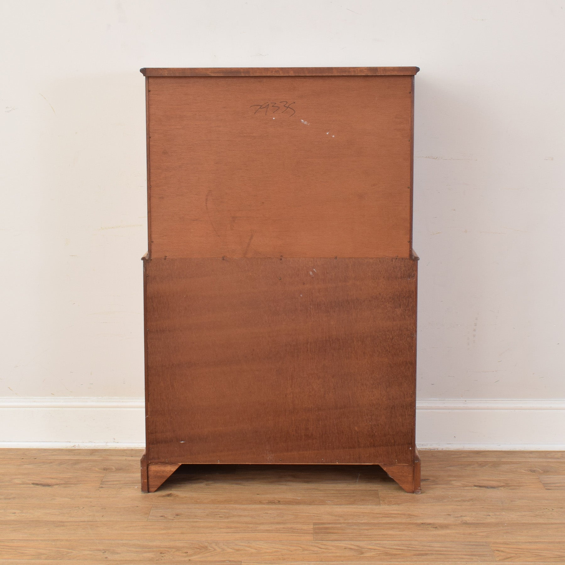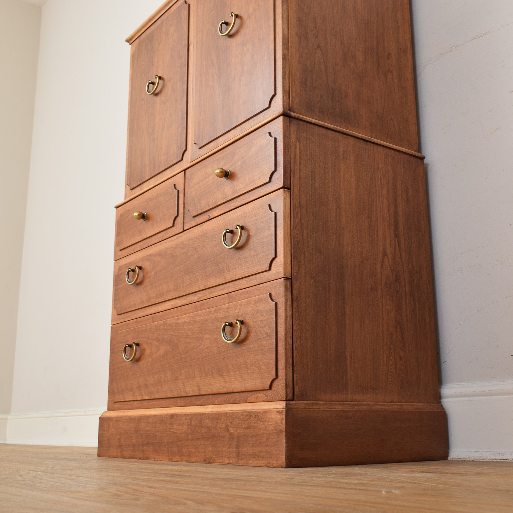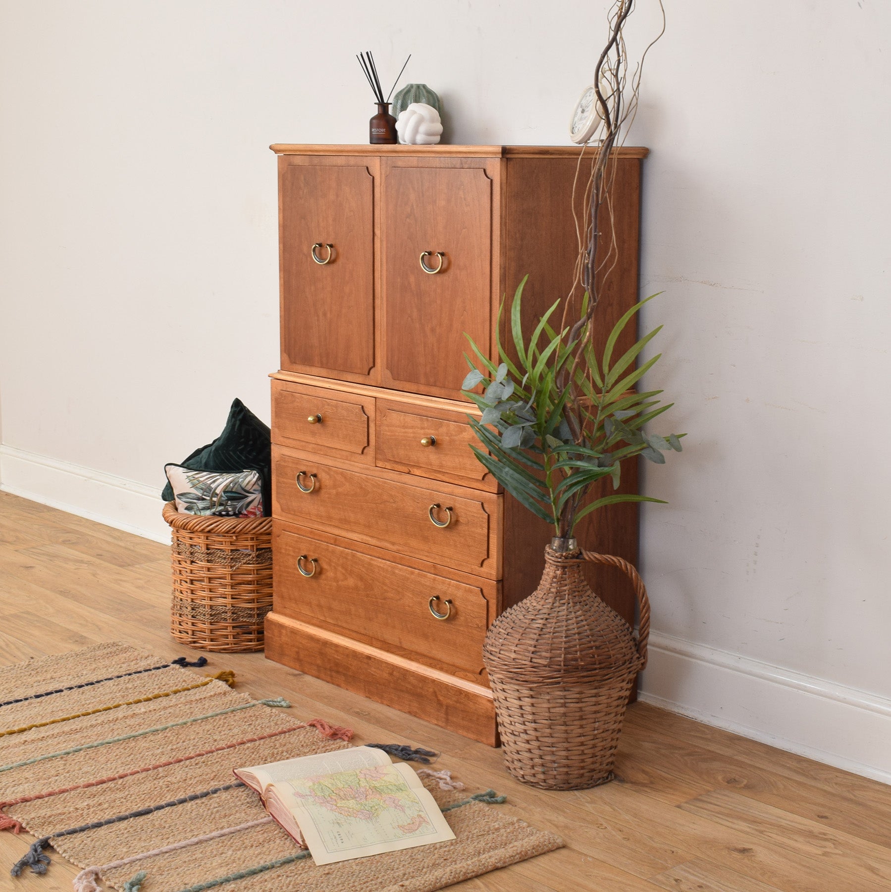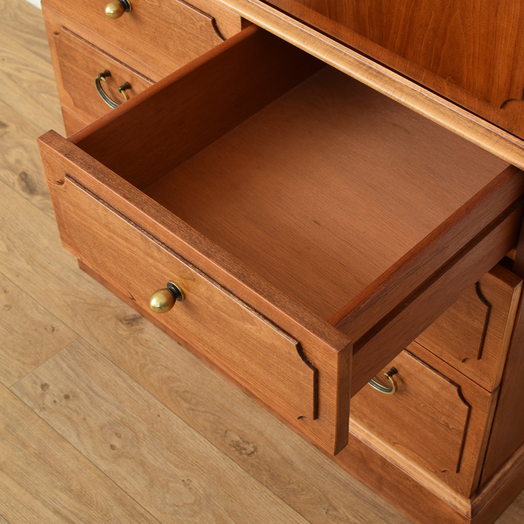 The cabinet has been fully stripped back and then lacquered, creating a durable, protective finish that enhances the natural colour and grain of the wood. This piece is constructed using a mixture of teak and cherry wood veneers. The drawer bases and rear panel are made from plywood.