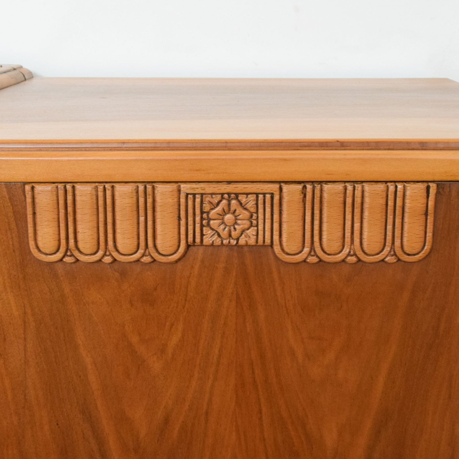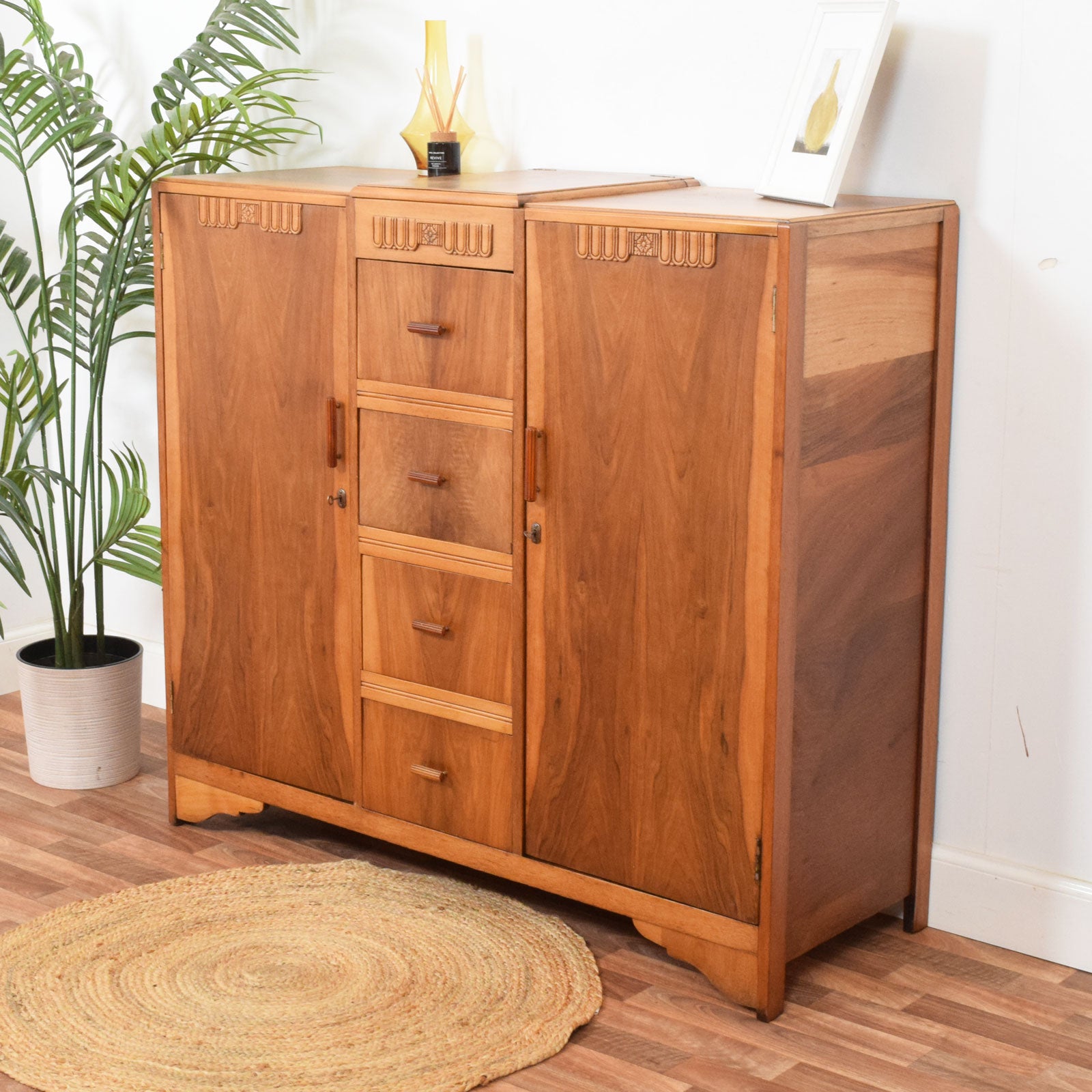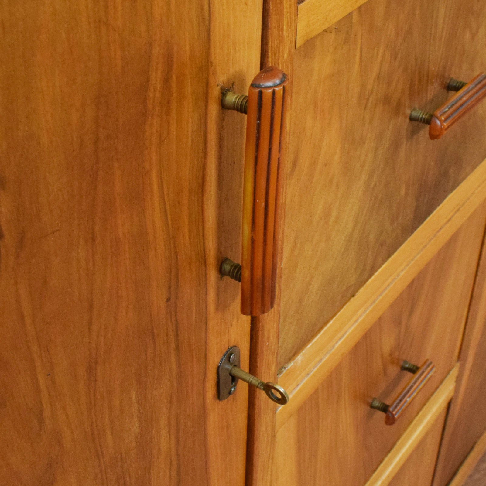 Crafted with elegant proportions, this cabinet features a central bank of five drawers flanked by two tall cupboards. The left-hand cupboard offers full-height hanging space with a metal rail, while the right-hand cupboard contains four fixed shelves with original metal tags for organising clothing and accessories. A concealed lift-up vanity mirror with a green baize-lined compartment beneath adds further functionality. Decorative carved details and fluted Bakelite handles enhance the piece’s period appeal. Two keys are included, each operating one of the outer cupboard doors.