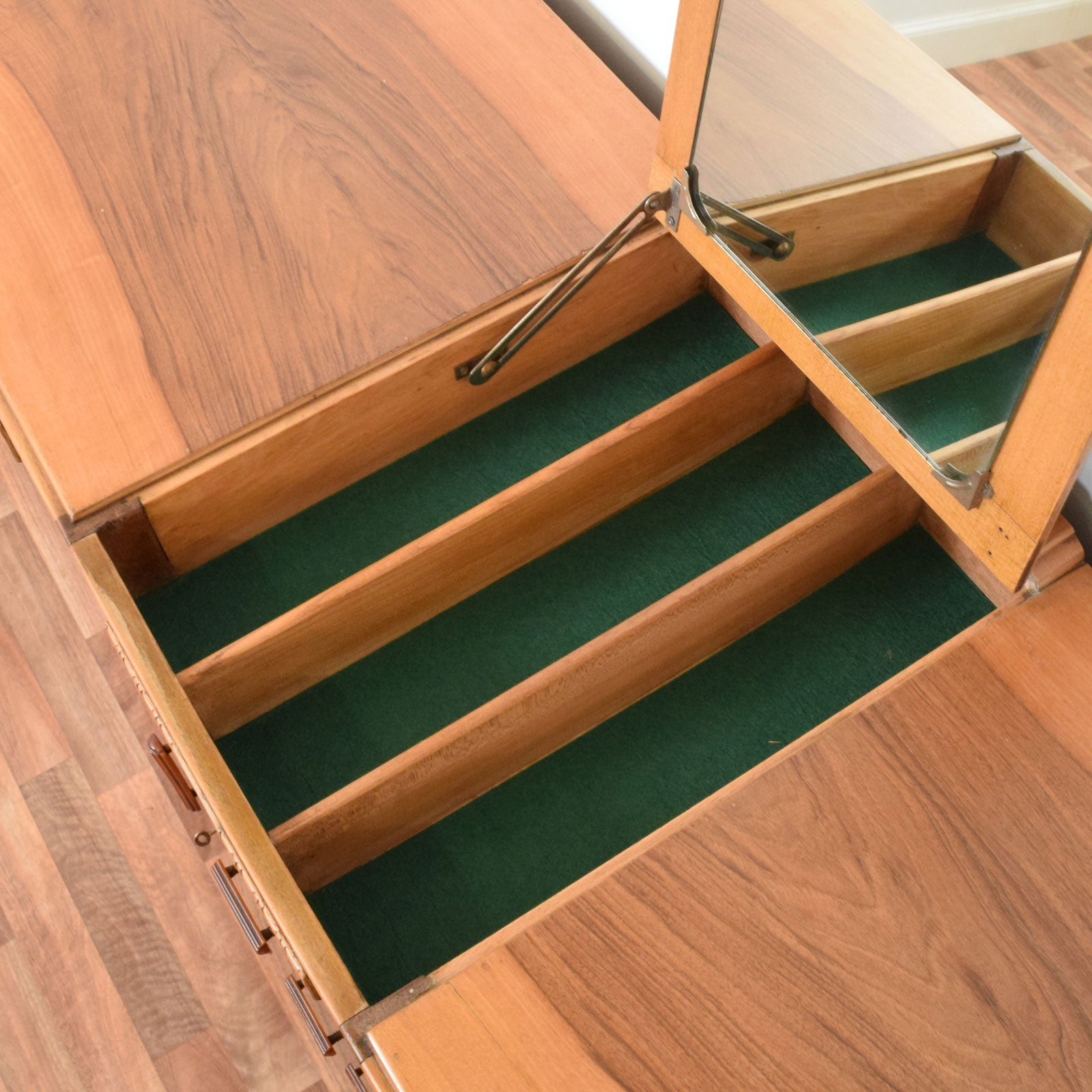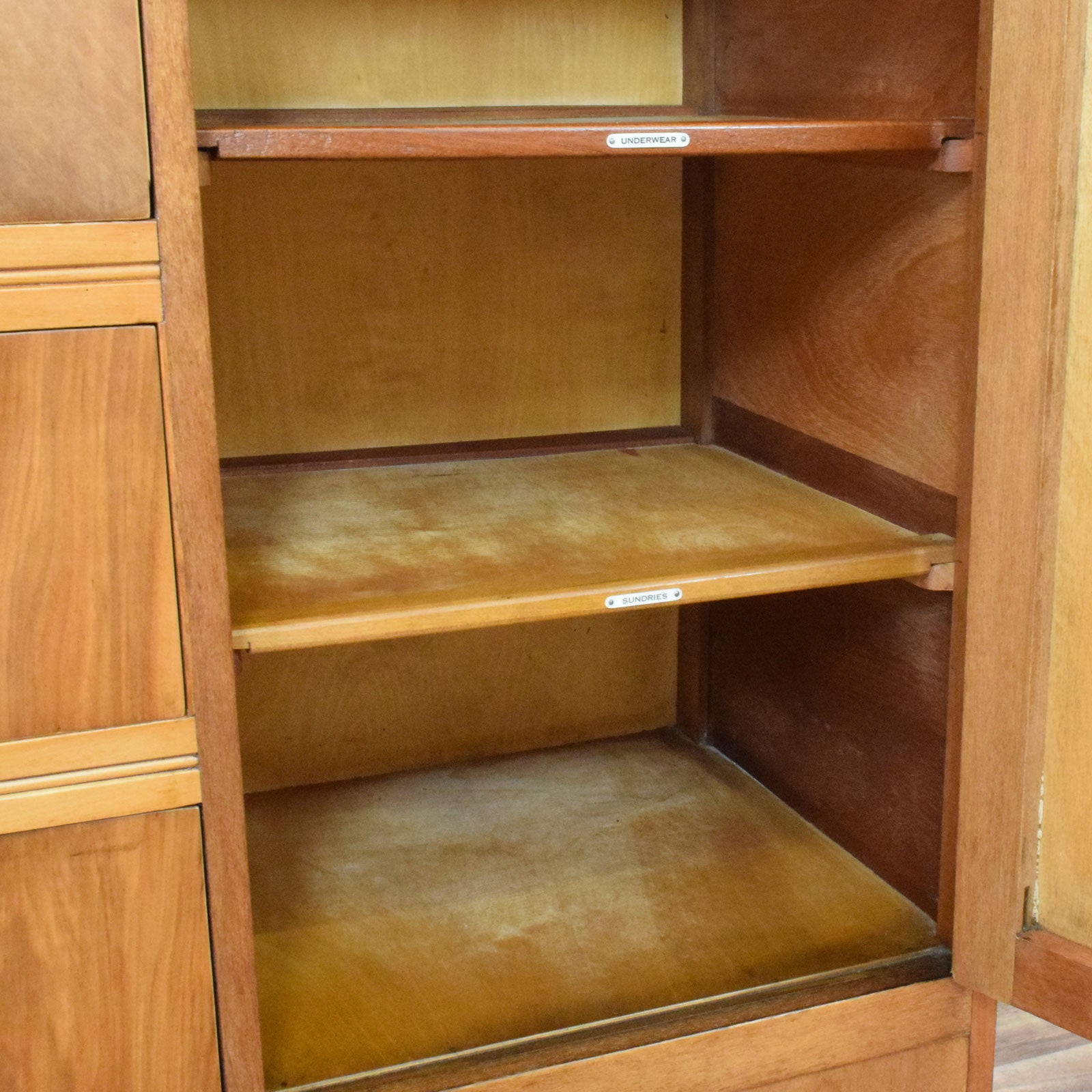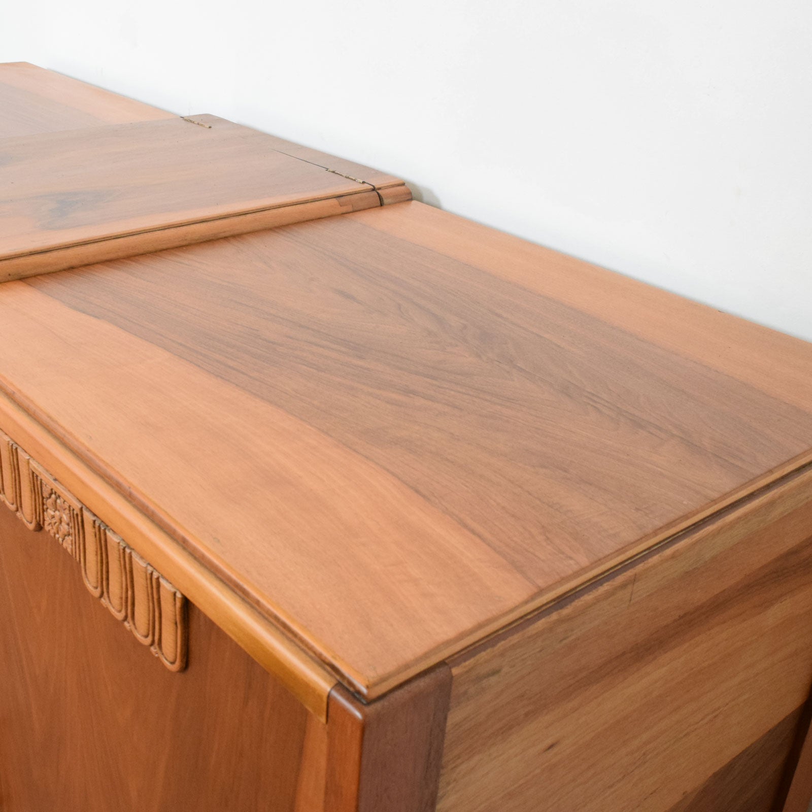 Crafted with elegant proportions, this cabinet features a central bank of five drawers flanked by two tall cupboards. The left-hand cupboard offers full-height hanging space with a metal rail, while the right-hand cupboard contains four fixed shelves with original metal tags for organising clothing and accessories. A concealed lift-up vanity mirror with a green baize-lined compartment beneath adds further functionality. Decorative carved details and fluted Bakelite handles enhance the piece’s period appeal. Two keys are included, each operating one of the outer cupboard doors.