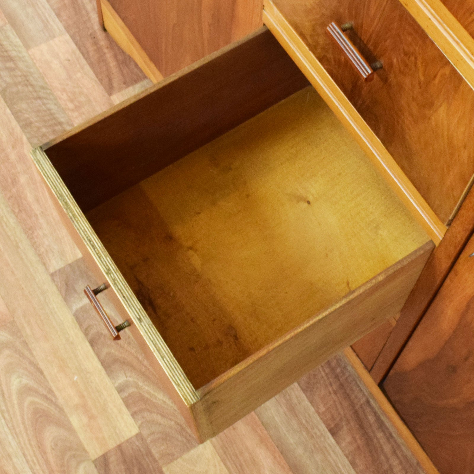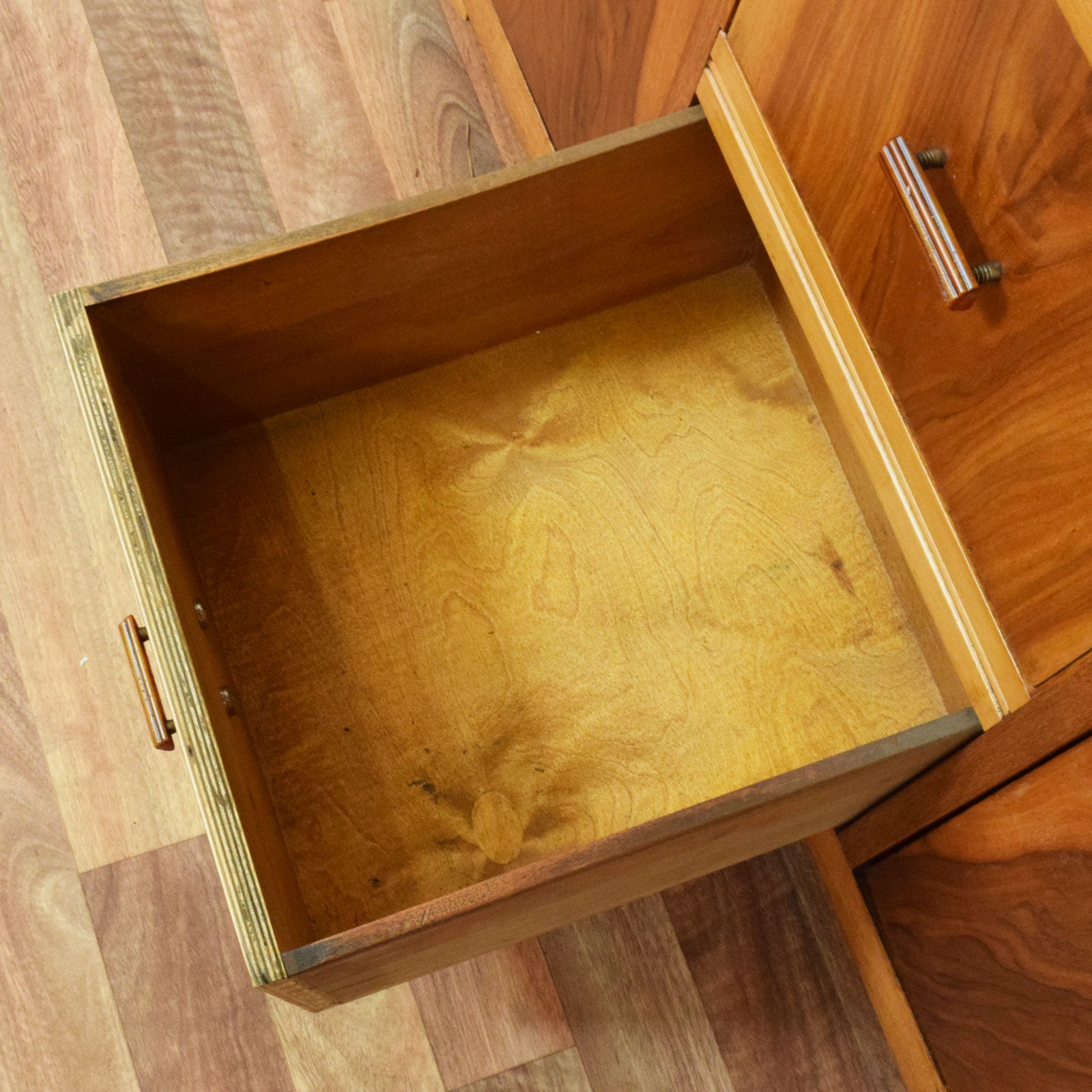 The previous finish has been fully stripped, and multiple coats of hard-wearing matte lacquer have been applied, bringing out the warm tones and varied grain of the walnut veneer. While the exterior veneer presents a clean and rich finish, the internal shelving—particularly on the right-hand side—shows visible wear markings consistent with age and use. The shelves and interior panelling are constructed from plywood, while the outer surfaces are covered in walnut veneer. The original Bakelite handles remain intact and functional, adding to the cabinet’s charm and authenticity.