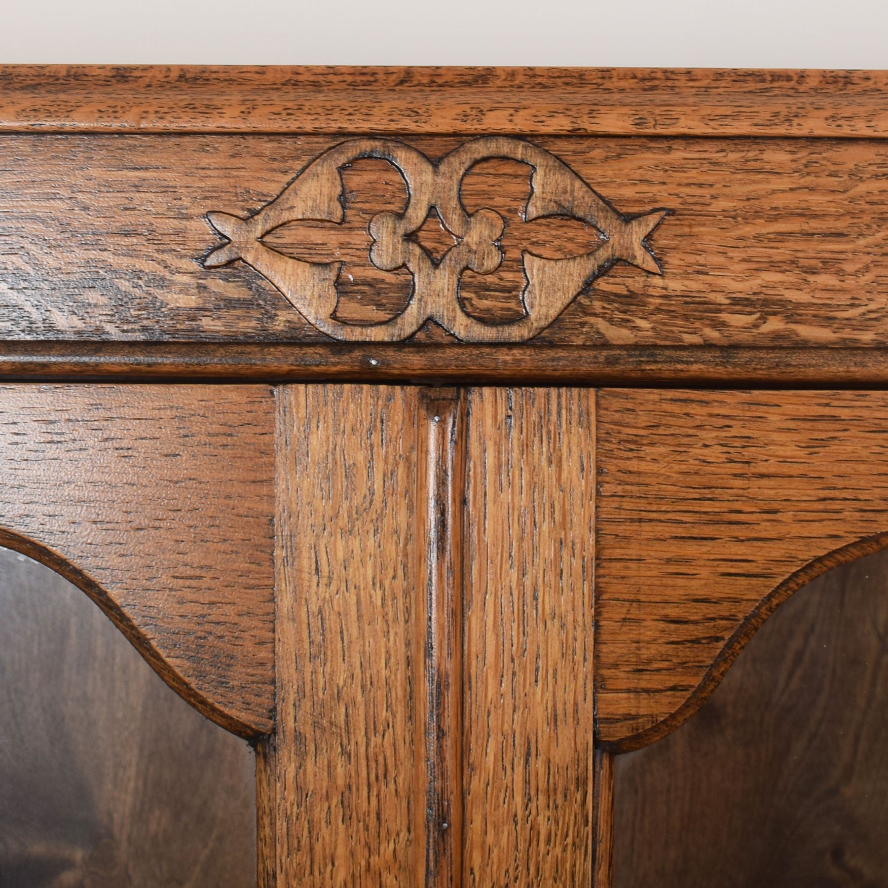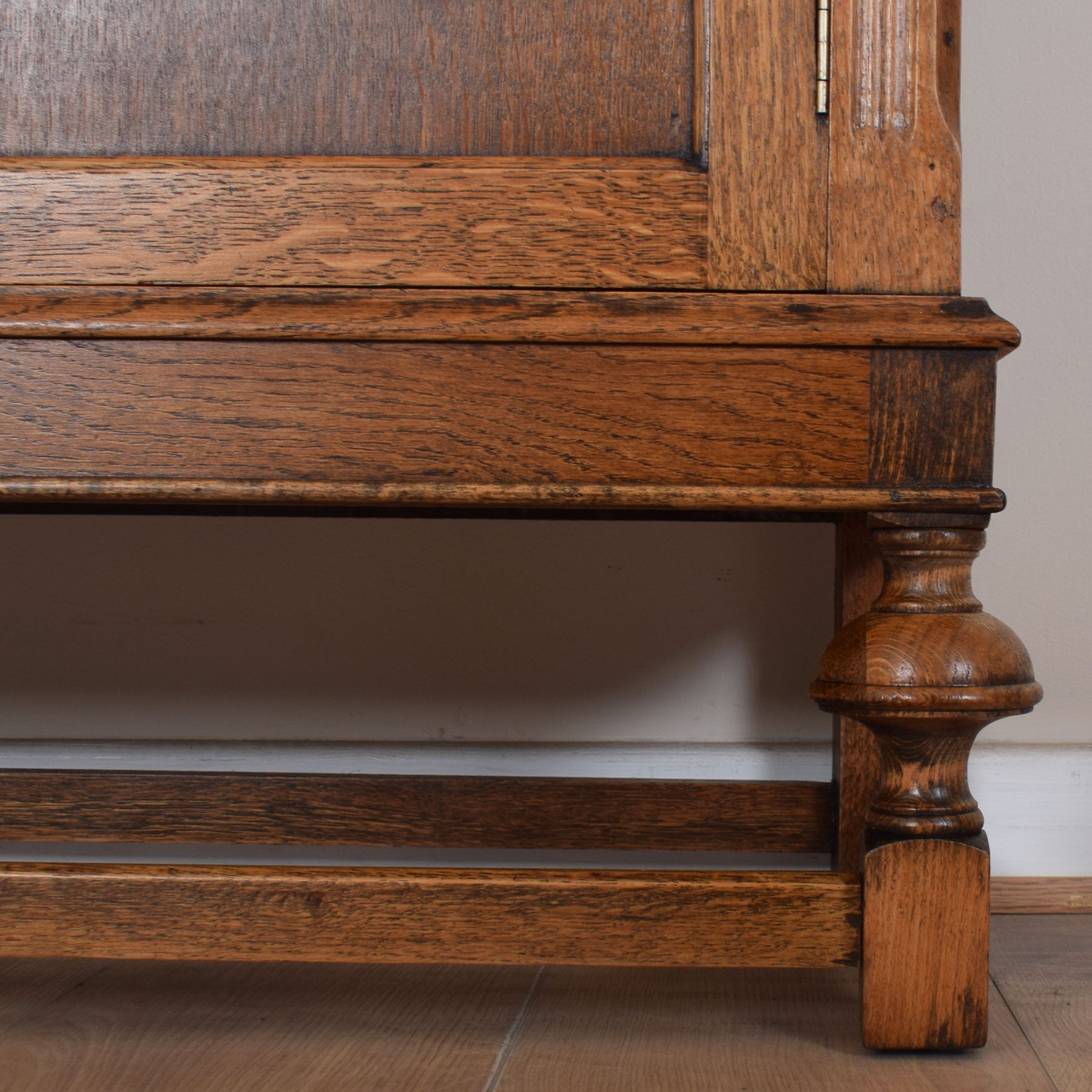 Our restoration workshop has stripped the original varnish from this piece before applying a professional matt lacquer that enhances the rich colour and grain detail of the natural oak.