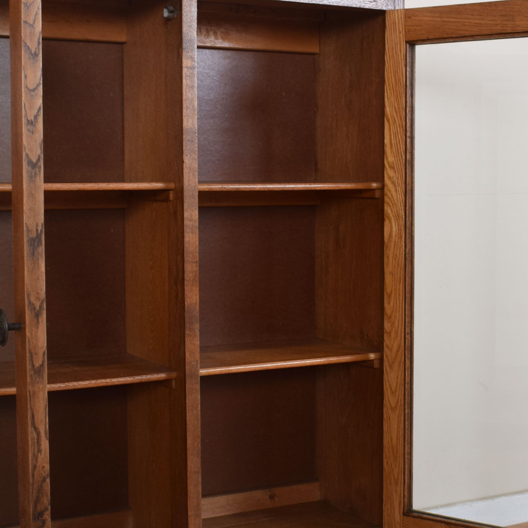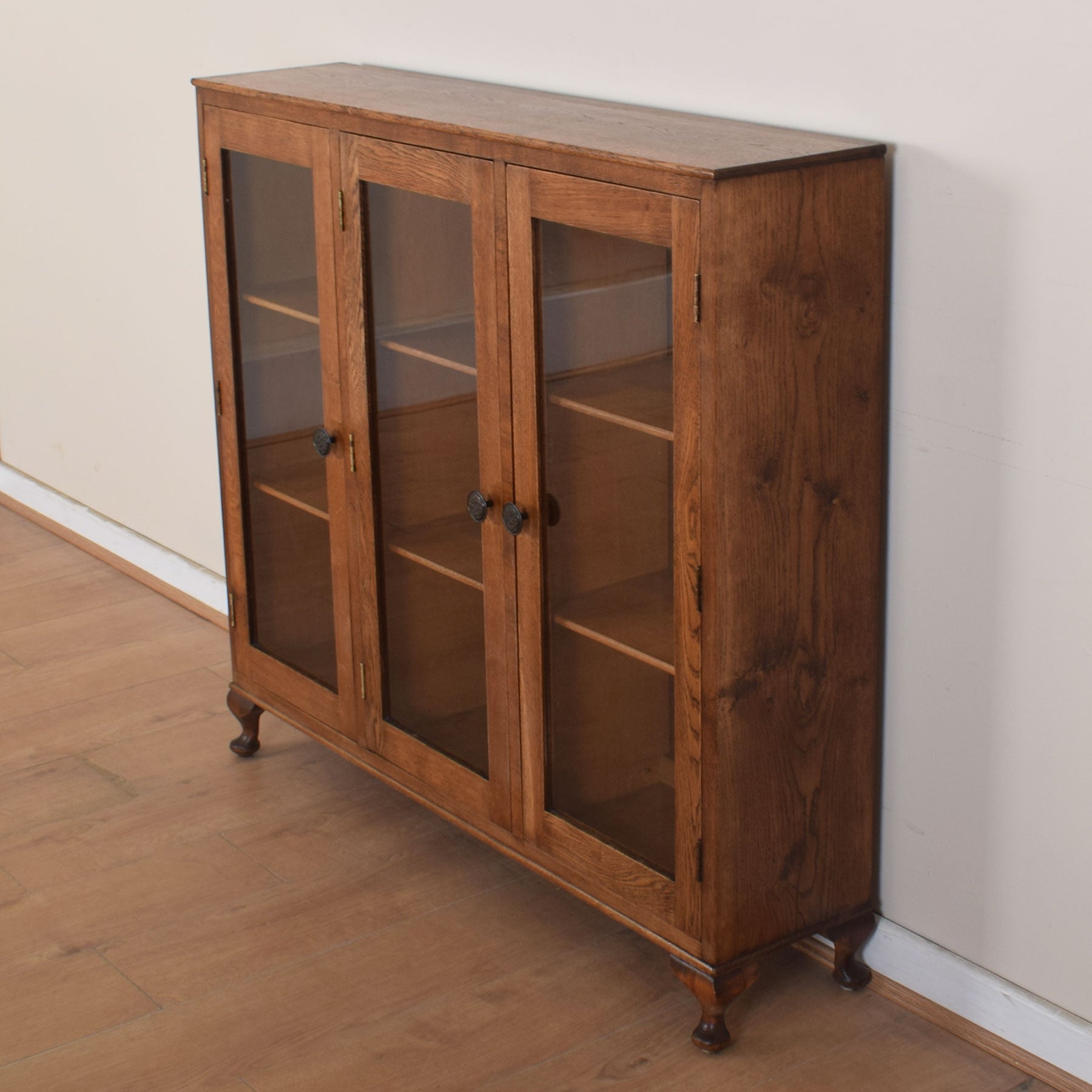 The beautifully oak-grained cabinet top has space for a vase of fresh flowers along with treasured ornaments and family photographs. The cabinet below then comprises three separate compartments with full-height glazed doors, each with two fixed bookshelves plus the bottom shelf space. This piece is made largely of oak with a hardboard back panel.