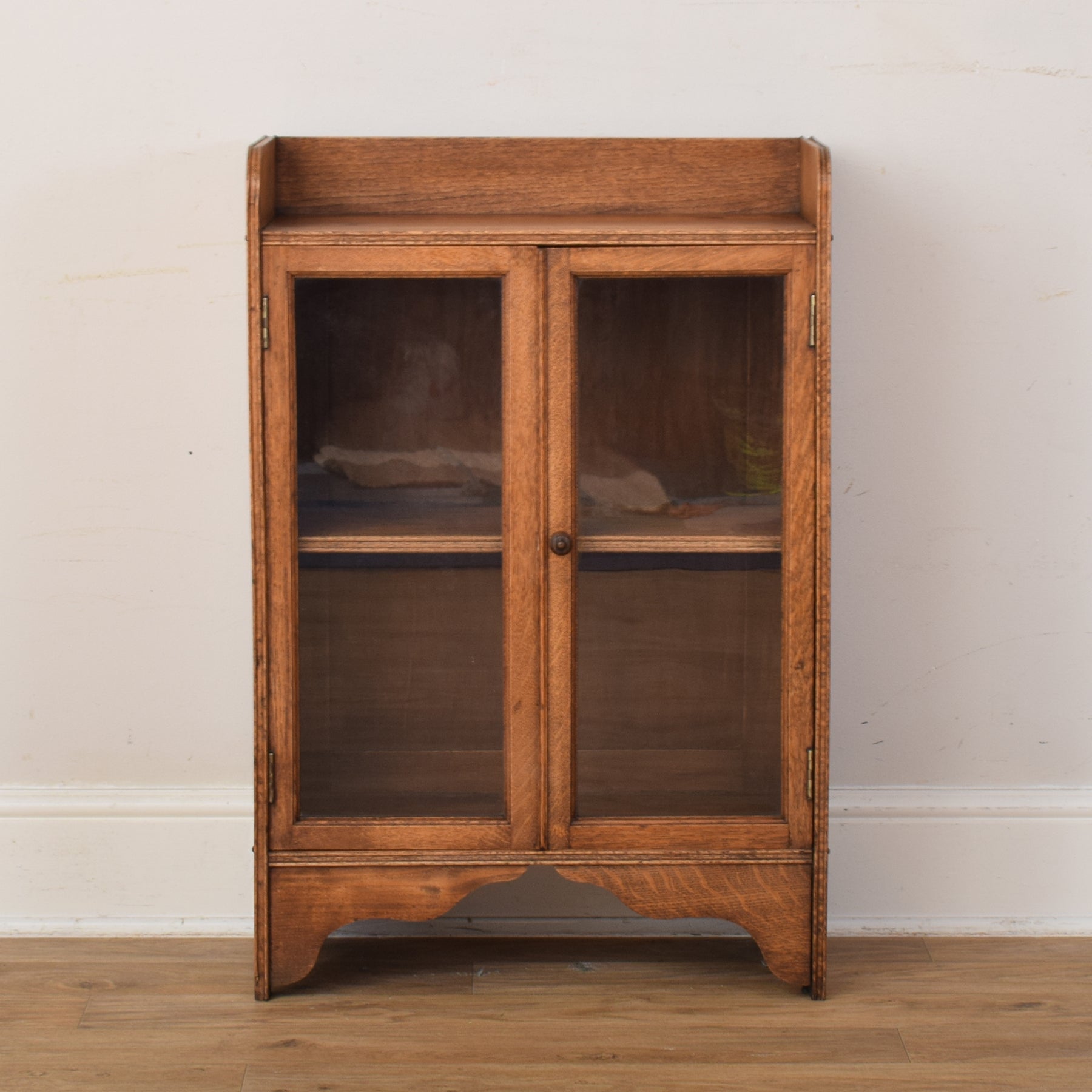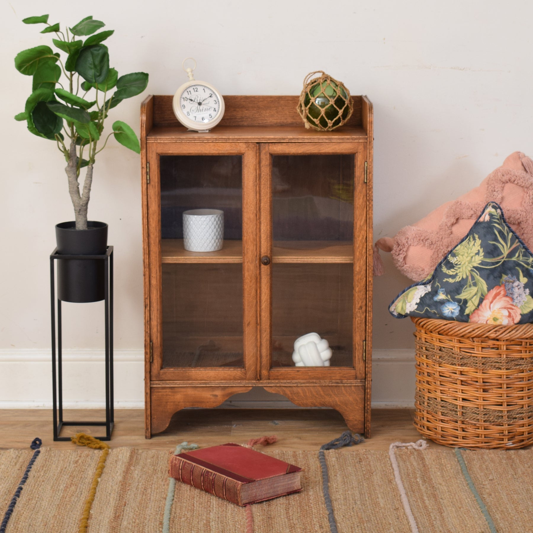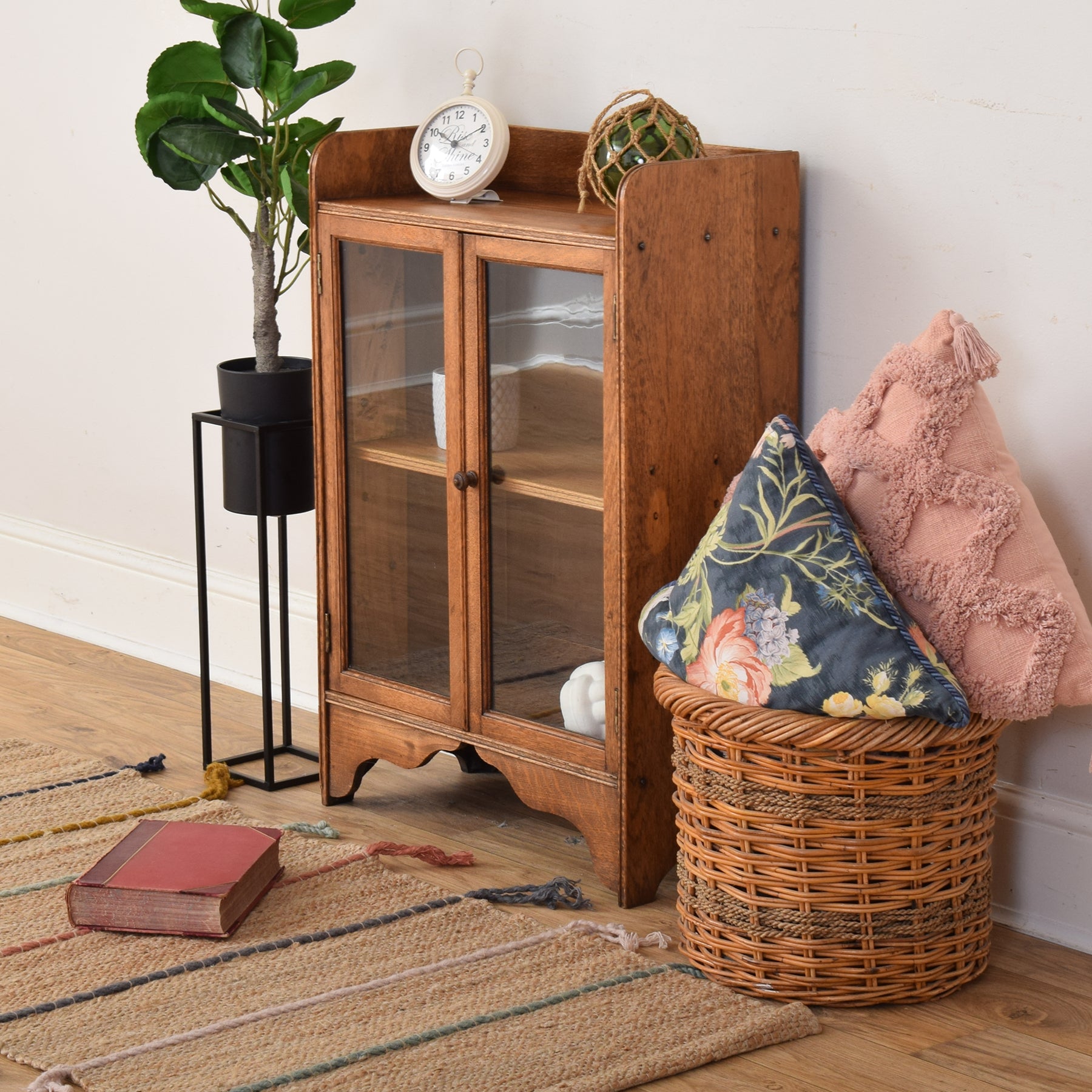 The cabinet features two glazed doors with an internal shelf to maximise storage space, and a shaped lower apron that adds a touch of character to its straightforward form. Its small size makes it ideal for use as a display unit or side piece in more compact rooms, bringing both practicality and charm.