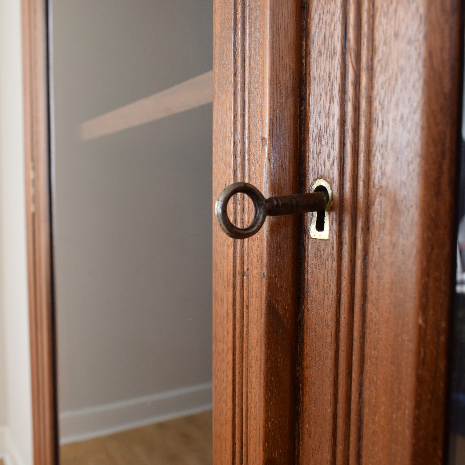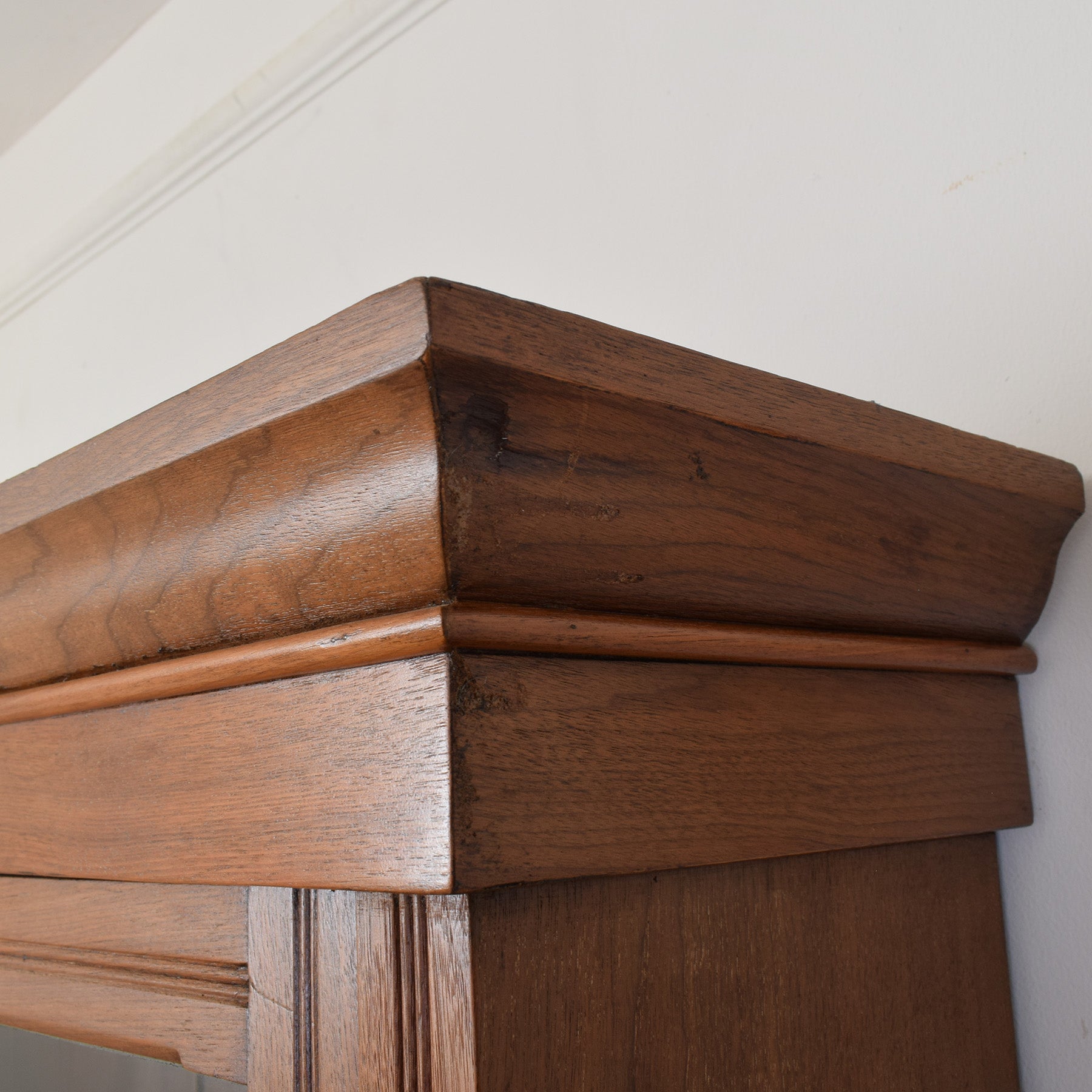 The previous darker stain has been stripped, and then multiple coats of hard-wearing matte lacquer have been applied, providing a durable long-lasting finish while also accentuating the natural mahogany grain. There is a visible split to the side of the lower section, as shown in the photographs. This cabinet is made entirely from solid mahogany, and the drawer bases are made from plywood.