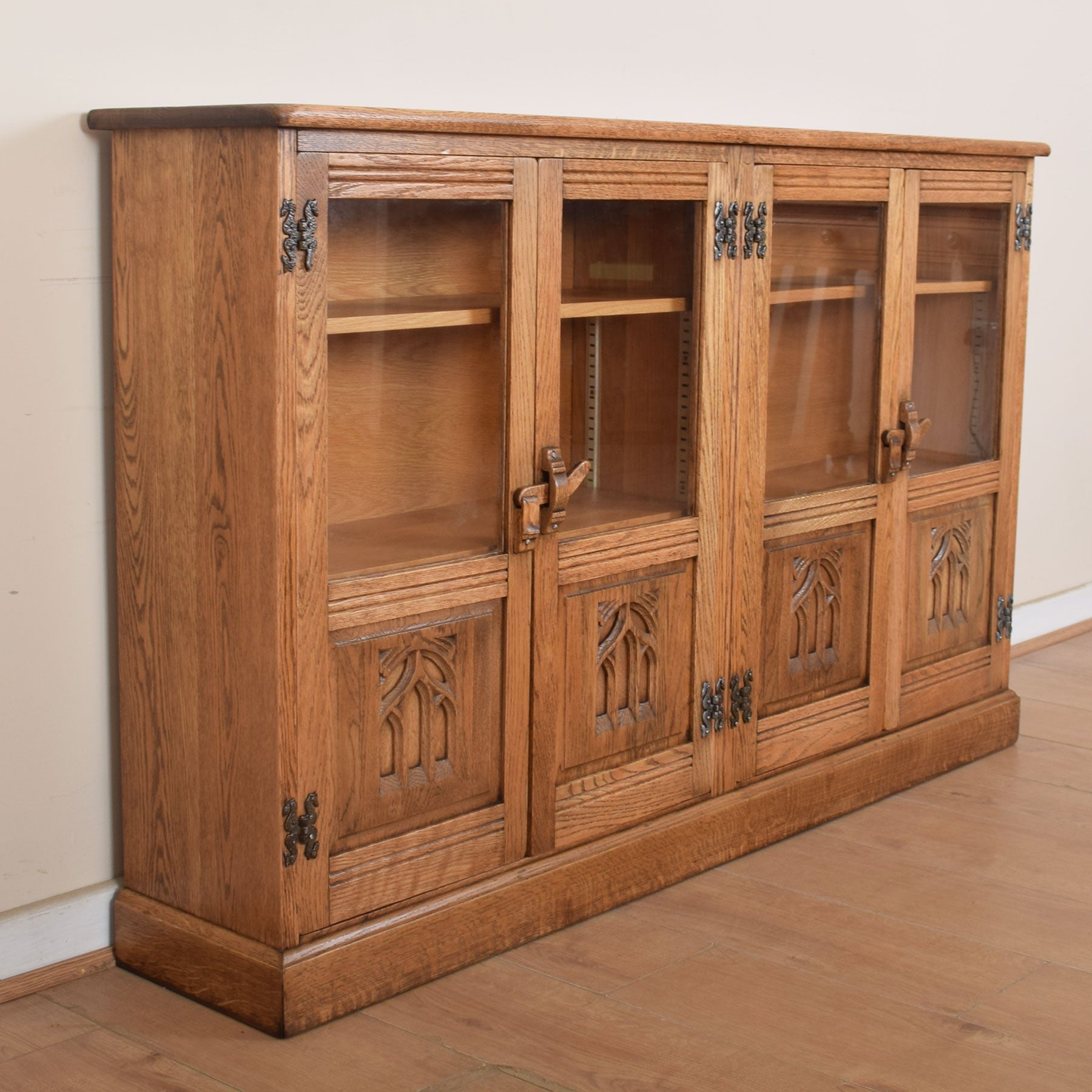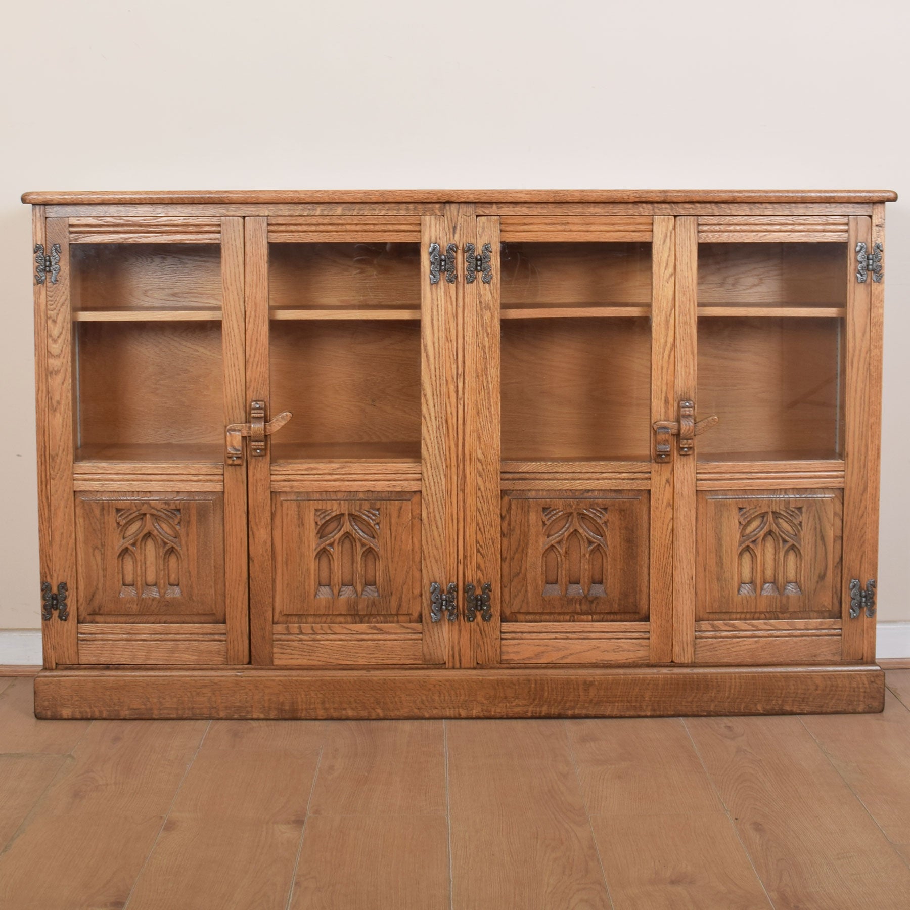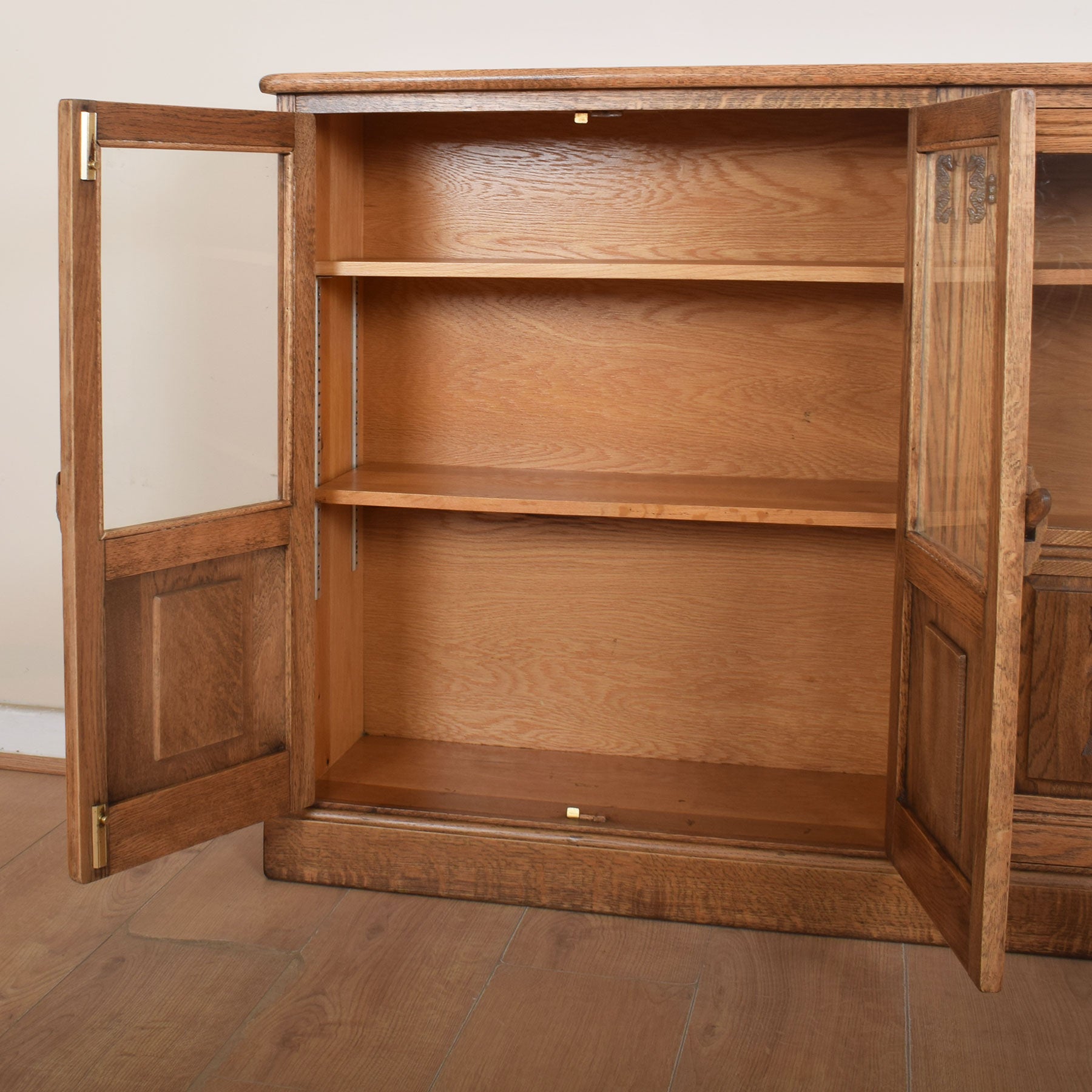 The cabinet top, featuring a richly oak-grained surface, provides ample space for cherished ornaments and photographs, as well as a vase of fresh flowers or a bowl of fruit. Beneath, the cabinet is designed with two part-glazed, two-door cupboards, each equipped with a central height-adjustable shelf positioned above a fixed lower shelf, complemented by an additional storage shelf underneath. This cabinet, crafted with quality, is constructed from oak and includes oak-veneer panels and a plywood back.