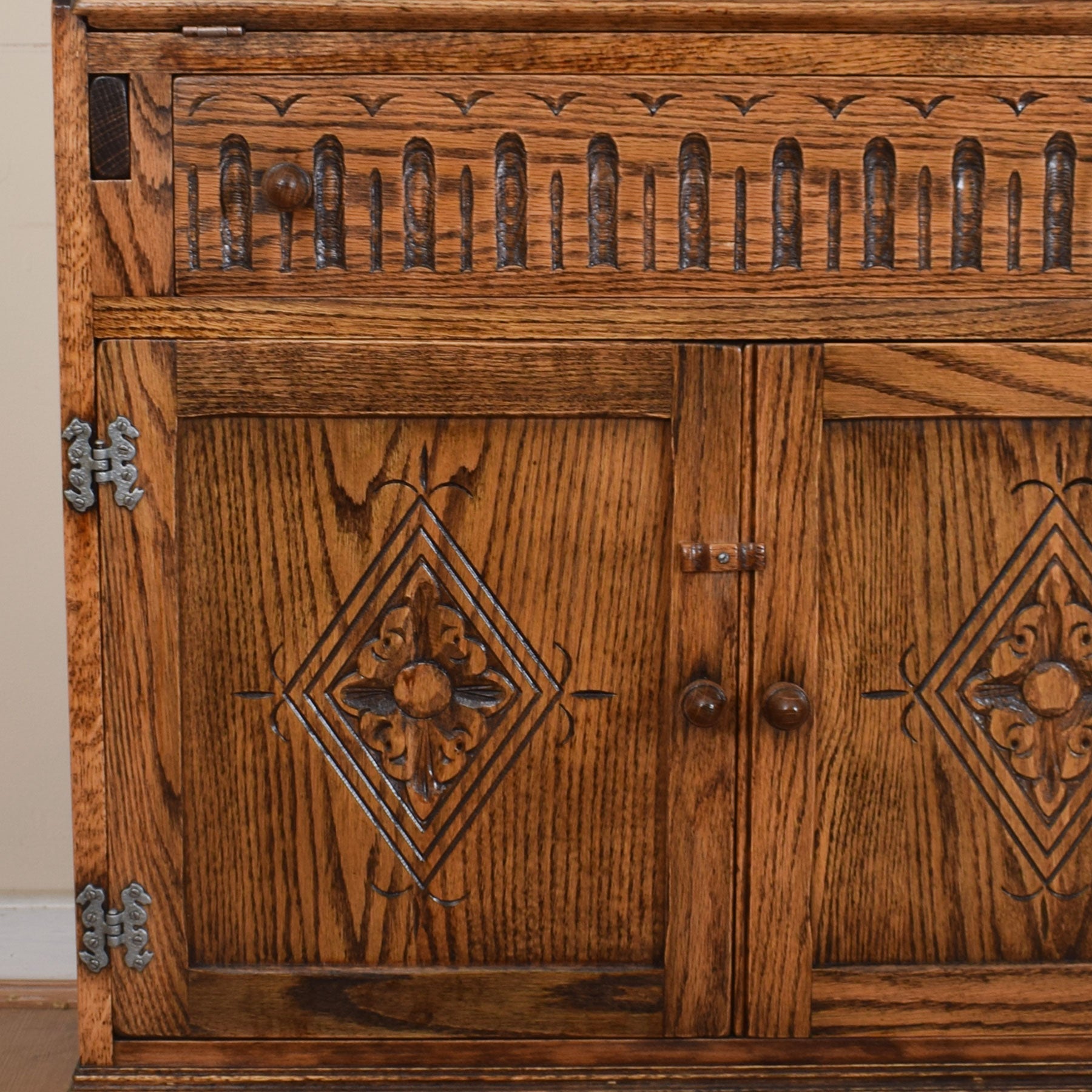 Our restoration workshop has stripped the original varnish from this piece before applying a professional matt lacquer that enhances the rich oak character and provides a level of everyday protection. The dimensions show the maximum depth and the total height of this unit with the bureau lid closed, followed in each case in brackets by the total depth and the height of the writing surface with the bureau lid open and resting on the support arms.