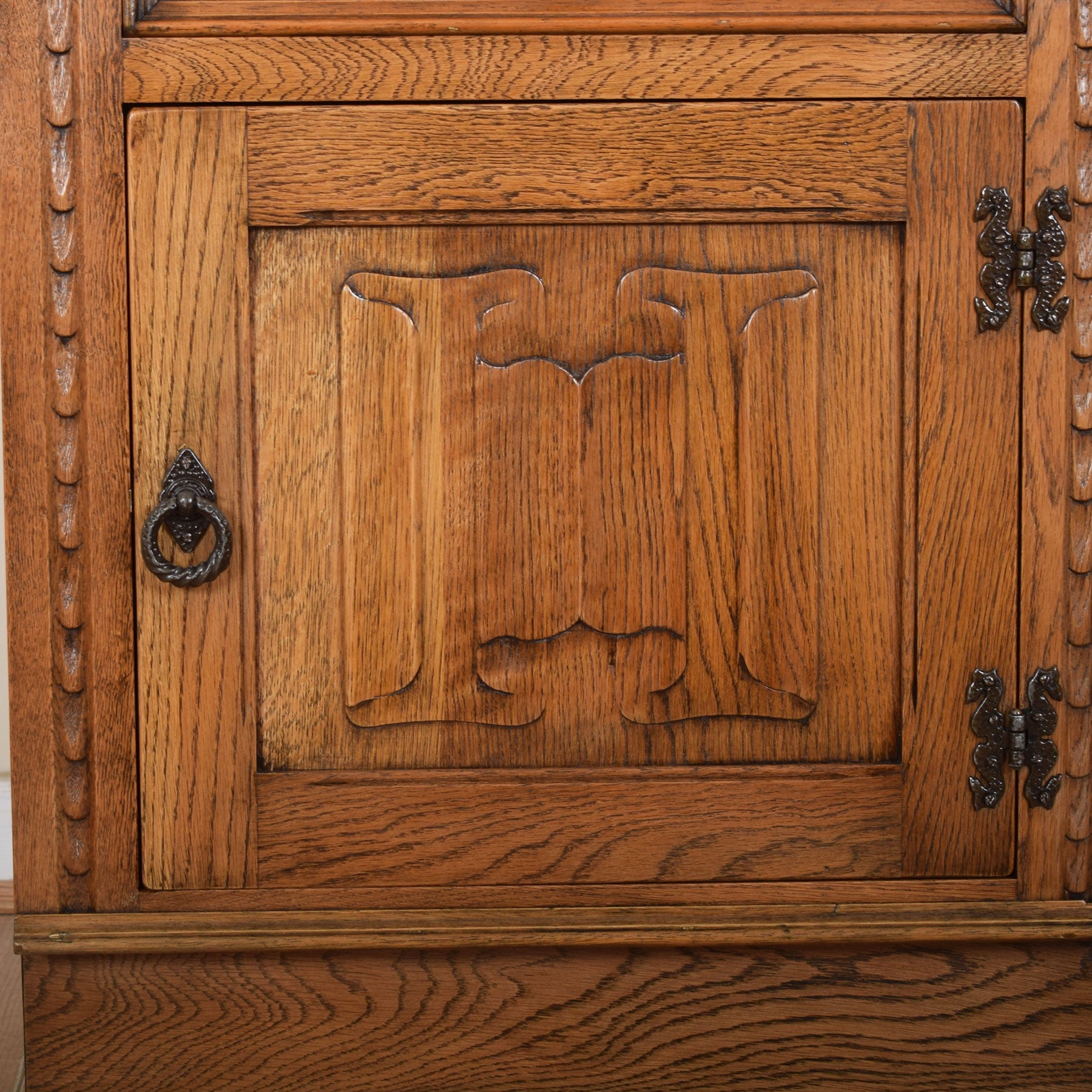 Our restoration workshop has meticulously stripped and cleaned this cabinet prior to applying a matte lacquer finish, which not only enhances the oak's colour and grain but also offers a substantial level of everyday protection. As illustrated in the photographs, there are some watermarks present on the top of this piece. There is also a small amount of damage located on the lower rear section of this item. This cabinet is made from a combination of solid oak and oak veneer, with plywood utilised for the drawer base and the back of the piece.