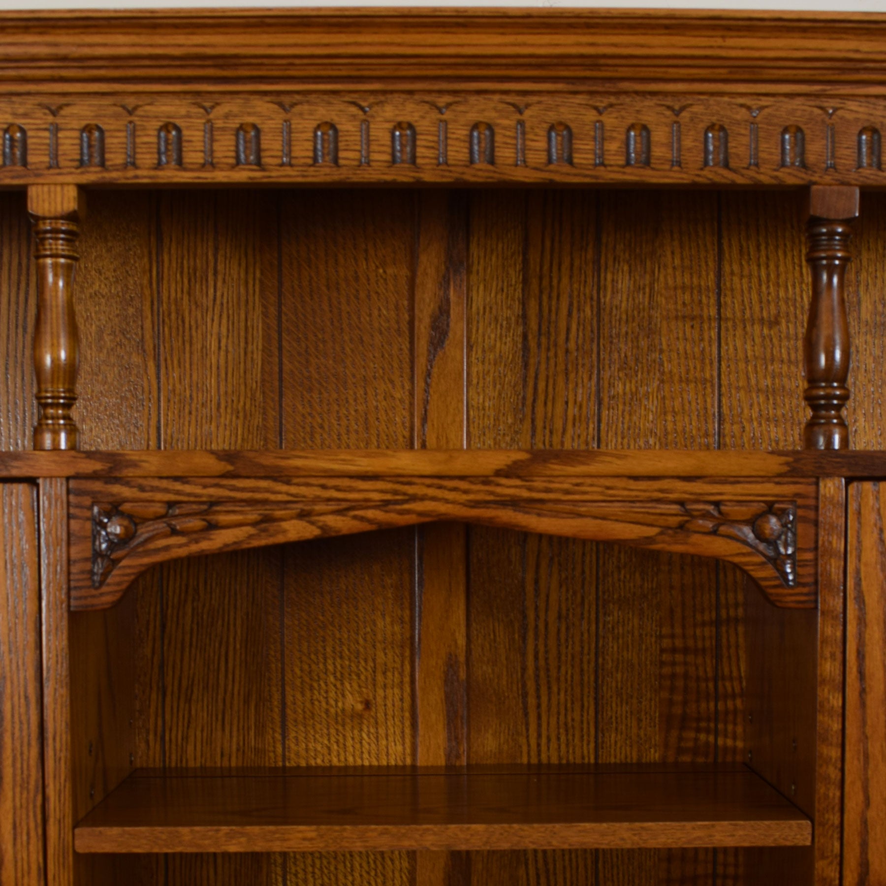 The upper display area features a top shelf. On either side, there are two cupboards with glazed doors and shelves next to a central shelving section, all crafted with grooves for decorative plates, along with two drawers located in the upper section. This setup is supported by the elegantly grained surface of the sideboard, which offers ample space for a fruit bowl or a vase containing fresh flowers, as well as family photographs and treasured ornaments, complemented by three drawers and three doors revealing a spacious cupboard section ideal for storing various household items.