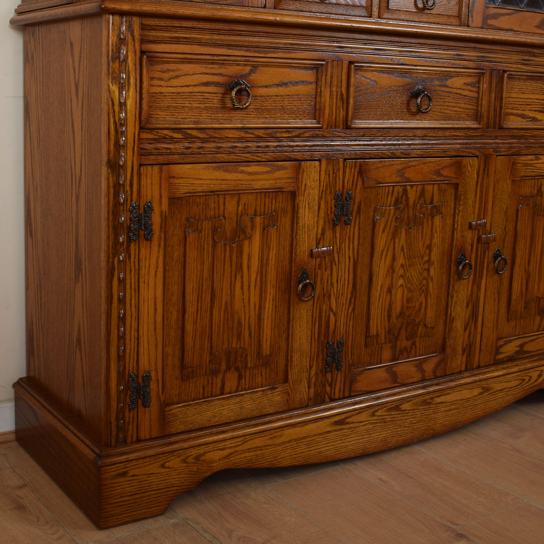 This beautifully made dresser has been stripped by our restoration workshop before receiving a fresh matte lacquer finish. This enhances the colour and grain of the oak and also provides a good level of protection in everyday use. This piece is constructed of a mixture of solid oak, oak veneer, and plywood used for the back of the piece and base of the drawers. It should be noted from the photographs that there is a slight mark on the central lower door, although this does not detract too much from the overall appearance of the item.
