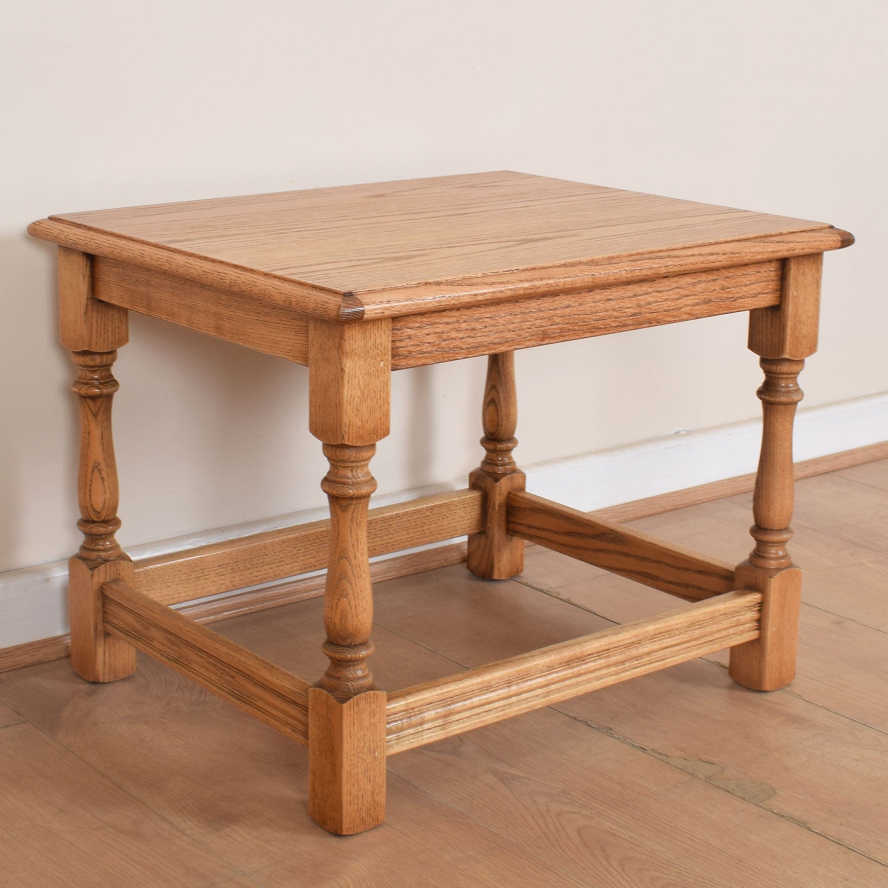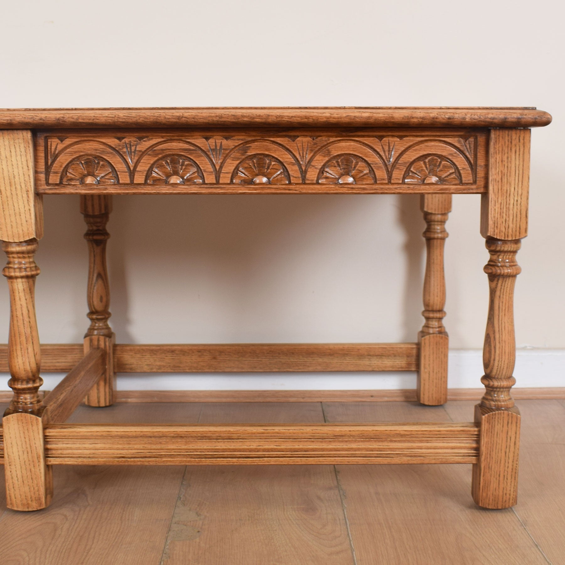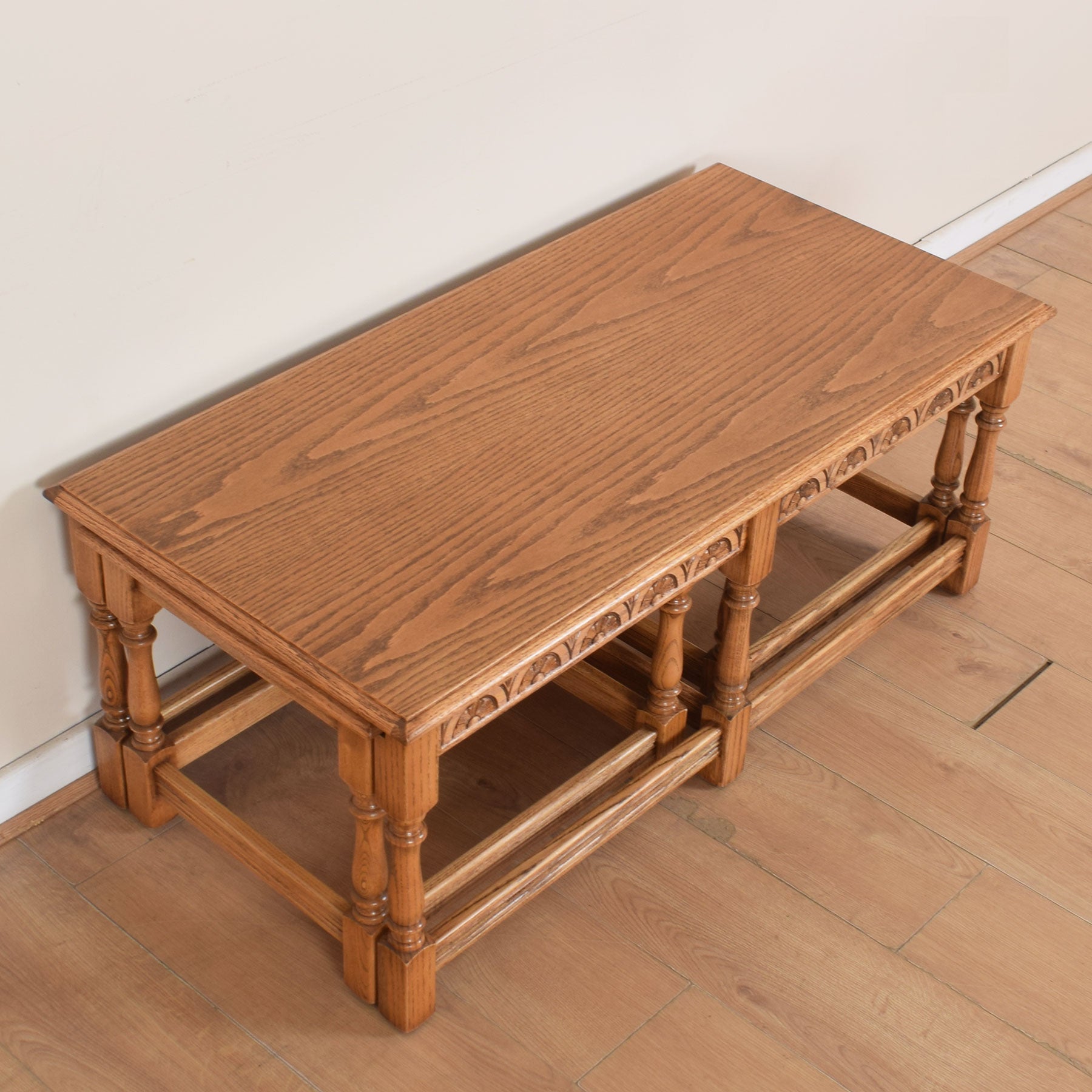 The larger coffee table has a generous amount of space to serve tea or coffee, while the smaller tables are ideal for resting a drink or a favourite reading book. When not in use, the two smaller tables slide into the frame of the larger, enabling this versatile set to be moved and stowed as a single unit. This quality-made piece is solid oak.