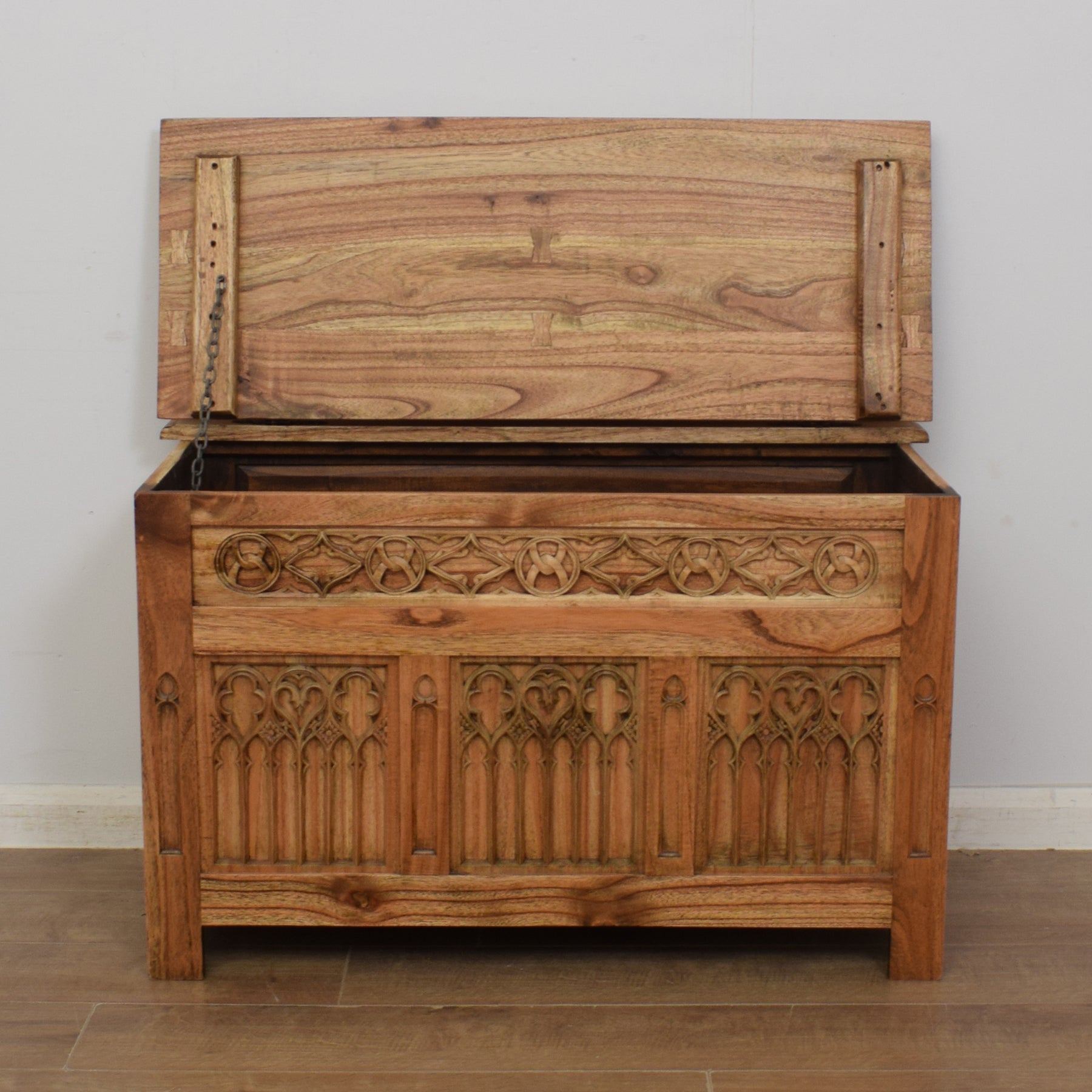 The body of the box consists of a heavy, solid ash wood frame with a beautifully elaborate carved front. The space inside is a good size for storing away a few pairs of shoes, blankets or linen. The sturdy top opens and closes on a hinge and is a good size for a small collection of ornaments.