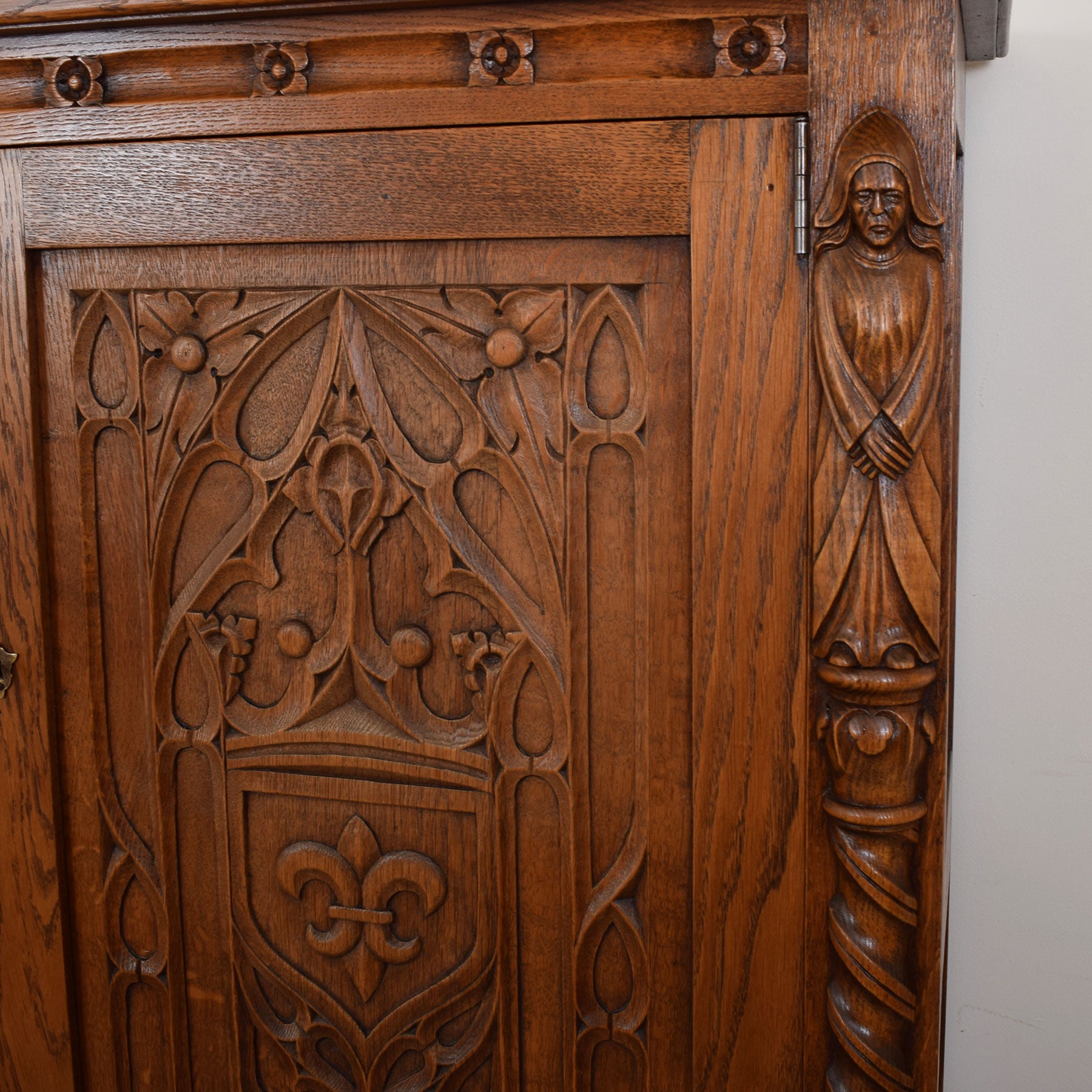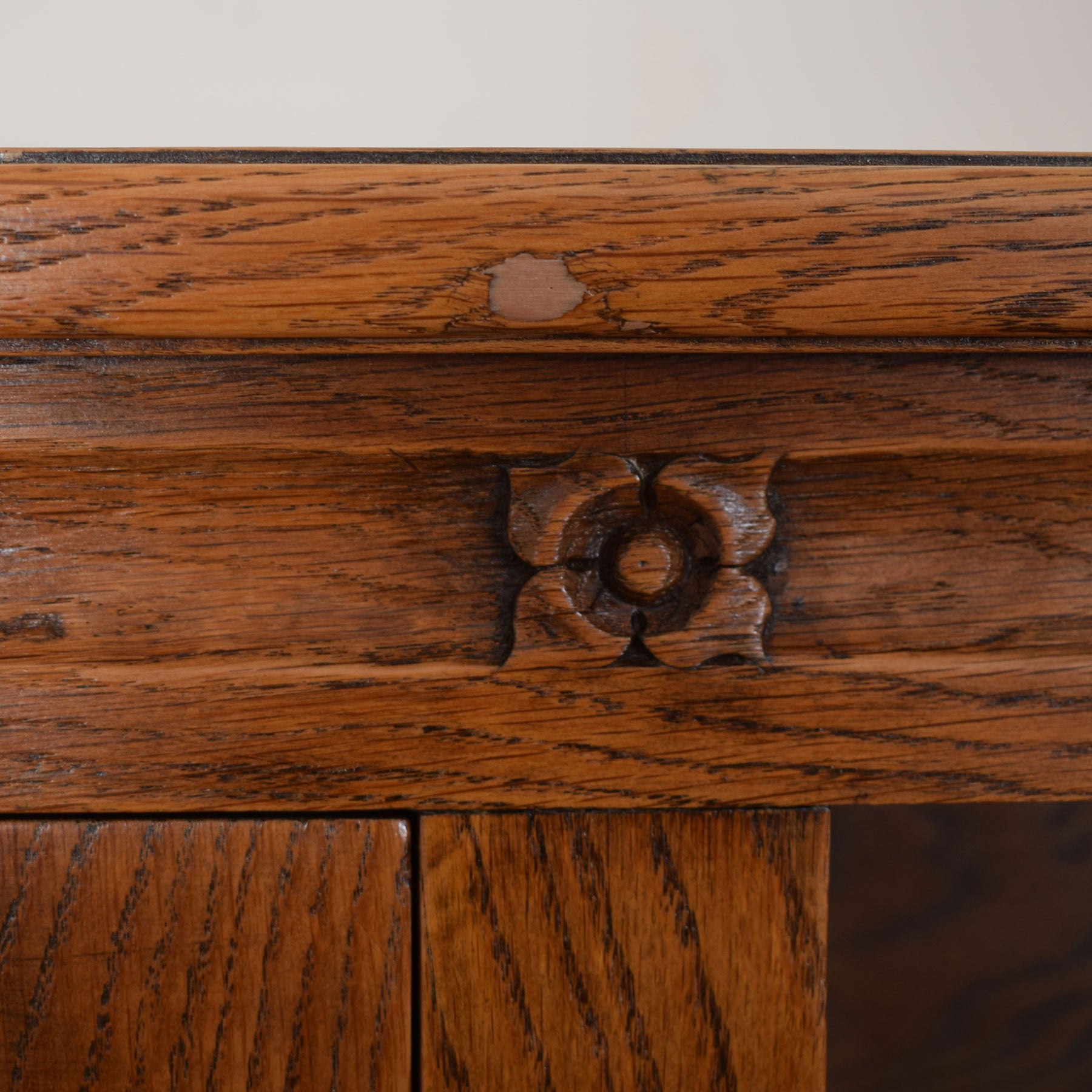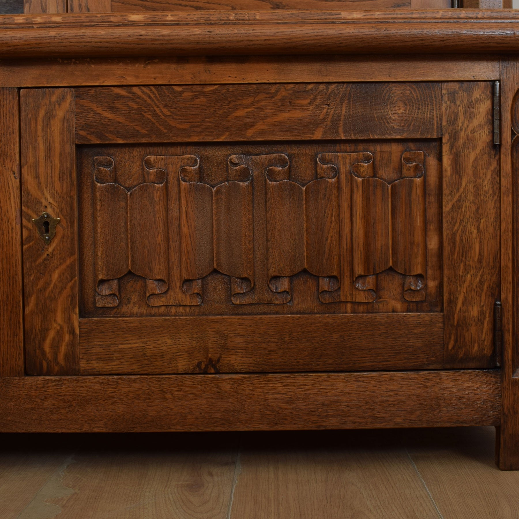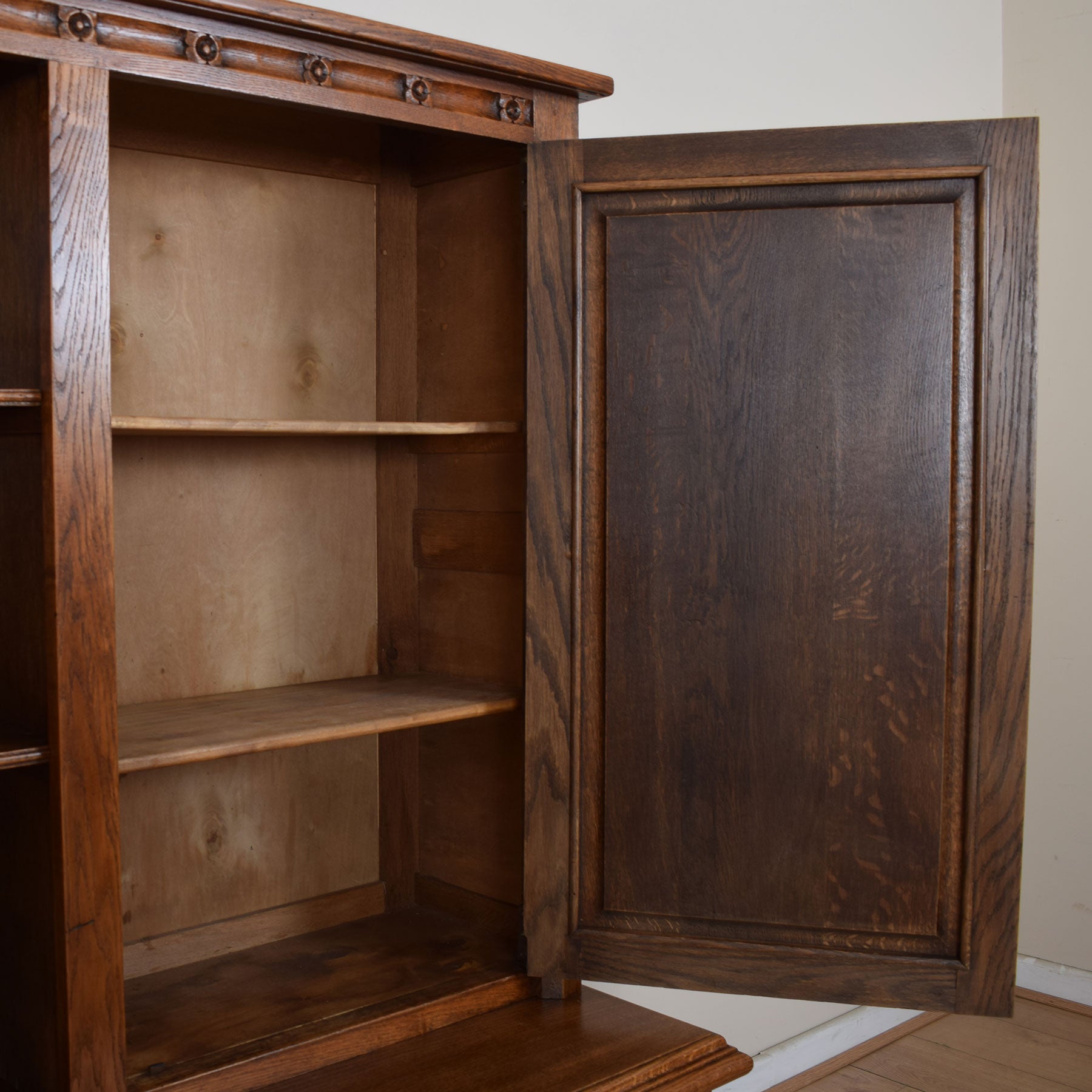 The upper section comprises a central open shelved space that is ideal for selected books and treasured ornaments. On either side of this is a single-door cupboard, each with two fixed shelves. The lower section then includes three single-door cupboards offering further storage for various items. This exquisite piece is largely solid oak with oak veneered panels.