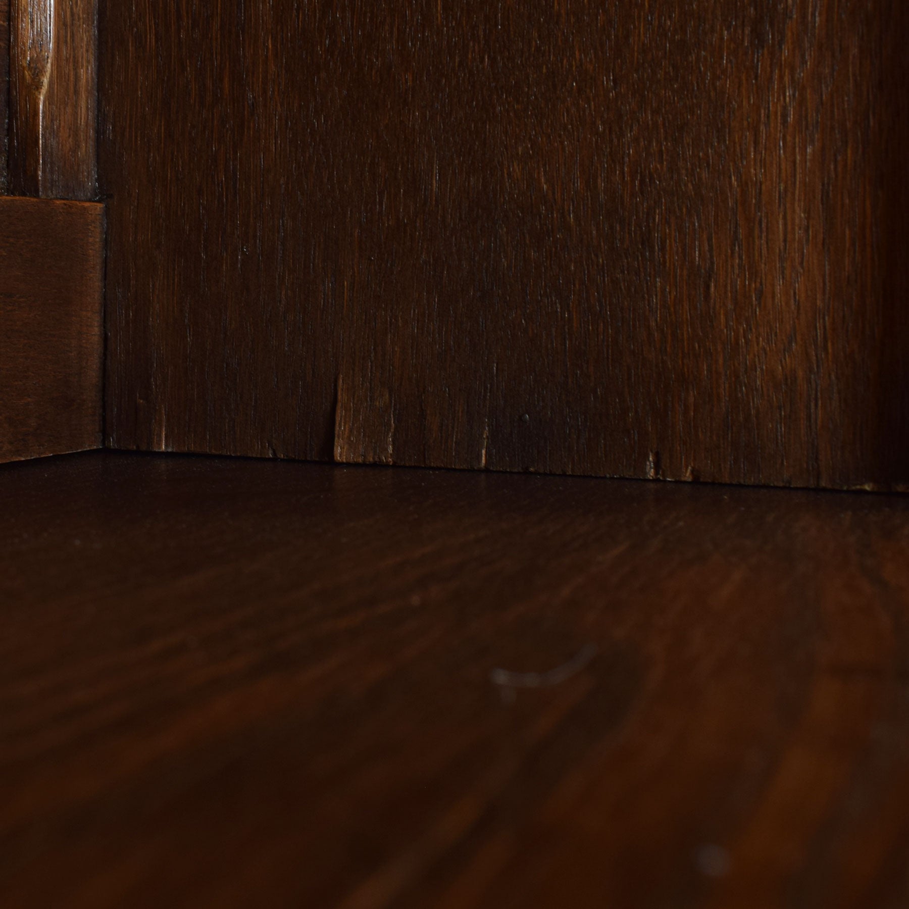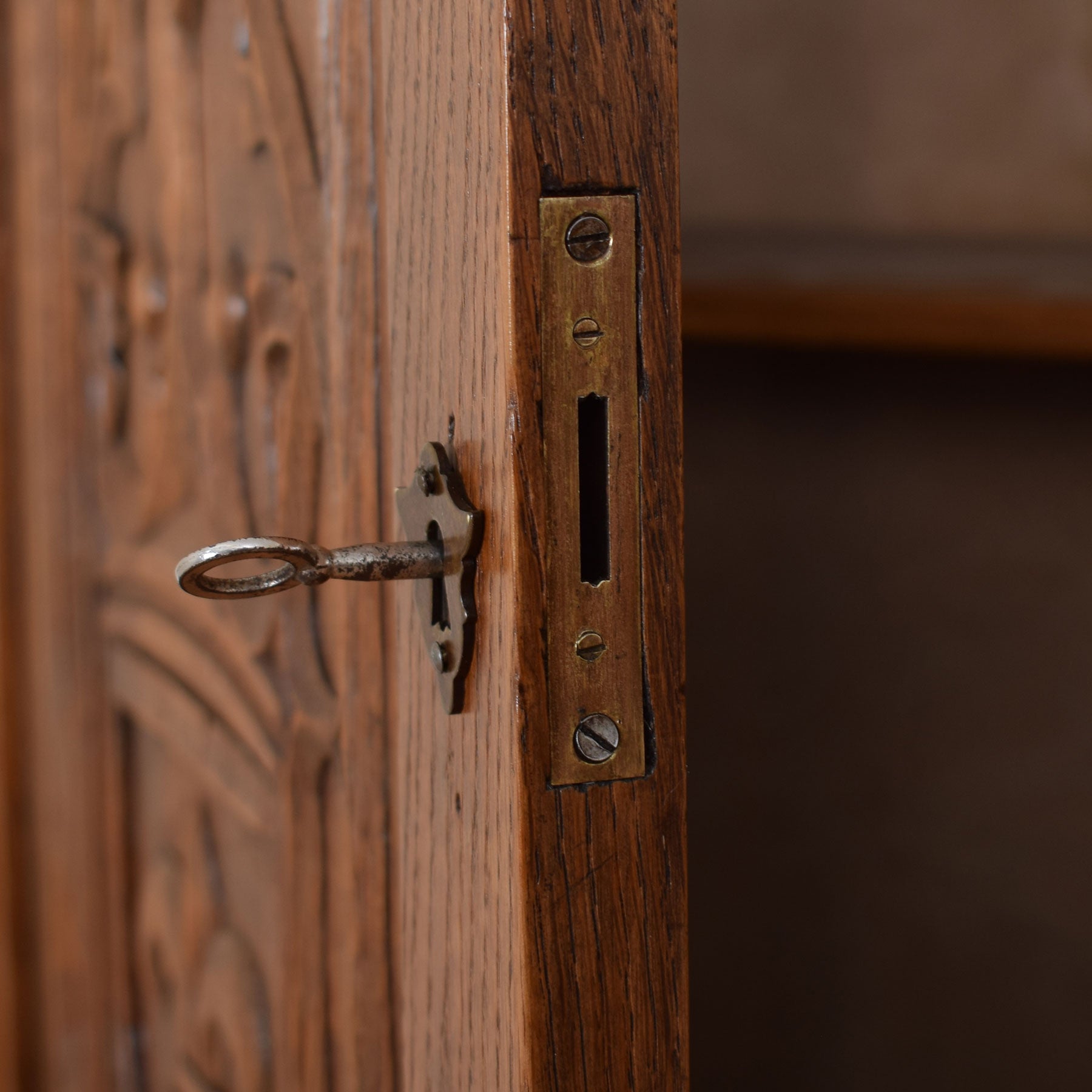 Our restoration workshop has stripped the original varnish from this item before finishing with a professional matt lacquer that enhances the rich colour and grain of the oak, as well as providing a good level of everyday protection. It should be noted from the photographs that there are some imperfections with this piece, notably marks on the top surface, some veneer damage on the bottom of the open-shelved section, missing internal lock components on the upper left door and missing escutcheon on the central lower door. The dimensions show the total height of this unit, followed in brackets by the height of the lower section only.