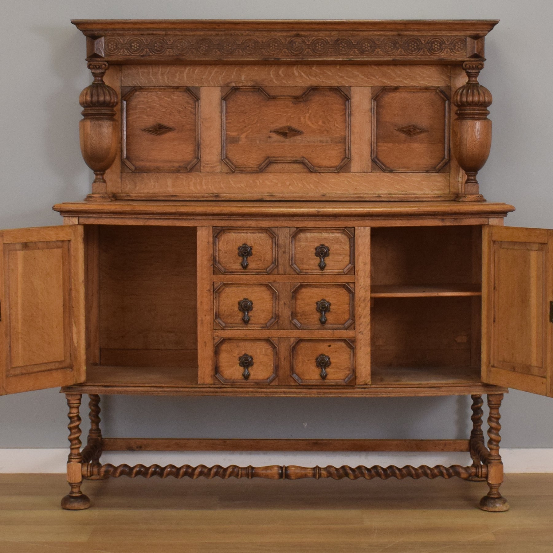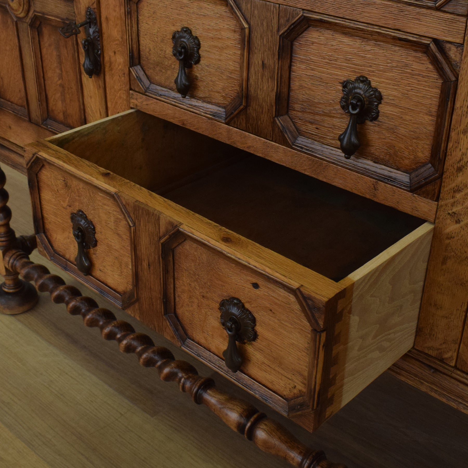 The piece features an eye-catching design, with a raised gallery back, carved detailing, and a deep oak grain throughout. Its layout includes two panelled cupboard doors, three central drawers with moulded fronts and decorative brass handles, and barley twist legs connected by matching stretchers. The carved back panel and turned finials add height and visual interest, making it perfect for formal dining rooms or large hallways where character and practicality are equally valued.