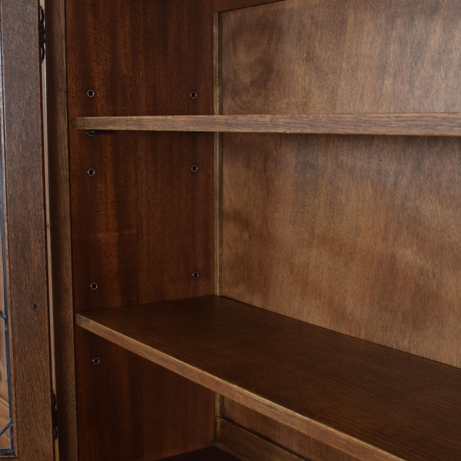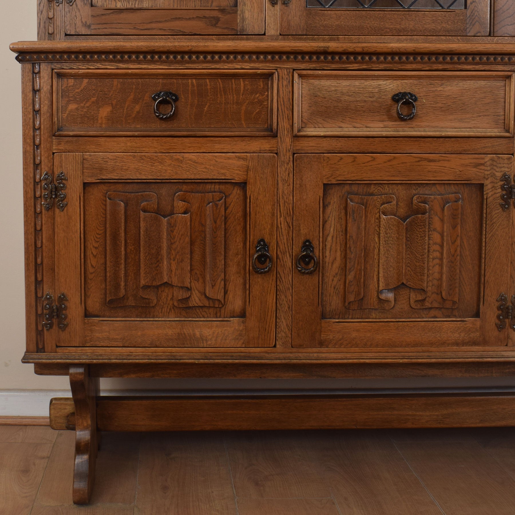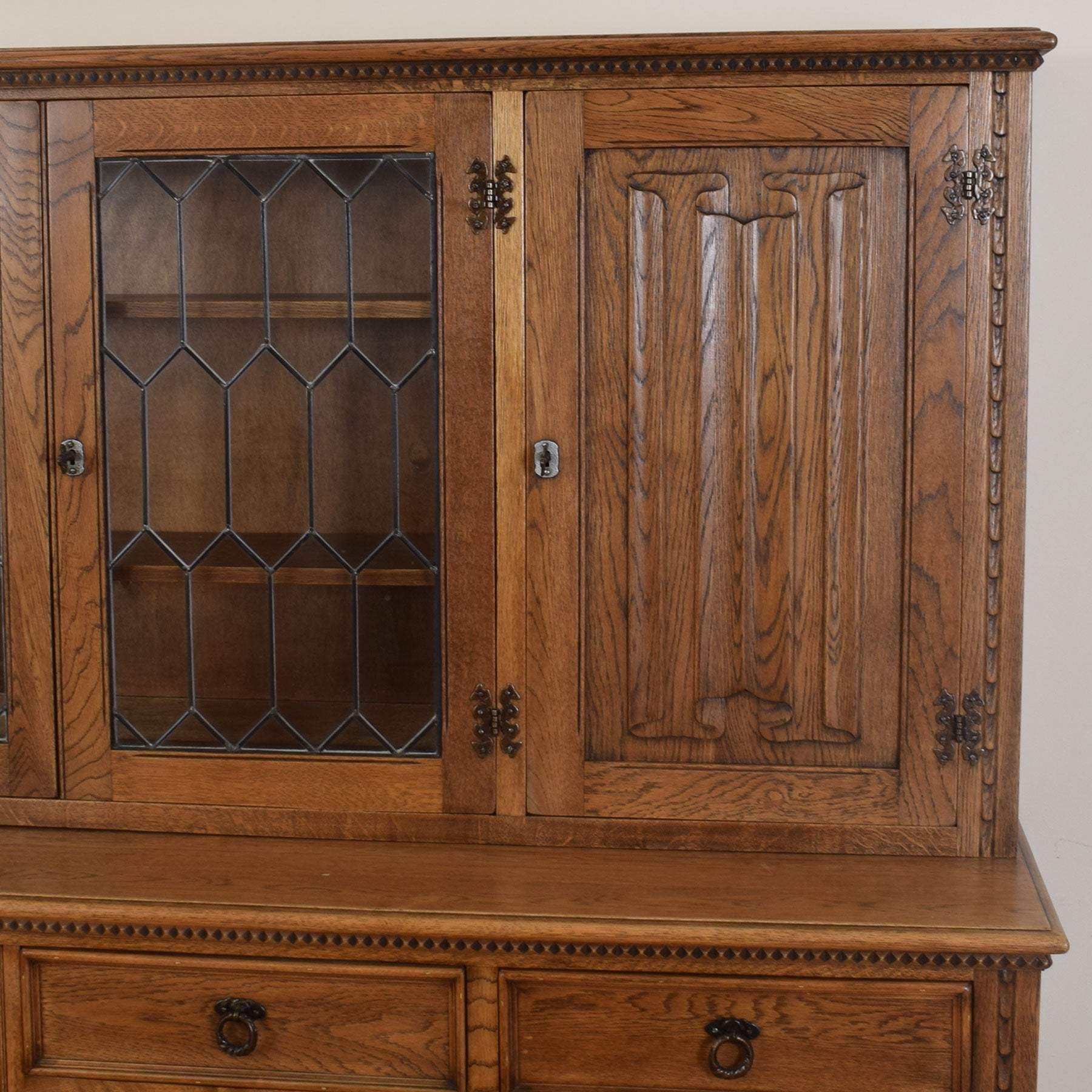 The upper part includes a spacious central display cabinet fitted with leaded glass doors and two adjustable shelves, ideal for displaying family photos or cherished ornaments. On either side of the central unit are large cupboards, each containing two smaller shelves on the inside. Below this setup, four drawers offer generous space for various household items. The lower section consists of two double cupboards for extra storage. All these components are situated beneath a sideboard top that showcases beautiful grain patterns.
