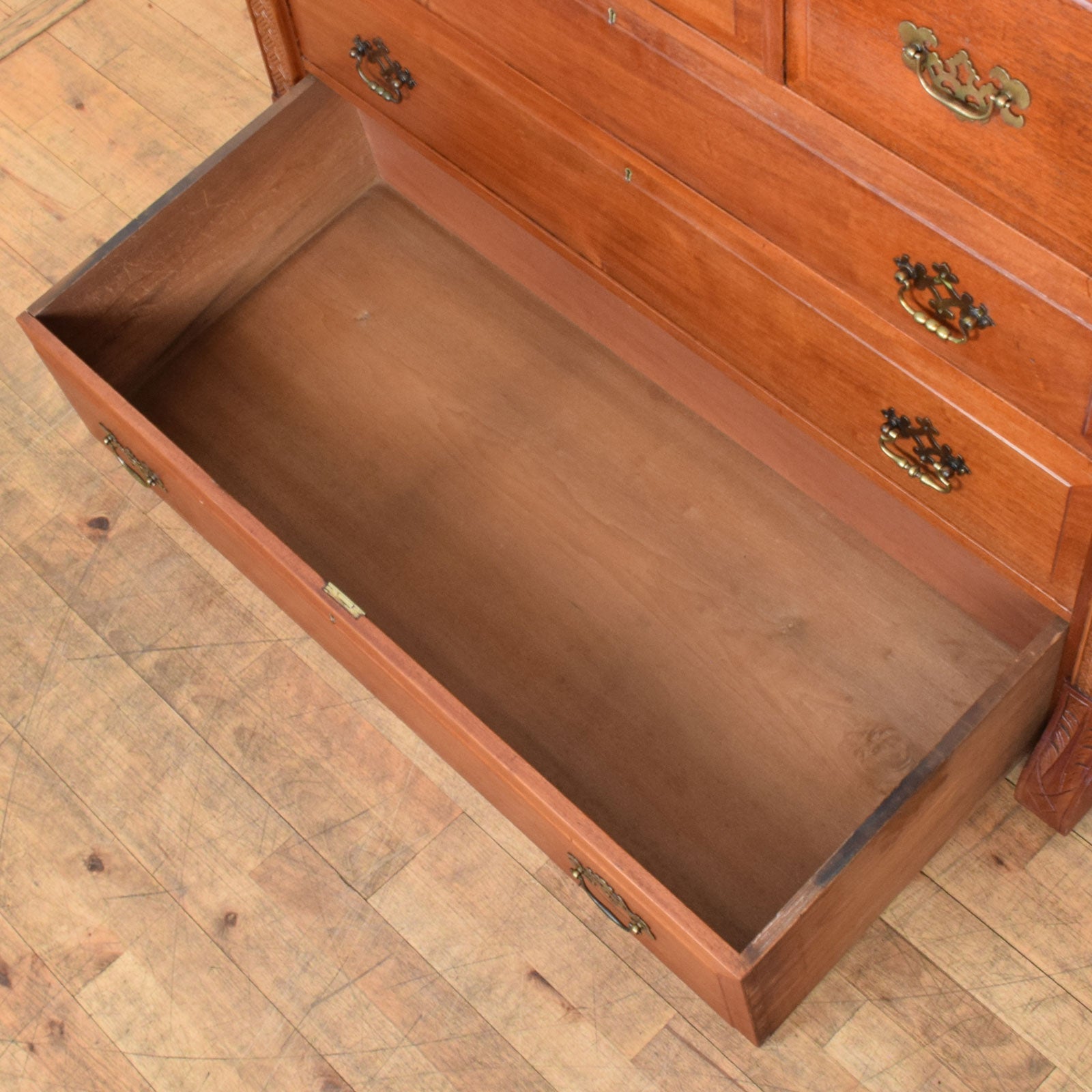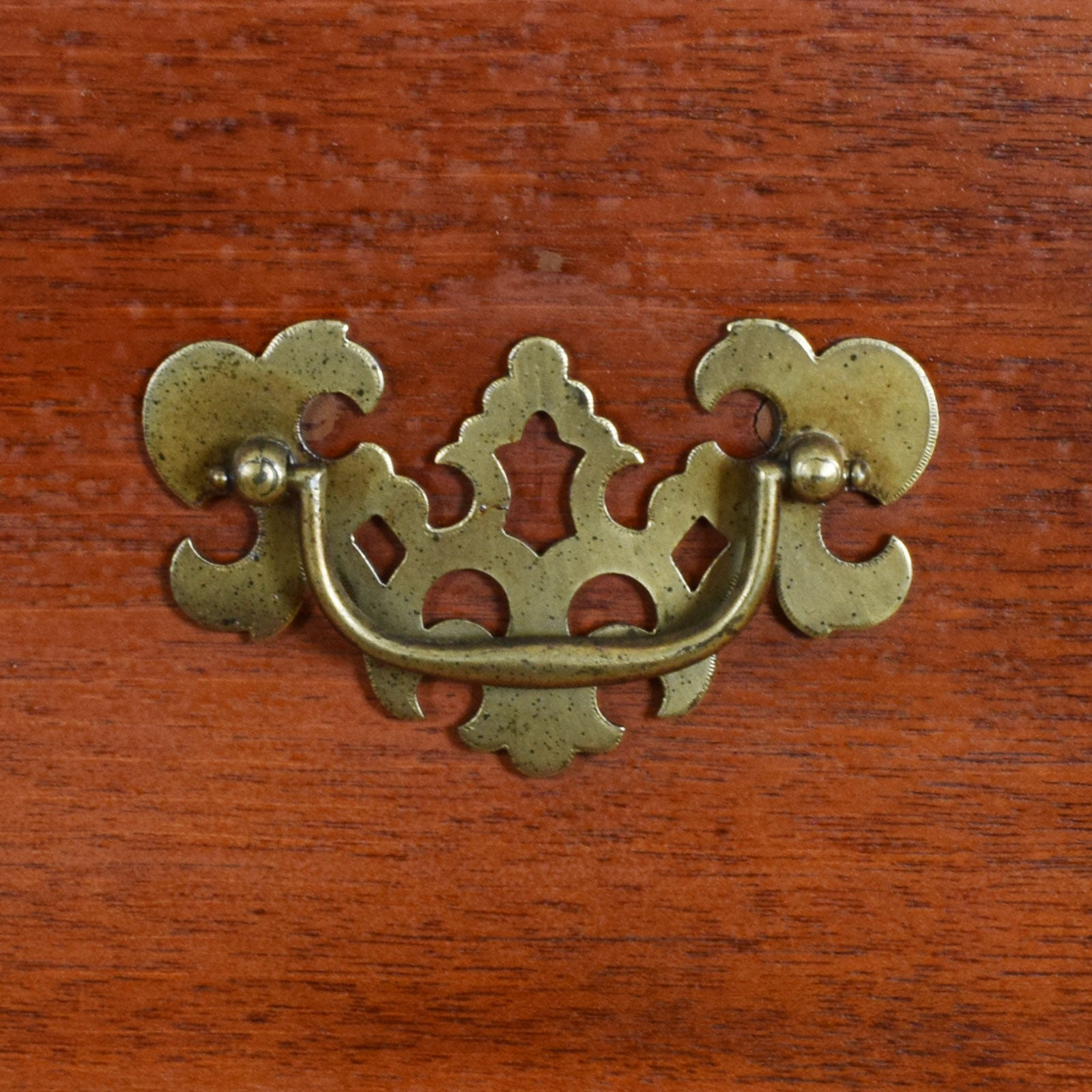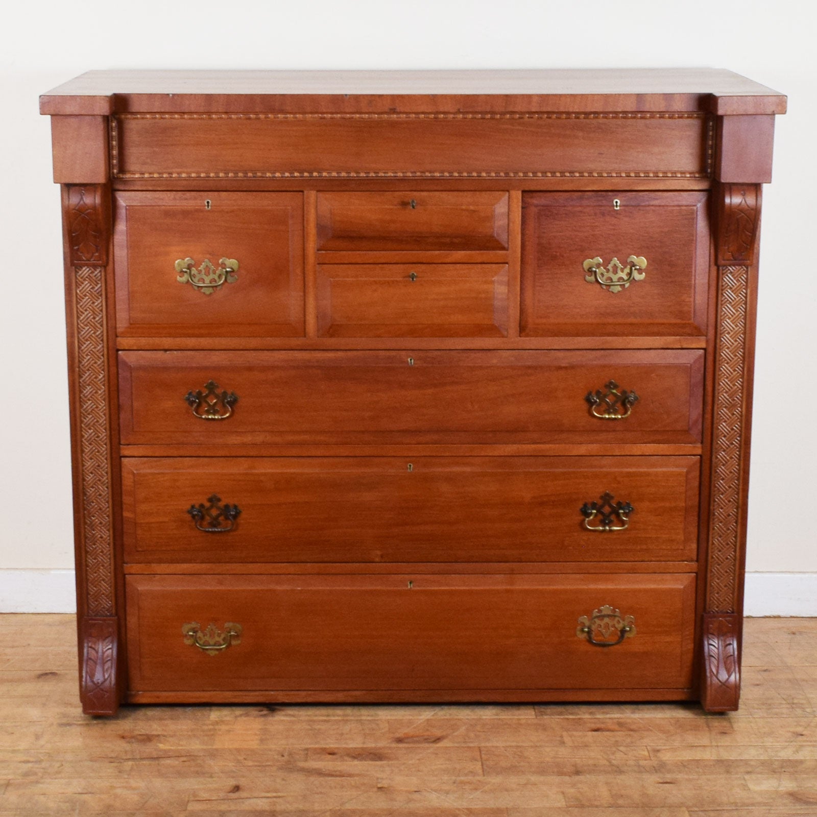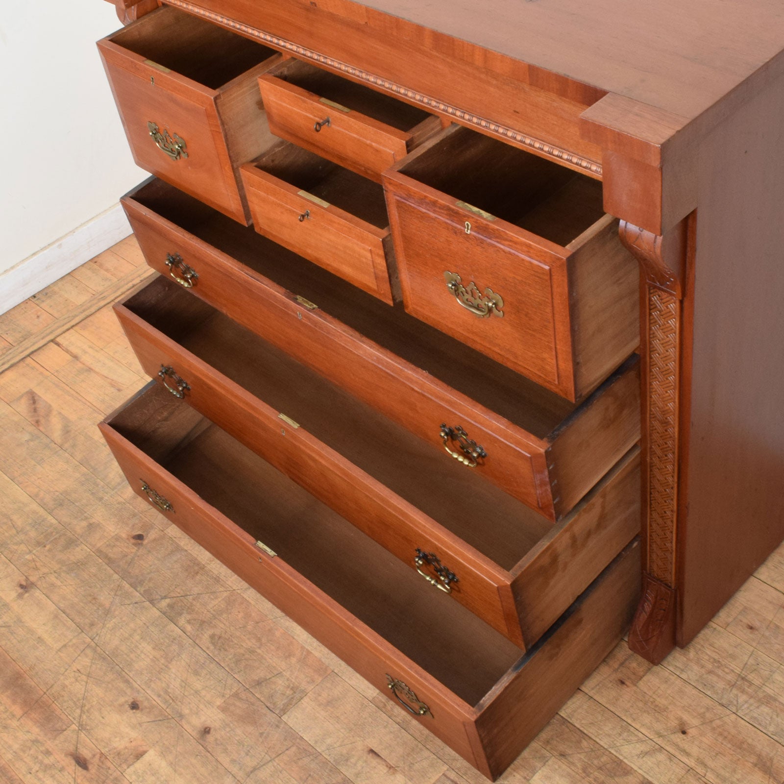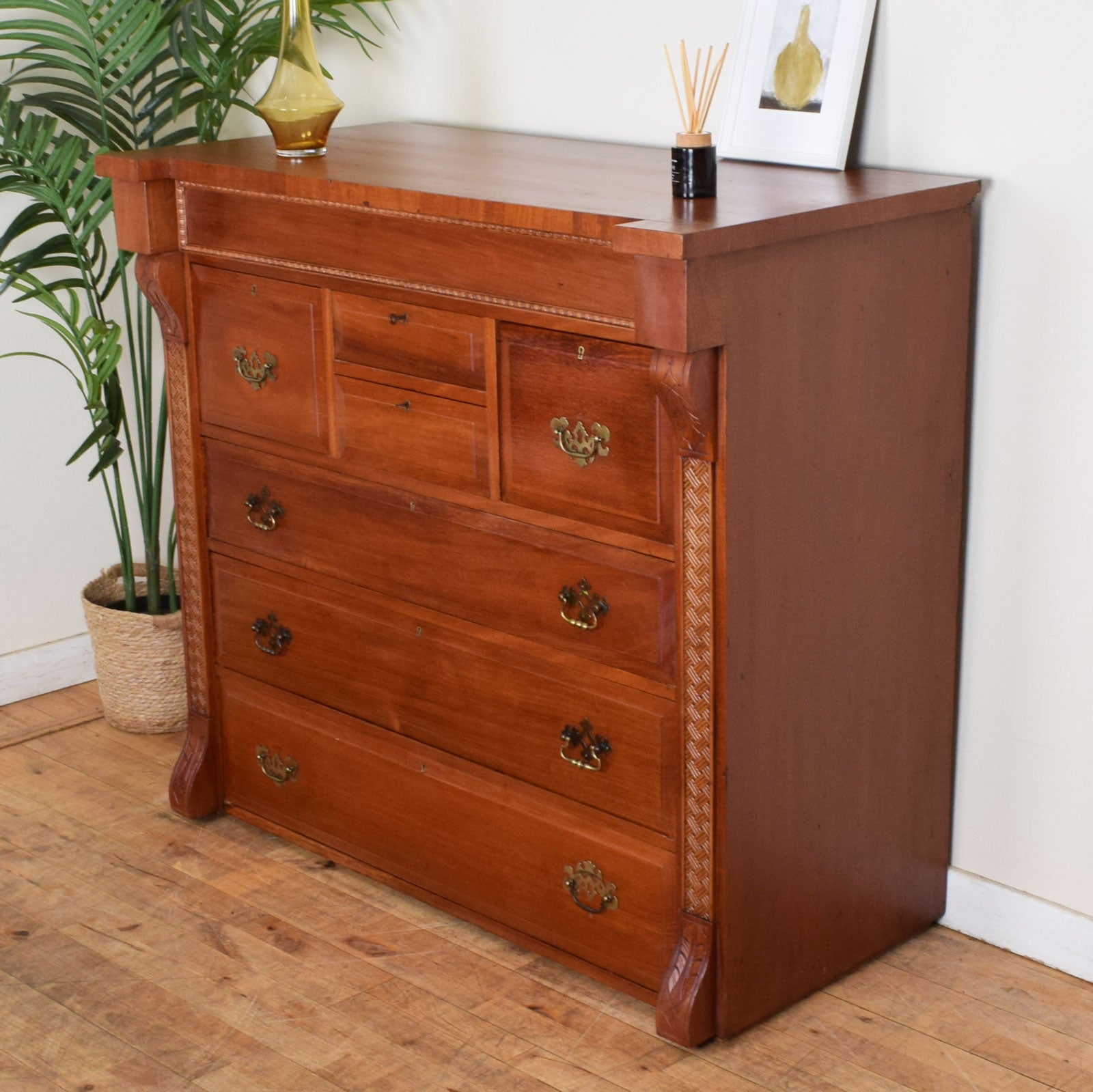 With seven visible drawers and one secret drawer, there is a good amount of storage space for a variety of needs around the home. The mahogany top is the ideal place for showcasing favourite family photographs or a vase of freshly picked seasonal flowers. to access the secret drawer at the top open the middle drawer at the top locate the flat piece of wood above and push up to release the drawer. There are watermarks and veneer damage around the top surface that can be seen in the pictures.