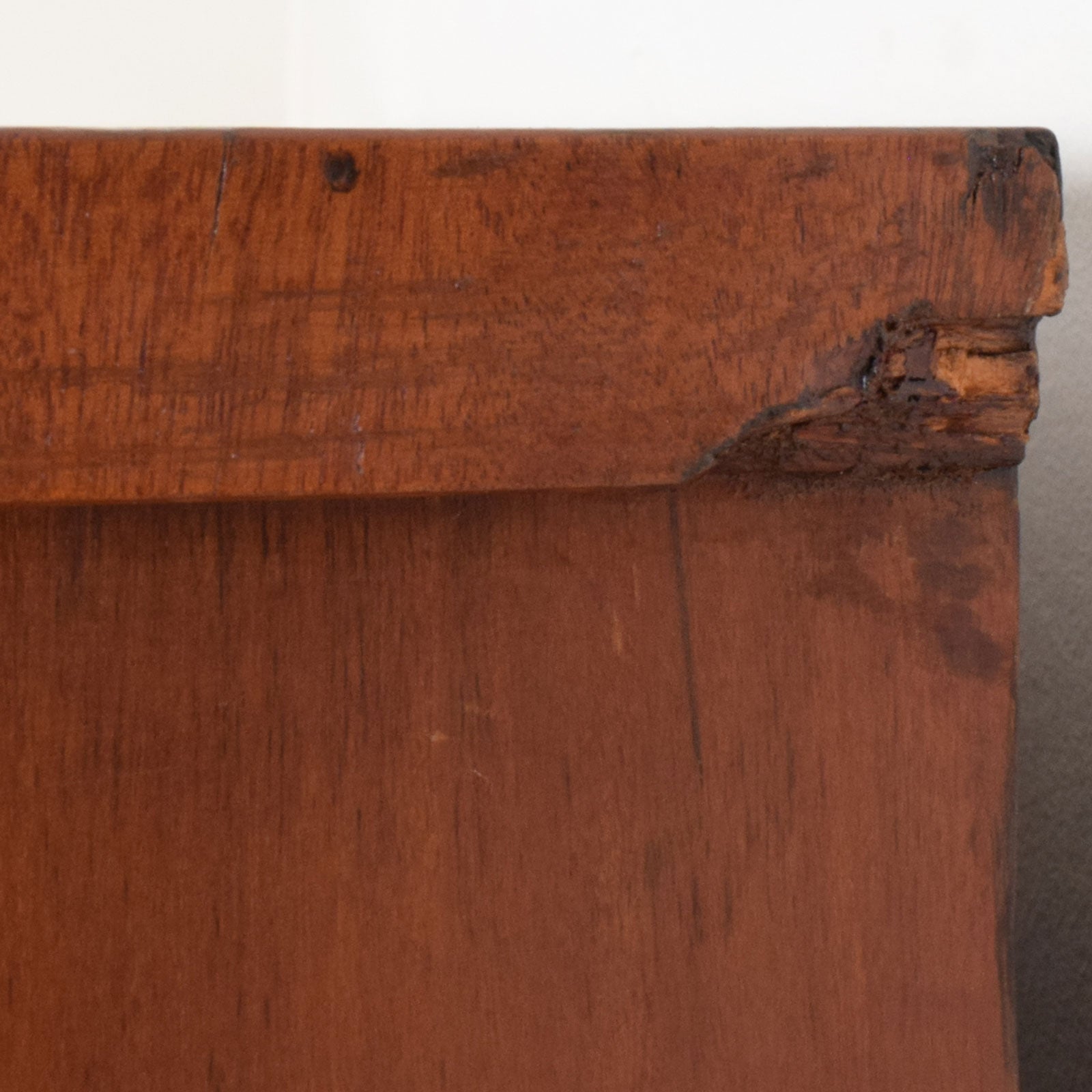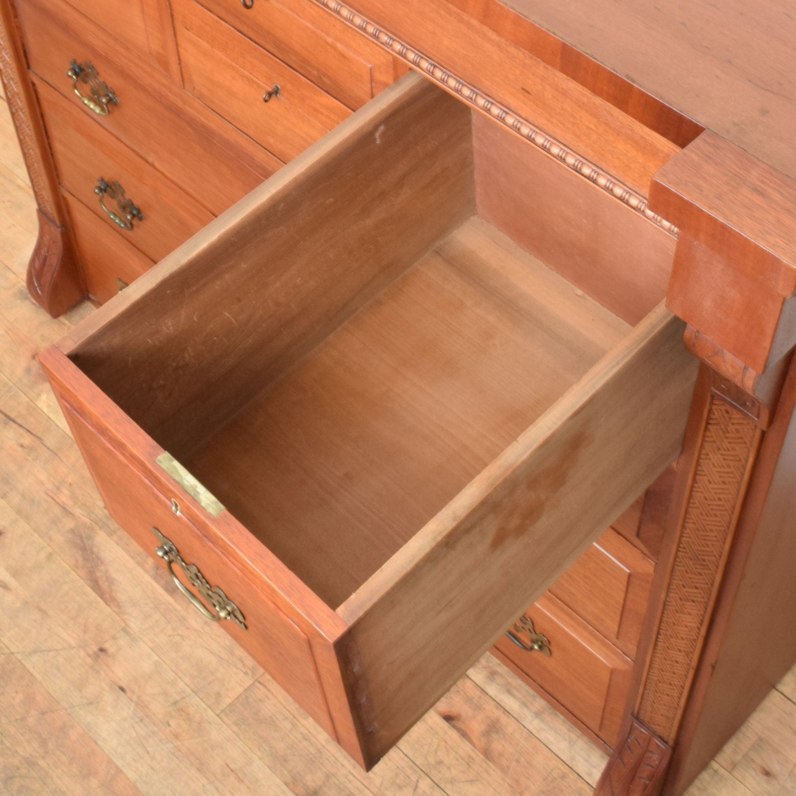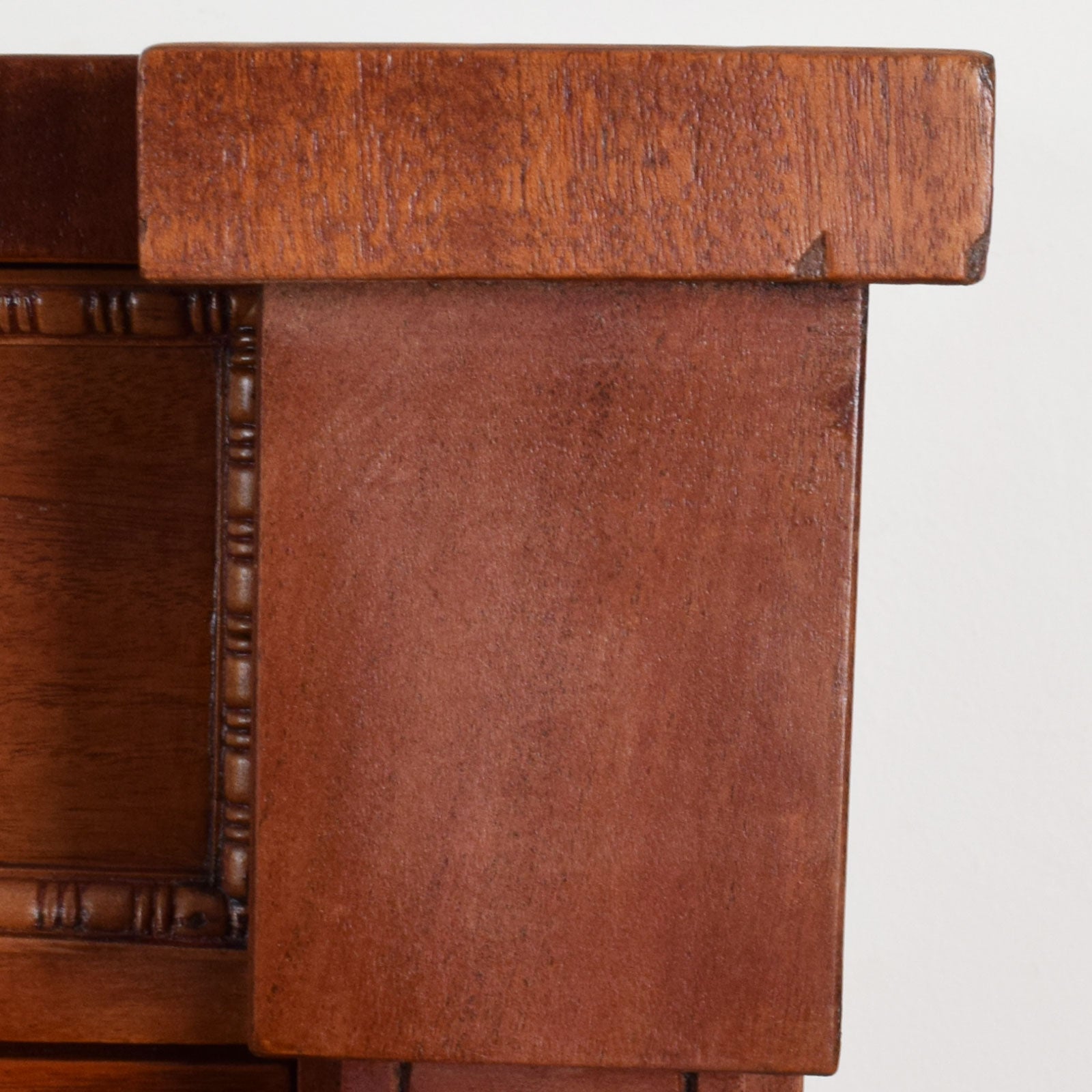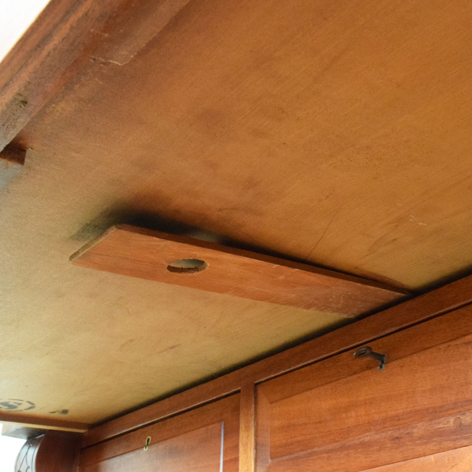 With seven visible drawers and one secret drawer, there is a good amount of storage space for a variety of needs around the home. The mahogany top is the ideal place for showcasing favourite family photographs or a vase of freshly picked seasonal flowers. to access the secret drawer at the top open the middle drawer at the top locate the flat piece of wood above and push up to release the drawer. There are watermarks and veneer damage around the top surface that can be seen in the pictures.