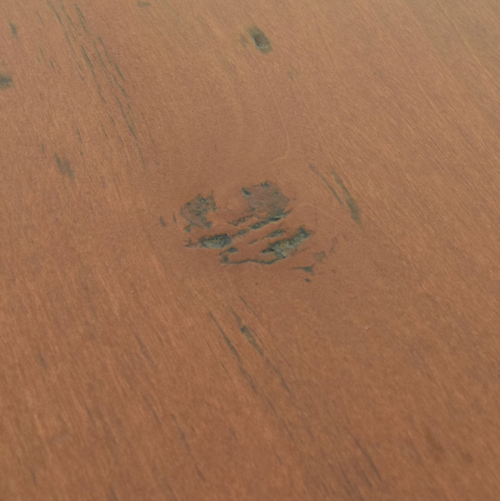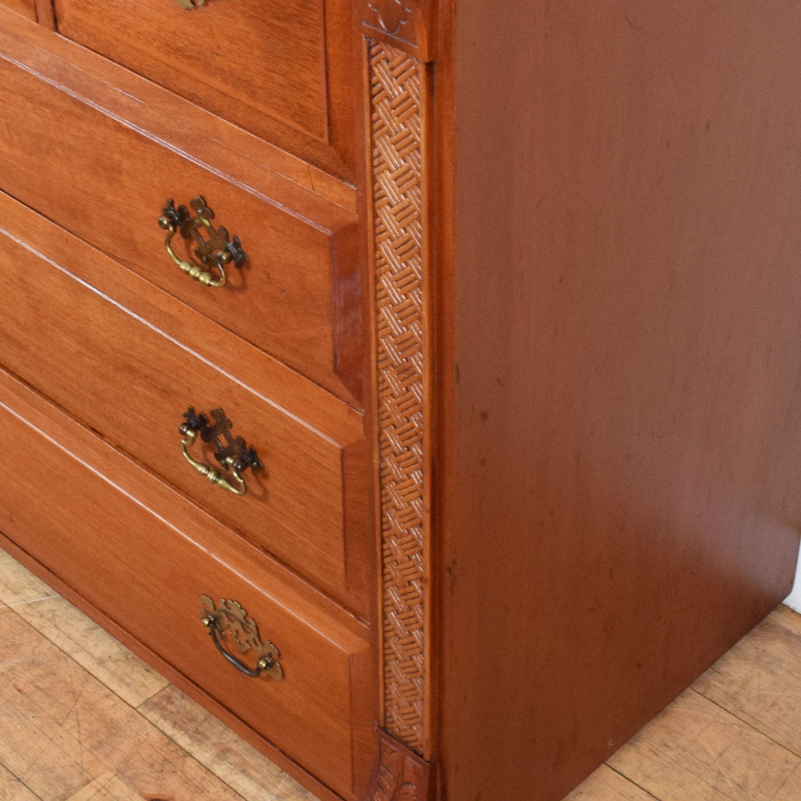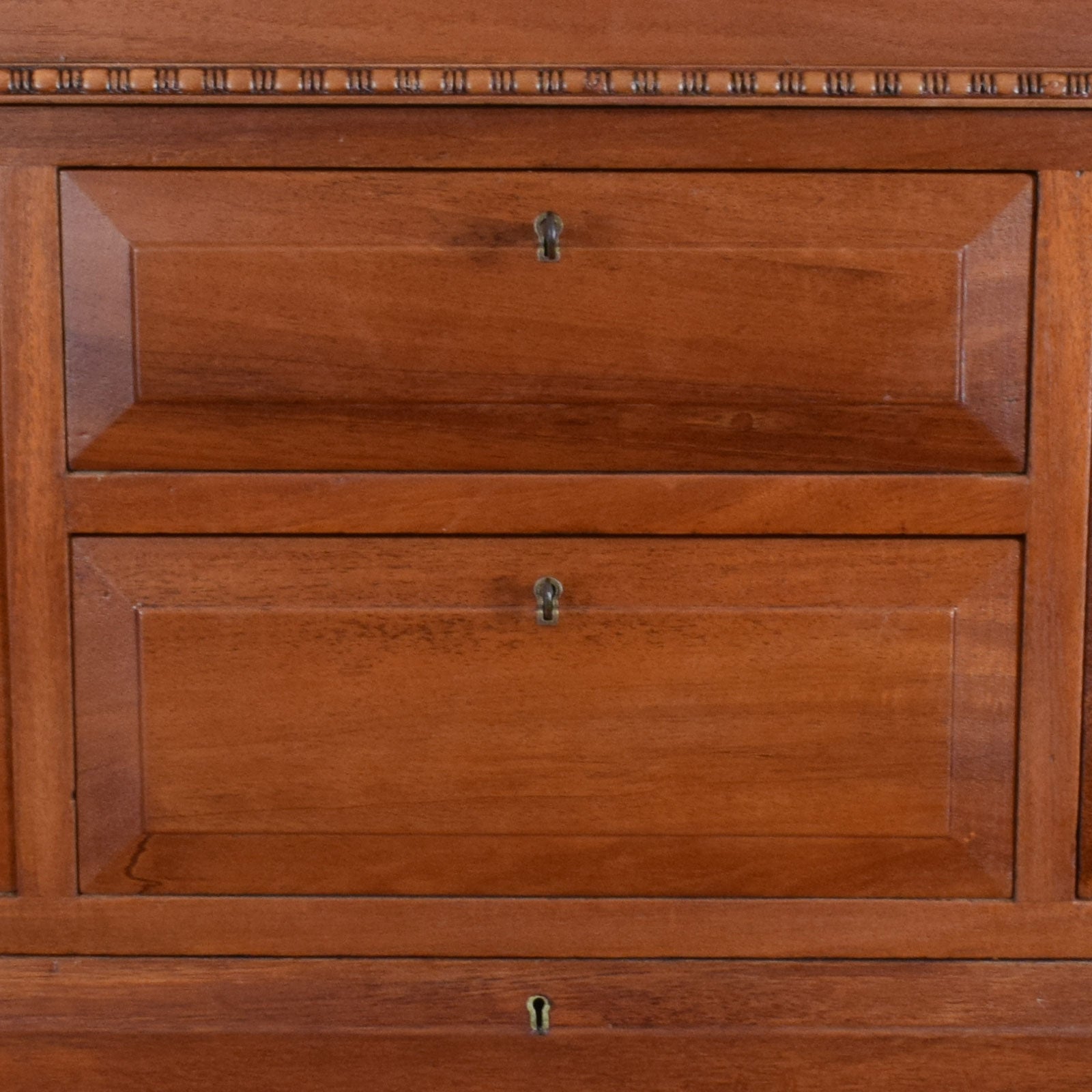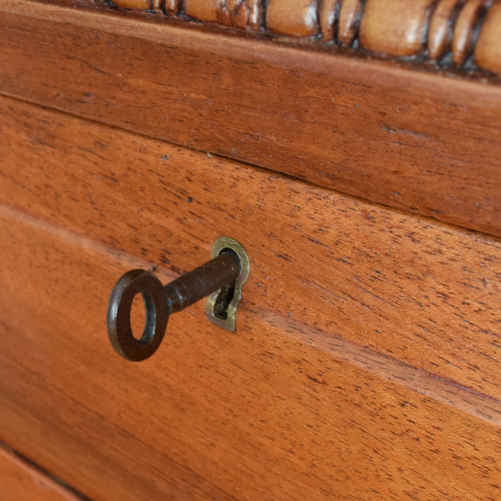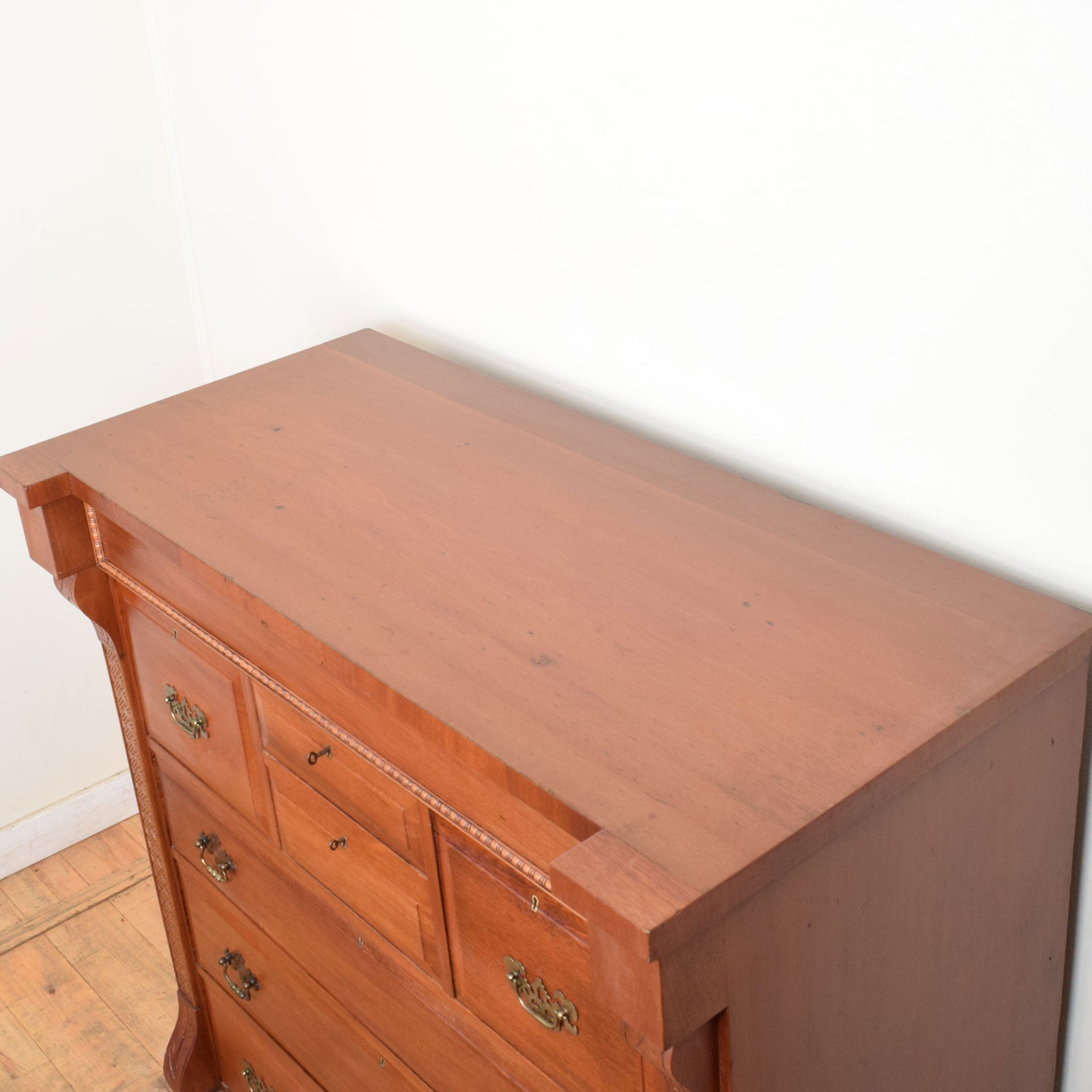 With seven visible drawers and one secret drawer, there is a good amount of storage space for a variety of needs around the home. The mahogany top is the ideal place for showcasing favourite family photographs or a vase of freshly picked seasonal flowers. to access the secret drawer at the top open the middle drawer at the top locate the flat piece of wood above and push up to release the drawer. There are watermarks and veneer damage around the top surface that can be seen in the pictures.