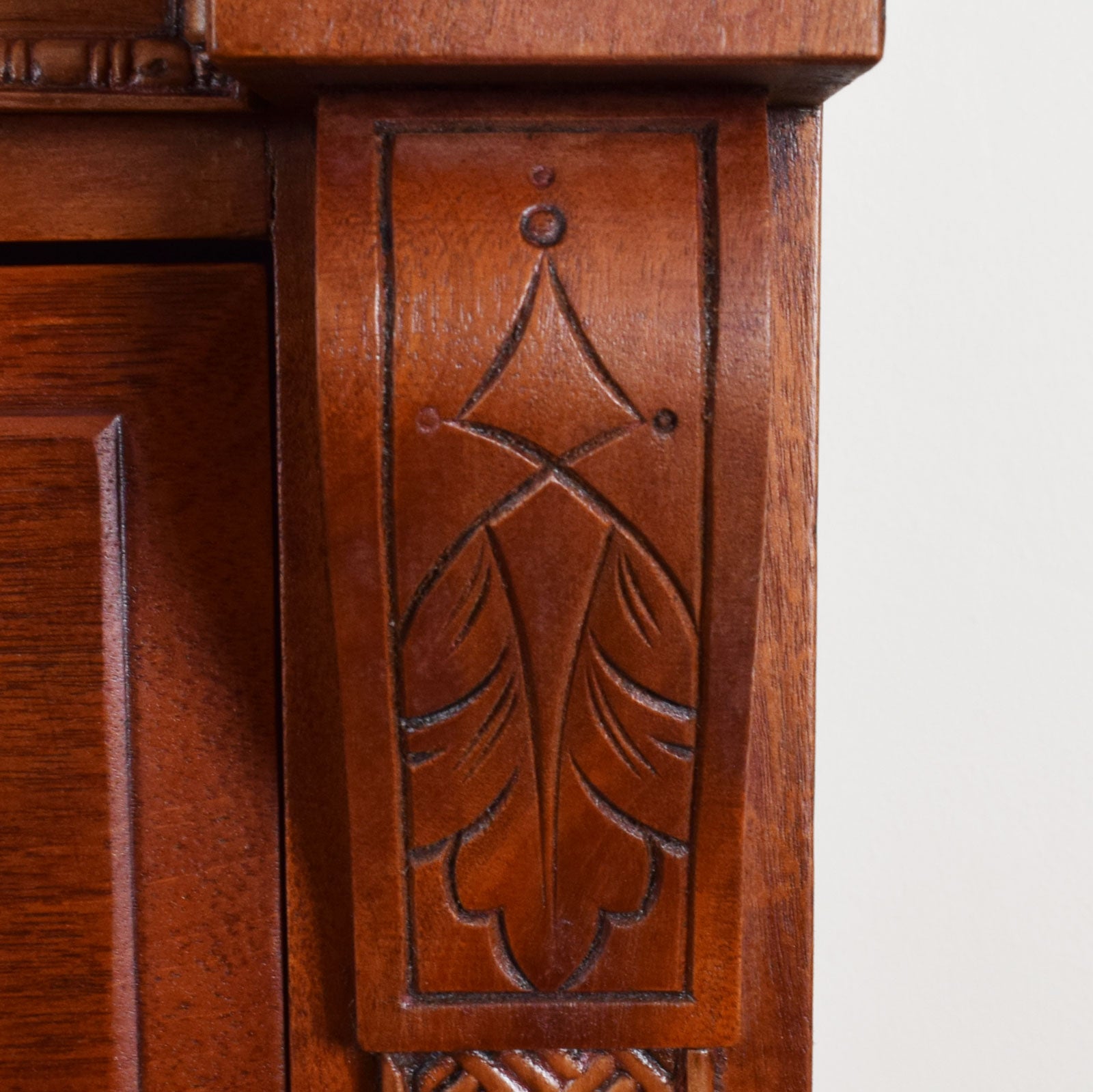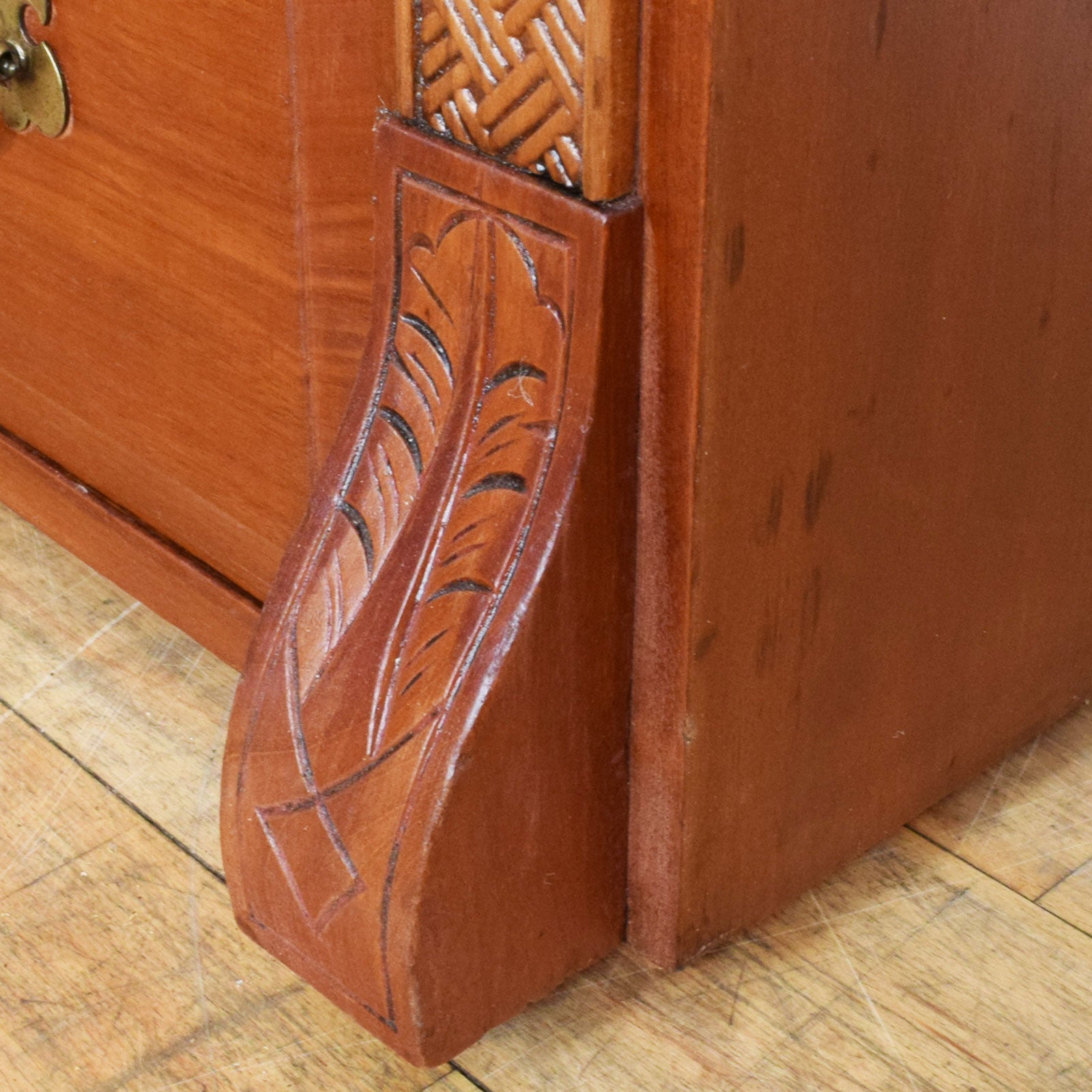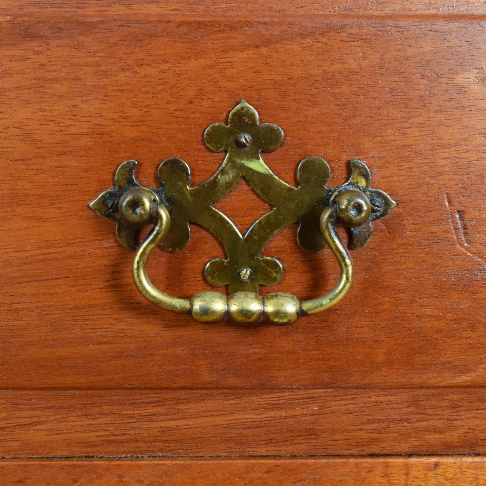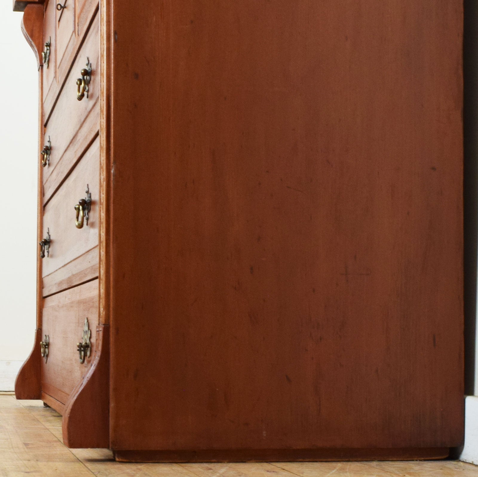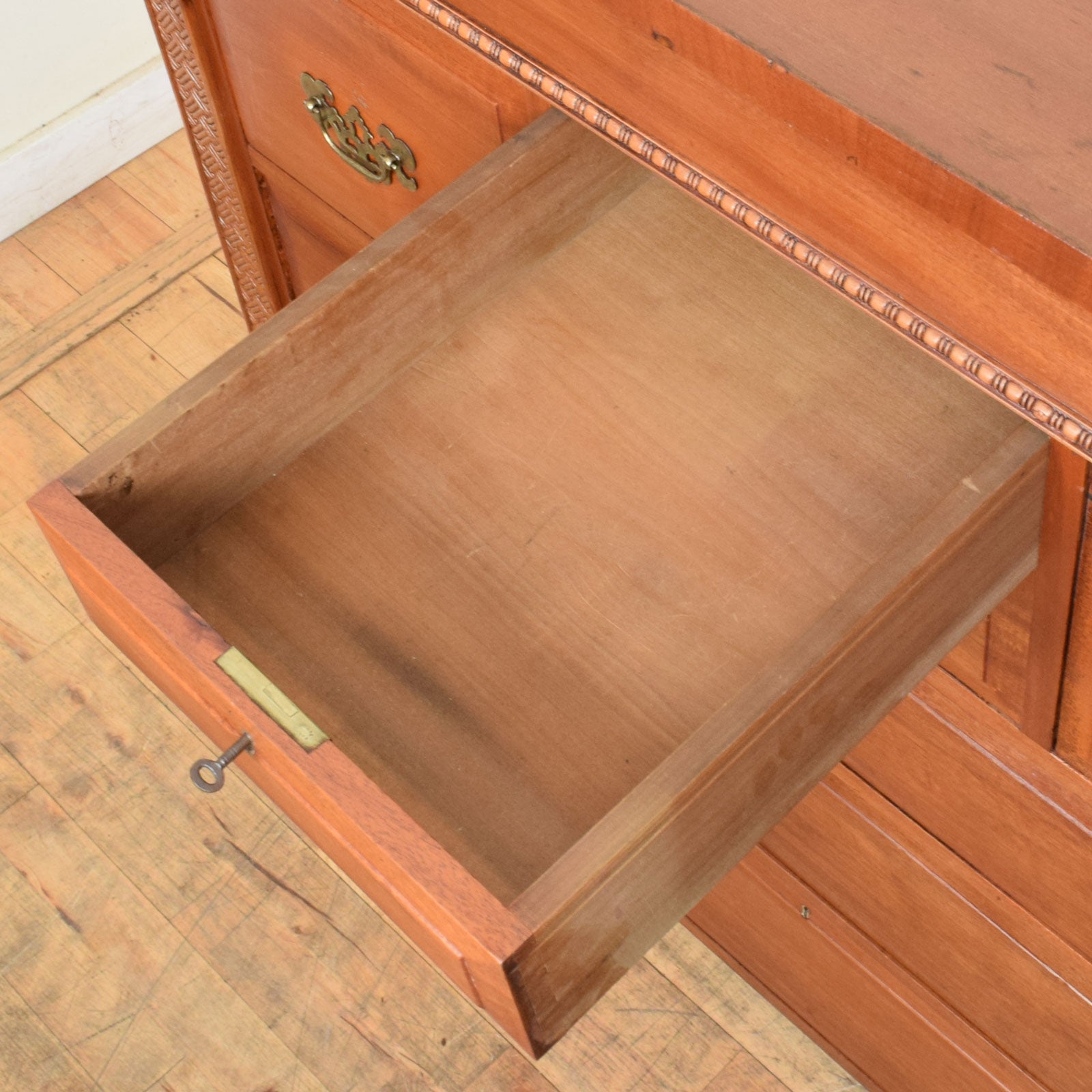 We have lovingly restored this chest of drawers by stripping back the previous darker finish to reveal the natural tones of the mahogany grain and applied a clear matt lacquer giving a hard-wearing and attractive finish. The drawer bases are made from plywood and the thick top and sides are made from compressed wood with high-quality mahogany veneer. The two keys provided, between them, operate the locks on all of the drawers.