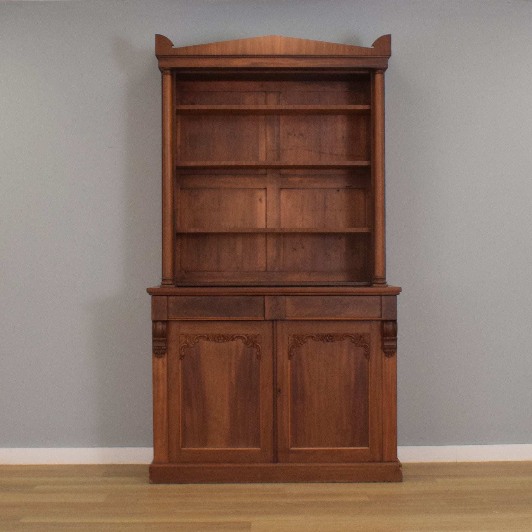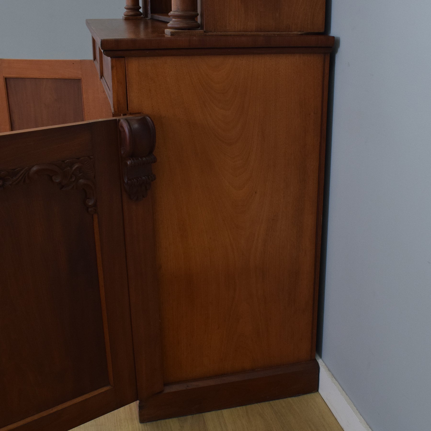 This tall mahogany dresser features three adjustable open shelves above a two-drawer base and double-door cupboard, combining display and storage in one elegant form. Decorative carved floral scrollwork on the lower doors, column-style supports, and a gently arched cornice lend the piece a traditional Georgian-inspired feel. The interior of the base is thoughtfully divided, including a lower drawer fitted with bottle compartments, ideal for drinks storage or repurposing for other uses.