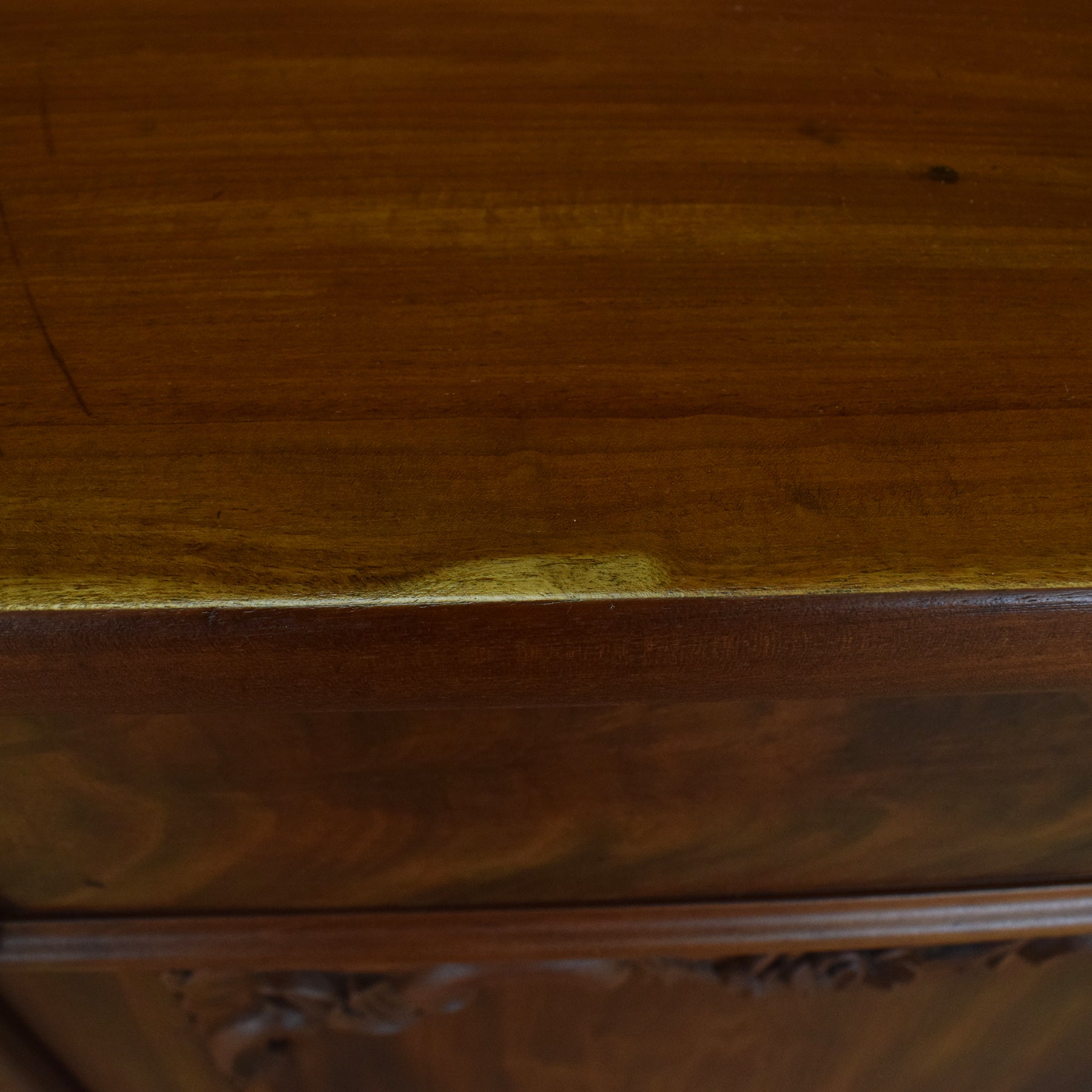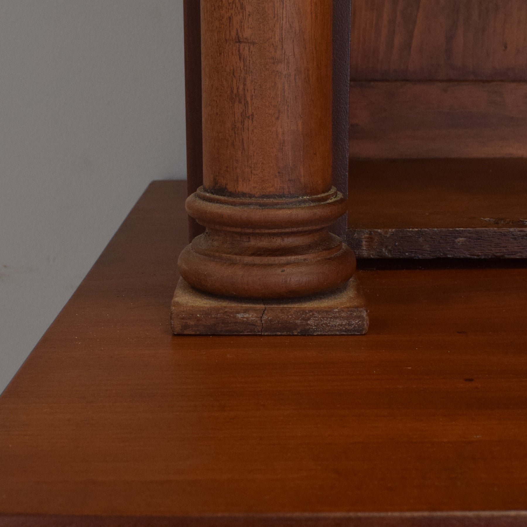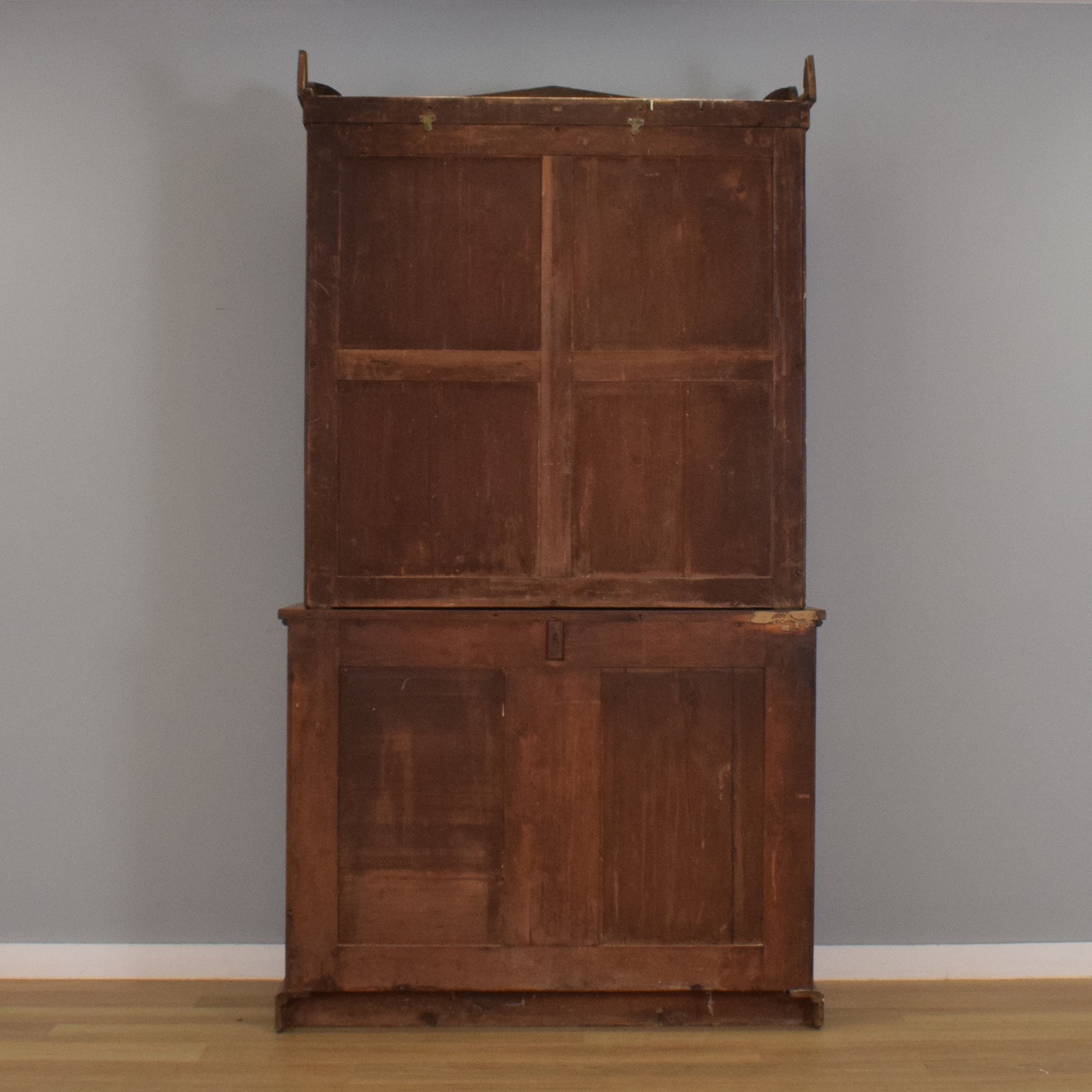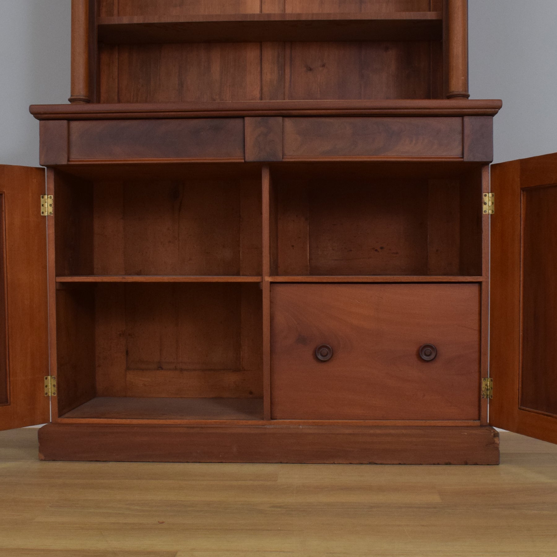 The piece has been stripped and finished with multiple coats of hard-wearing matte lacquer, which enhances the natural colour and grain of the mahogany while providing a durable finish. It originally had glass doors to the top section, which have been removed, and the bracket holes on the surface of the base have been neatly filled. There is a small area of damage to the bottom right-hand corner of the plinth. This item is made mostly from mahogany, with pine used for the drawer bases and back.
