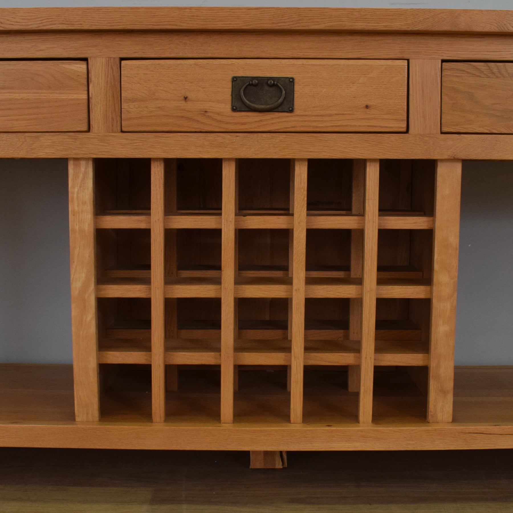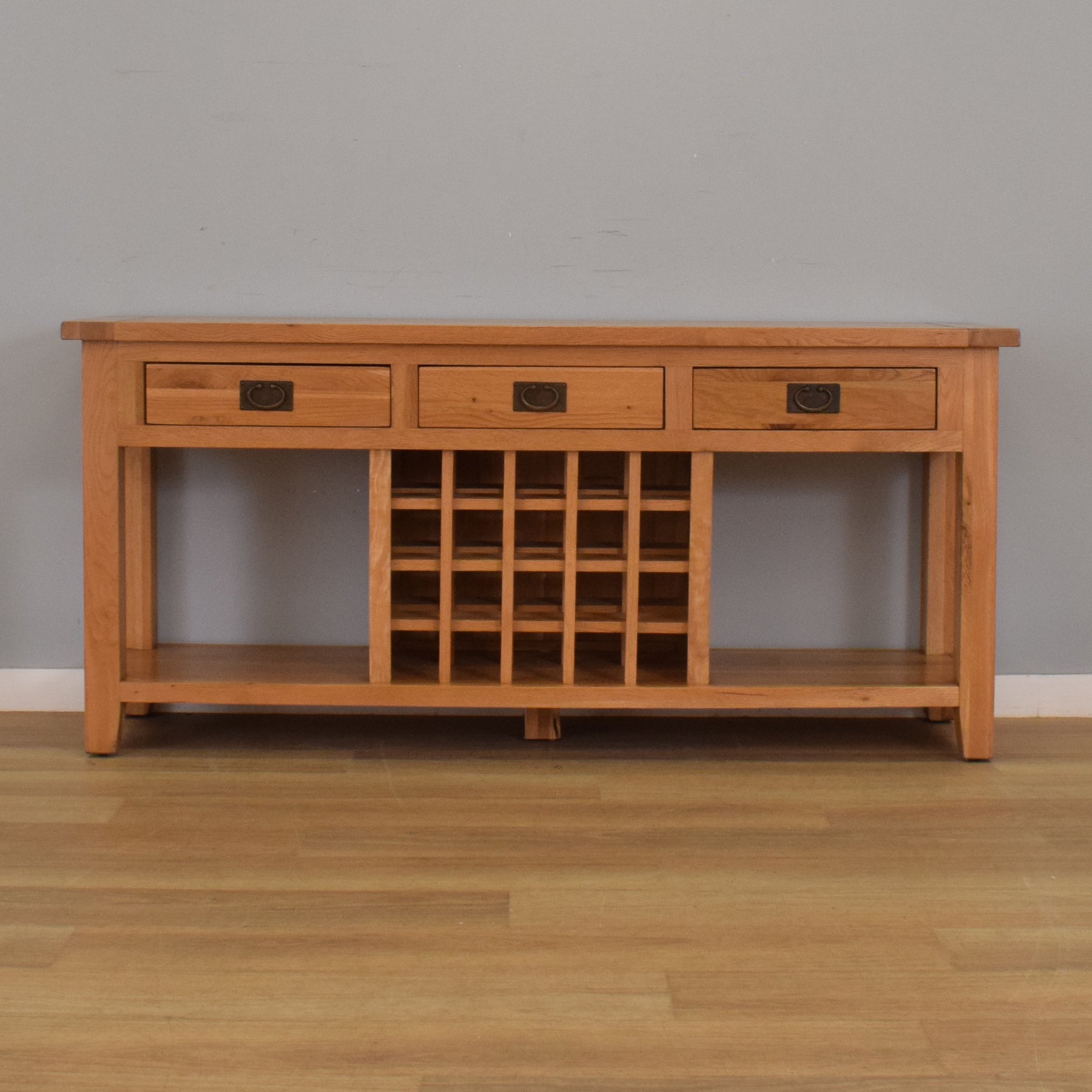 This generously proportioned sideboard features three upper drawers for storing cutlery, linens, or other essentials, while the lower section includes open shelving and a central wine rack with capacity for up to 20 bottles. The warm tones of the solid oak are beautifully complemented by traditional antique-style drop handles, adding a subtle touch of vintage character. Its sturdy construction and clean lines allow it to blend well with both classic and contemporary interiors.