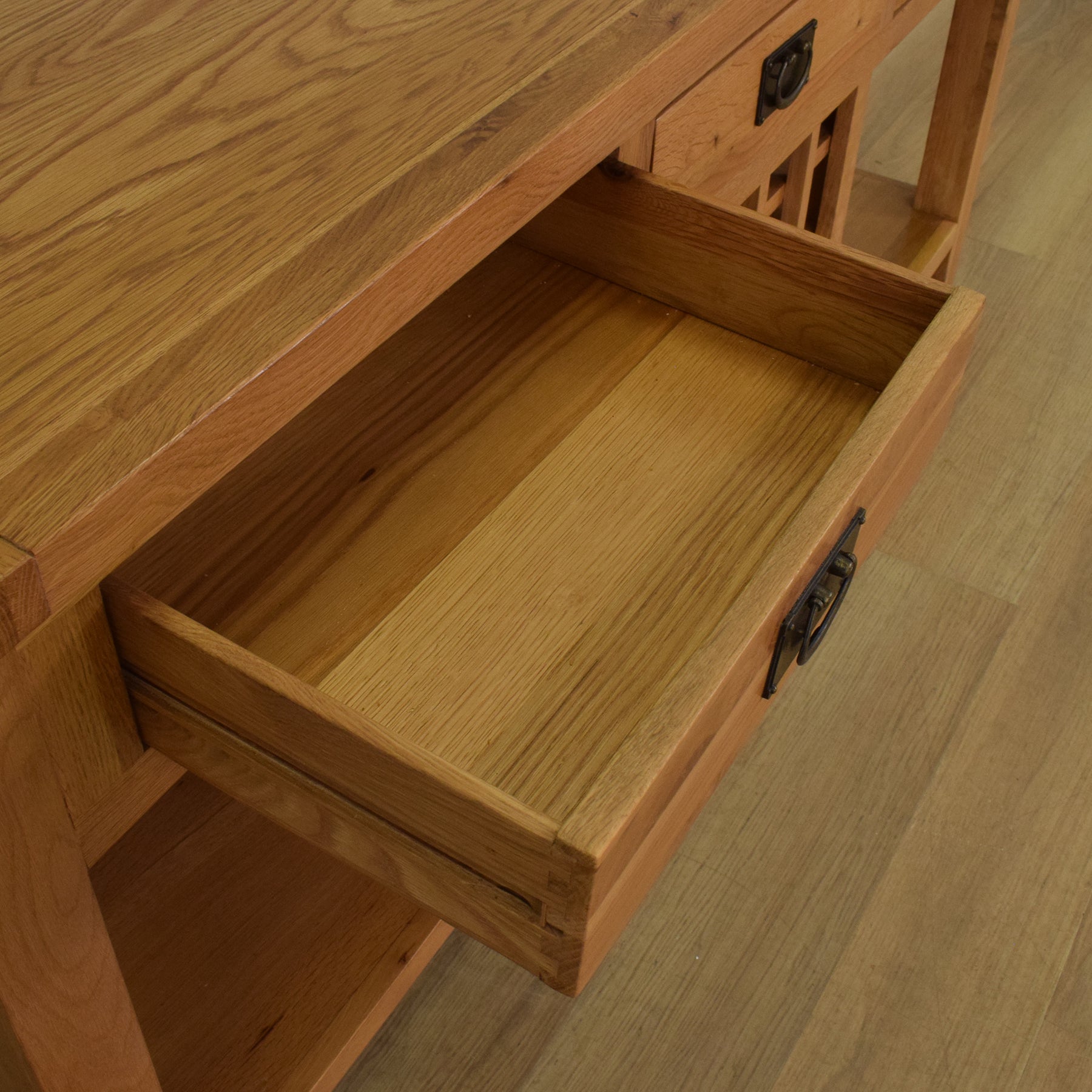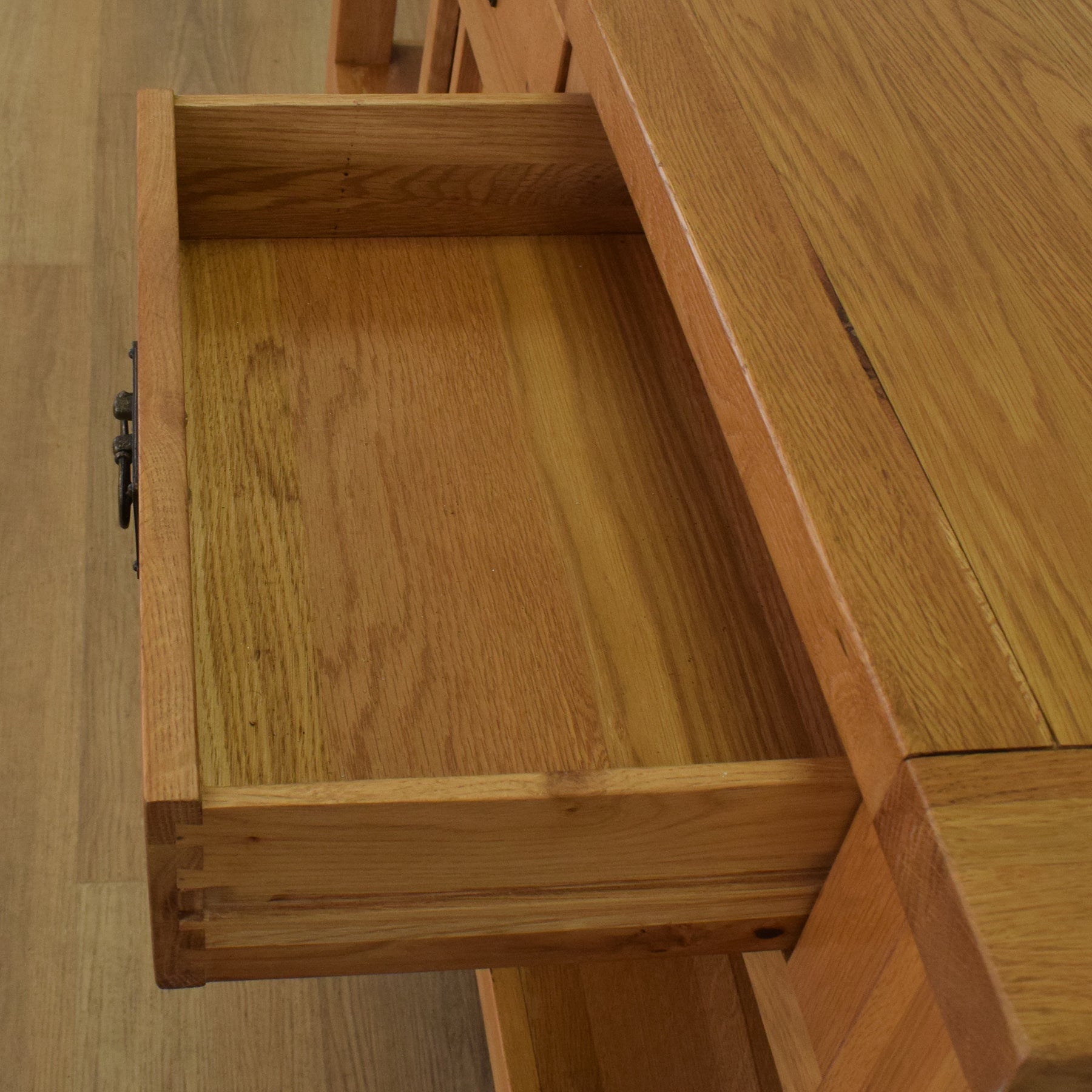 The item has been thoroughly cleaned and finished with a wax-based polish, which enhances the natural warmth and richness of the oak while offering added protection to the wood’s surface. This item is made entirely from solid oak.