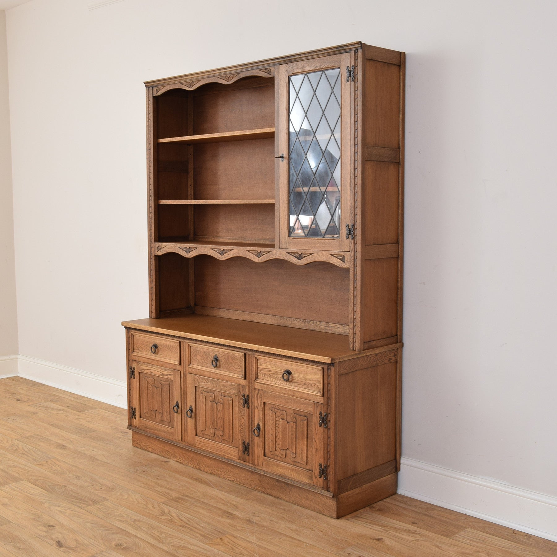 This oak dresser brings a sense of warmth and practicality to a dining room, kitchen, or living space, offering generous storage while also providing an attractive focal point. Its balanced proportions and traditional detailing help create an inviting room that feels organised without appearing overly formal.