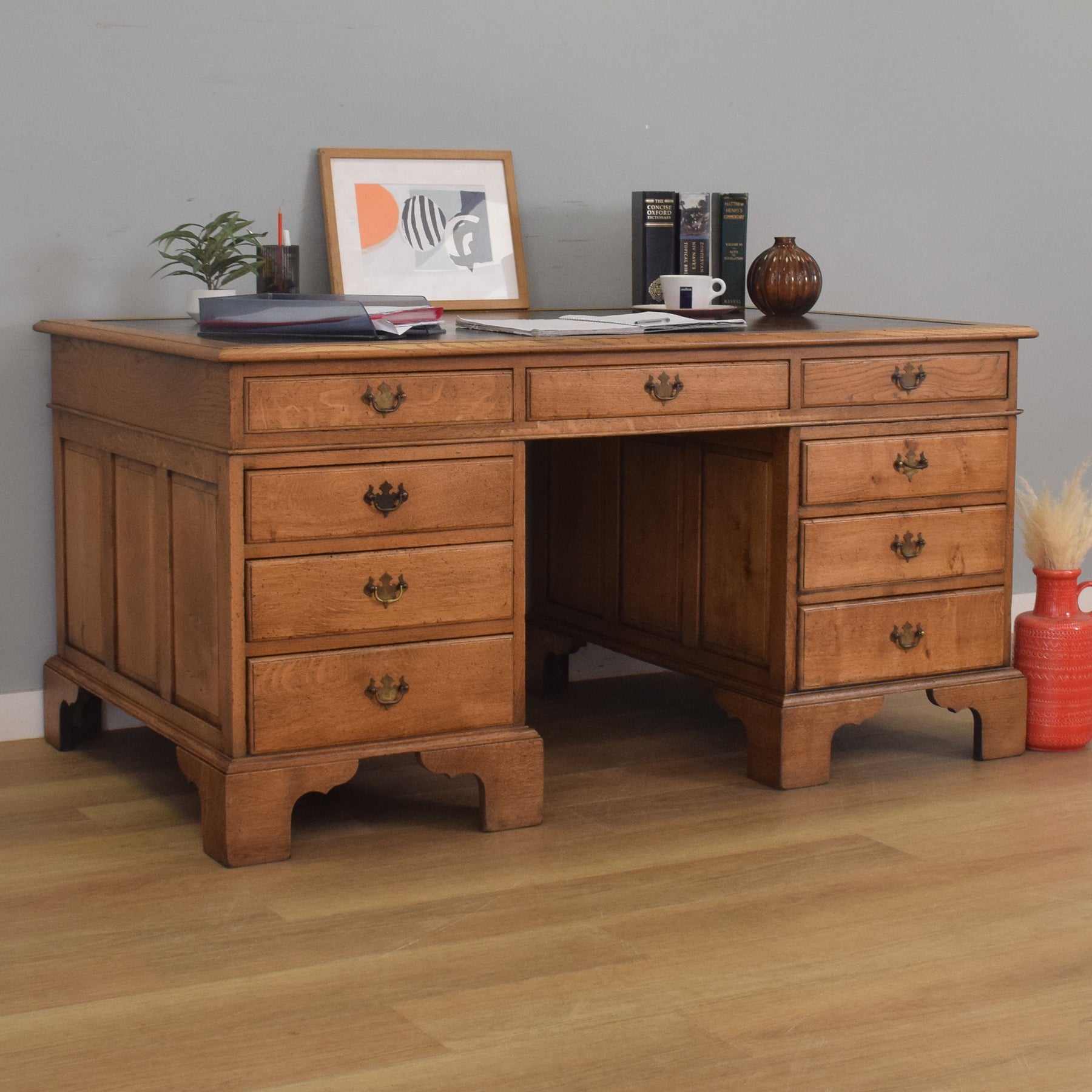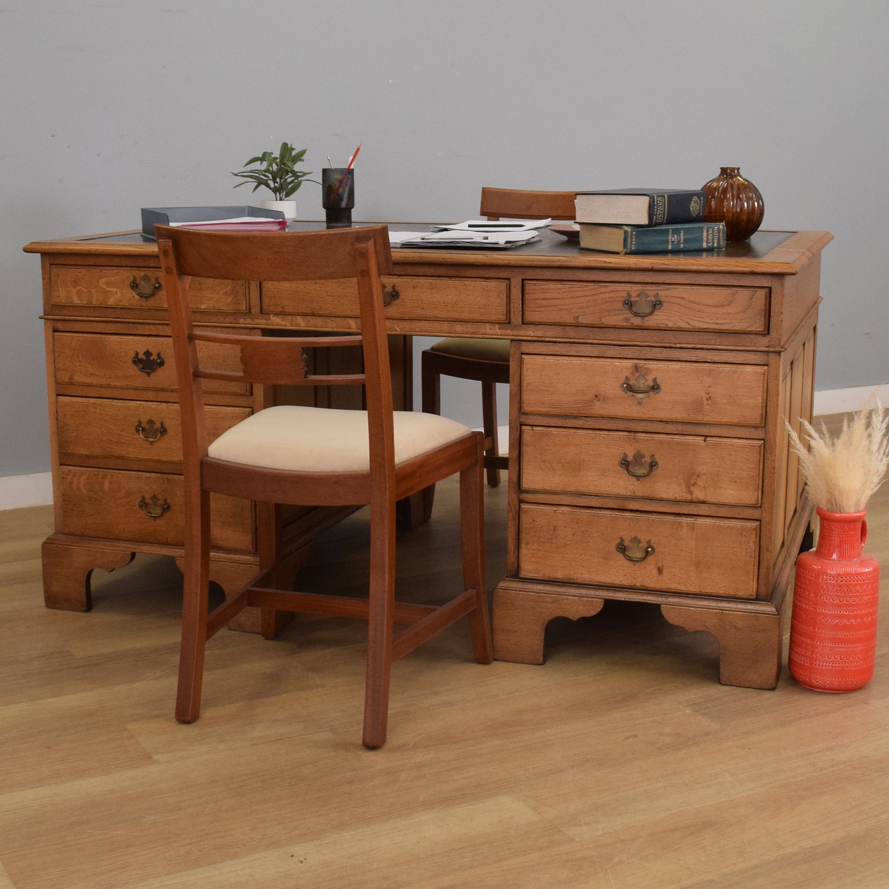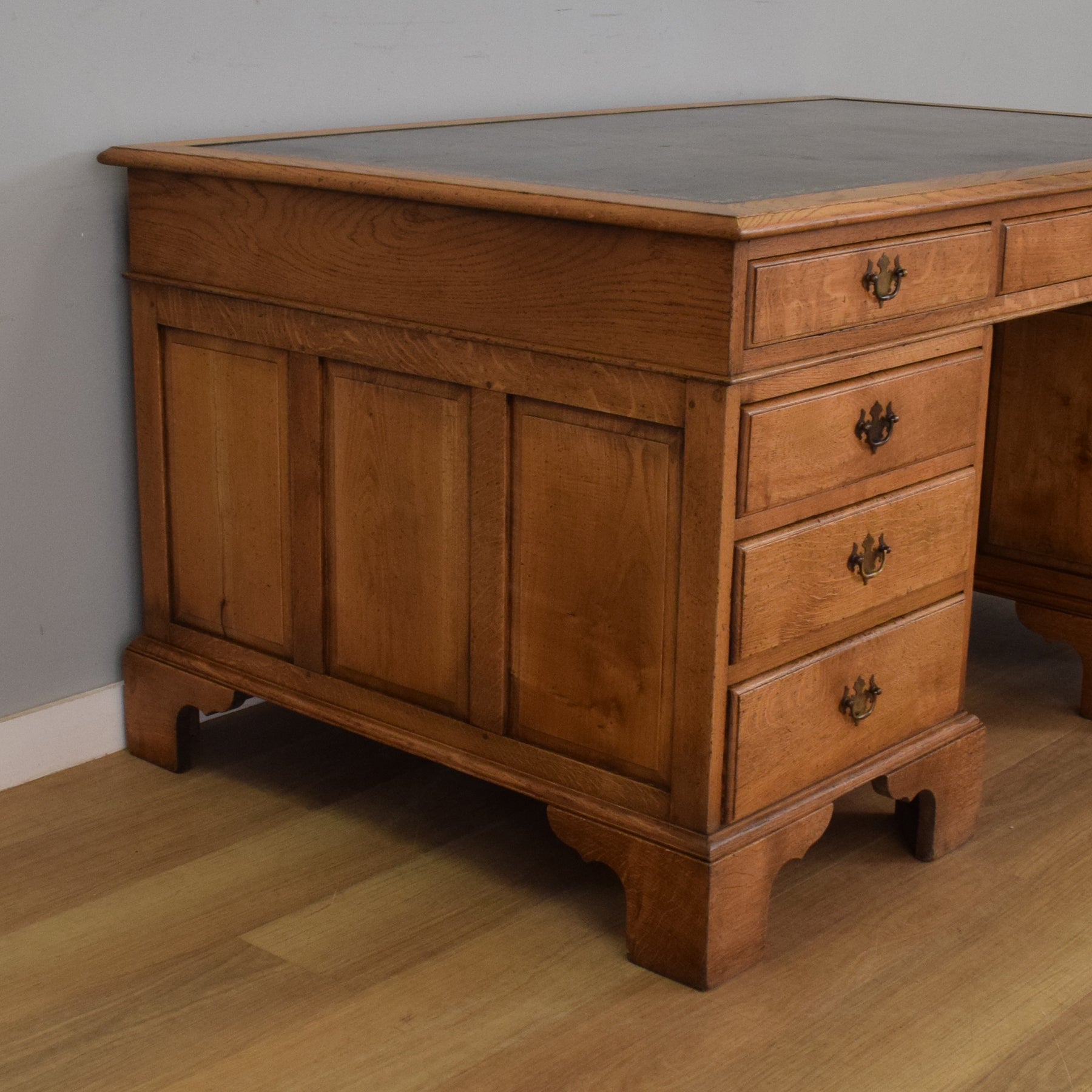 This substantial oak partners desk features nine drawers on each side, providing a total of eighteen, offering ample storage for documents, stationery, and accessories. Each drawer is fitted with traditional brass-style swan-neck handles, and the desk is finished with a deep green leather writing surface inset with gold tooling. The paneled sides and bracket feet give it a refined, balanced appearance from every angle. With matching drawer and cupboard arrangements on both sides, it’s fully functional and elegant no matter how it is placed in a room.