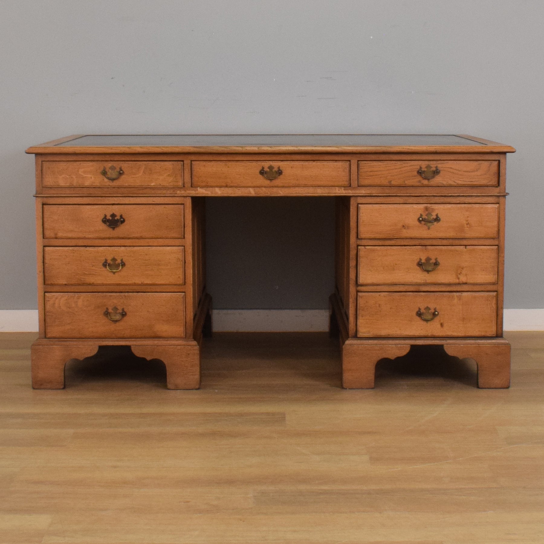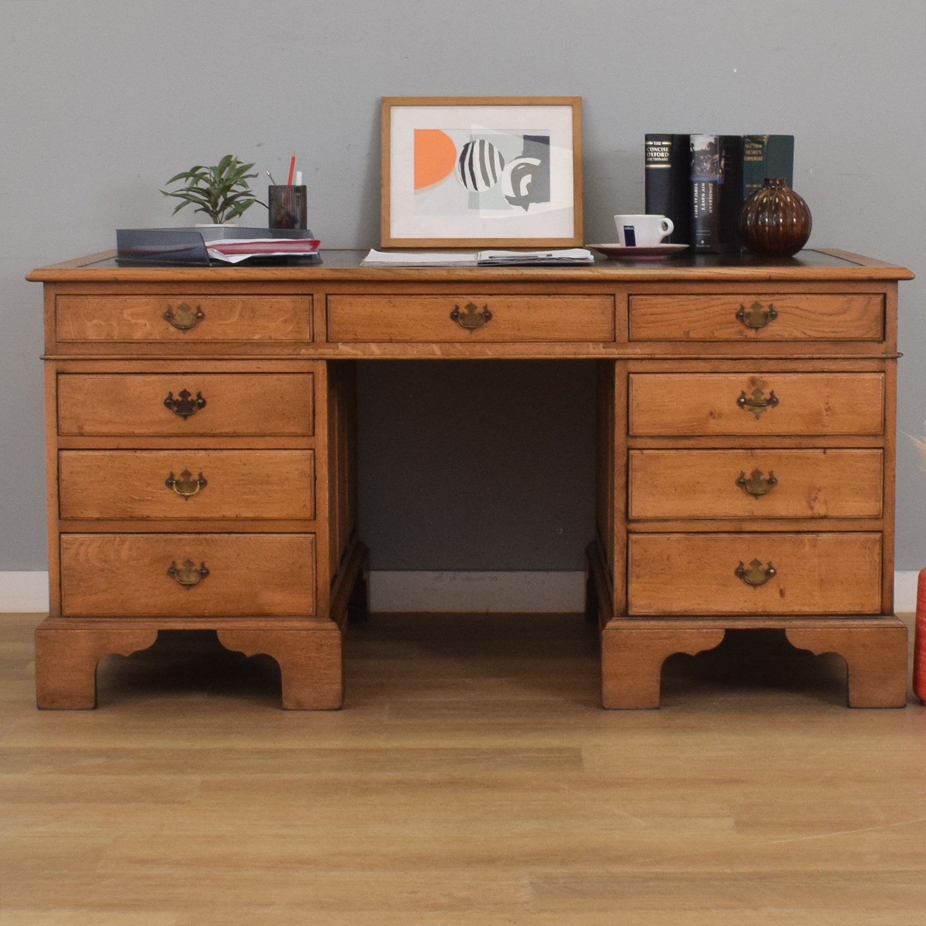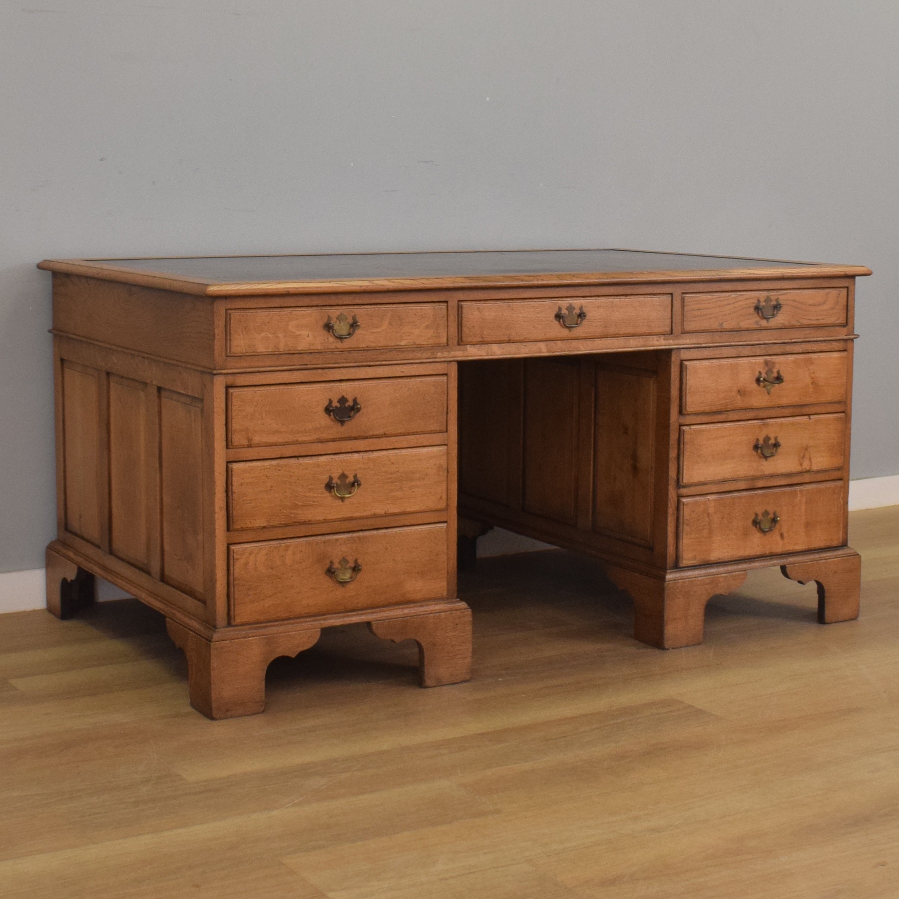 This substantial oak partners desk features nine drawers on each side, providing a total of eighteen, offering ample storage for documents, stationery, and accessories. Each drawer is fitted with traditional brass-style swan-neck handles, and the desk is finished with a deep green leather writing surface inset with gold tooling. The paneled sides and bracket feet give it a refined, balanced appearance from every angle. With matching drawer and cupboard arrangements on both sides, it’s fully functional and elegant no matter how it is placed in a room.