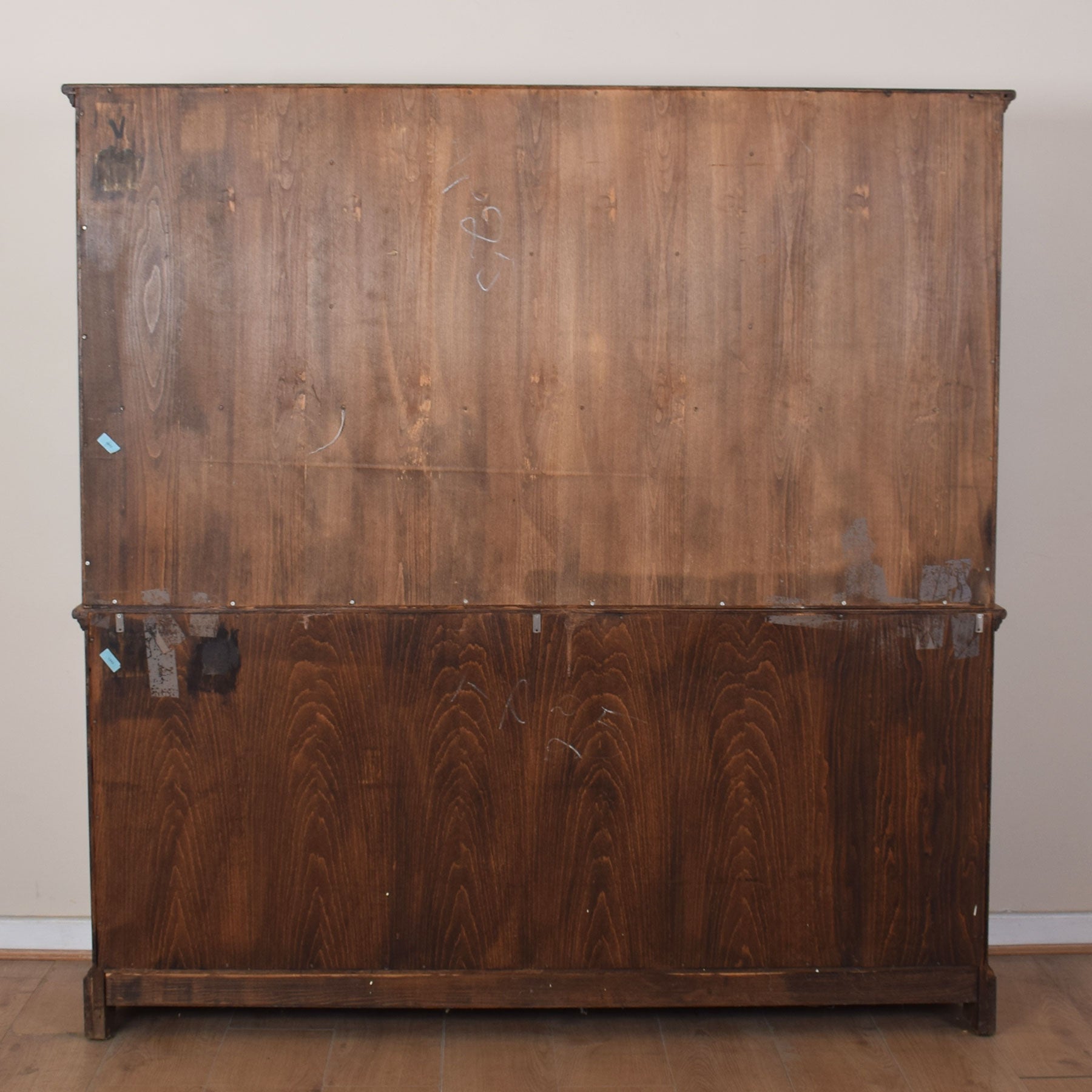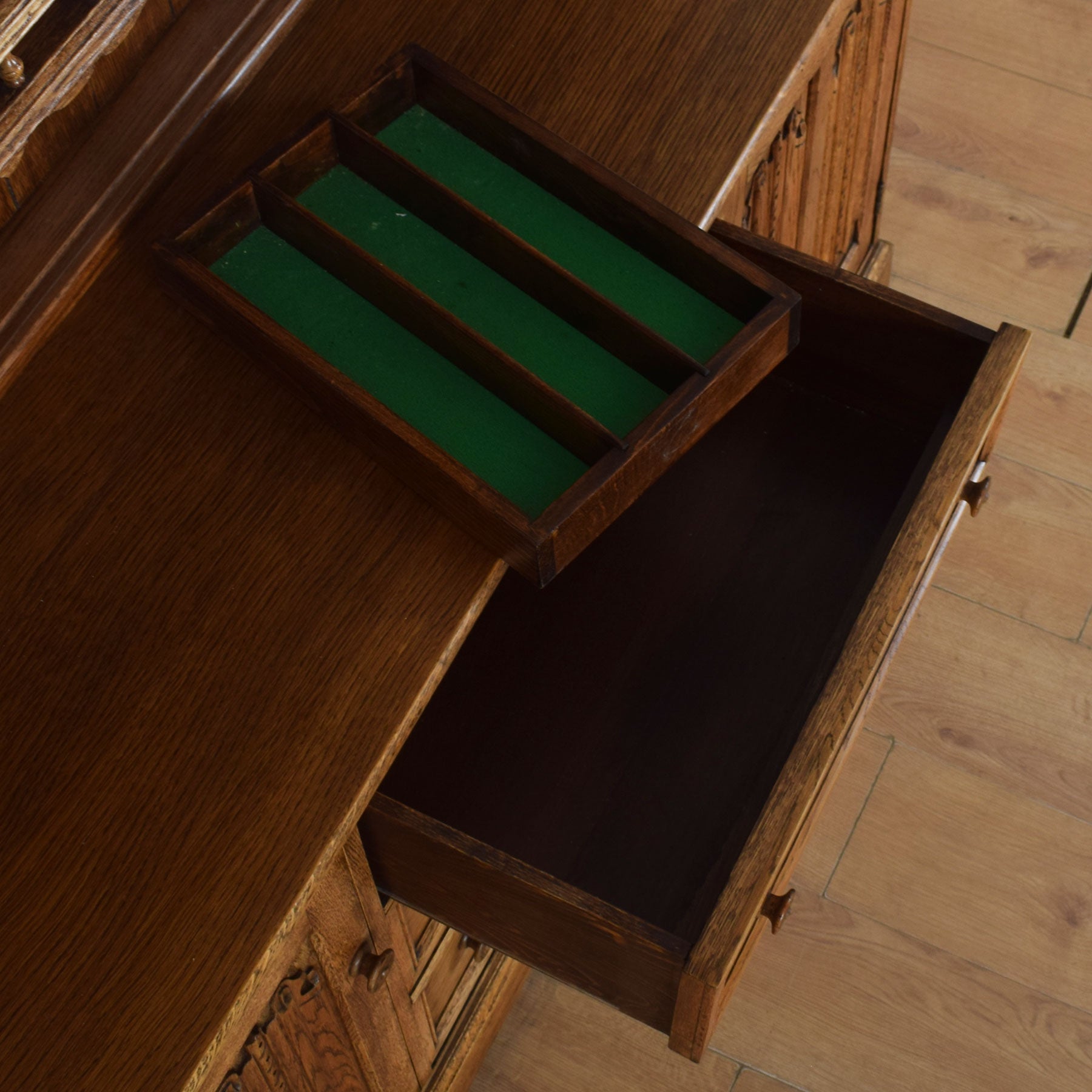The lower section features a beautifully oak-grained top surface that has ample space for a vase of fresh flowers or a fruit bowl along with other treasured ornaments. Below are three generously deep central drawers, the top one of which includes a removable velvet-lined cutlery tray. On each side is a double-door cupboard with a single fixed shelf. Made largely of oak this piece has some oak veneered panels and plywood back and drawer sections.