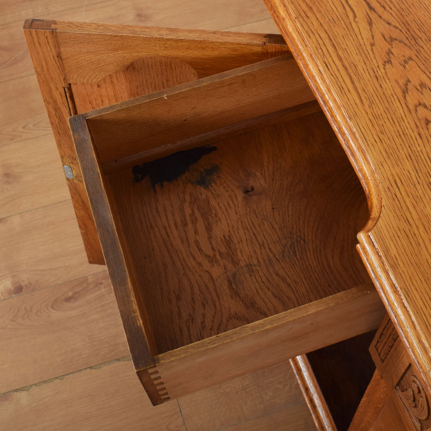 The beautifully oak-grained and shaped top surface has ample space for a vase of fresh flowers or a fruit bowl, along with a lamp and treasured ornaments and photographs. Below in the centre are three usefully deep drawers, while on each side there is a single-door cupboard with a fixed shelf and an internal drawer. This quality-made sideboard is a mix of solid oak with oak-veneered panels and some plywood rear panels and internal sections.
